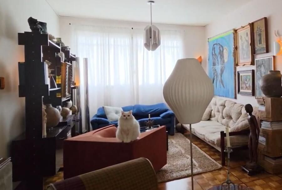 O garimpo de mobiliário é parte fundamental do apê: foram meses de procura, restauração e escolhas feitas com calma. E o mais bonito é ver o carinho com que Dani e Derek narram a trajetória de cada peça. Há uma estante maravilhosa onde eles praticamente nos conduzem por uma linha do tempo pessoal, contando a história por trás de cada objeto. É muita informação e, ao mesmo tempo, tudo faz sentido. É uma casa que foi construída aos poucos, com intenção, algo que hoje em dia é muito precioso.