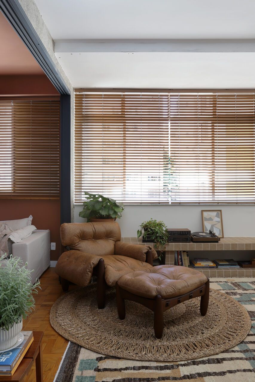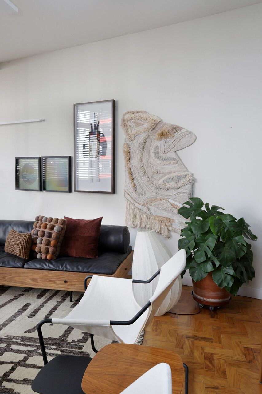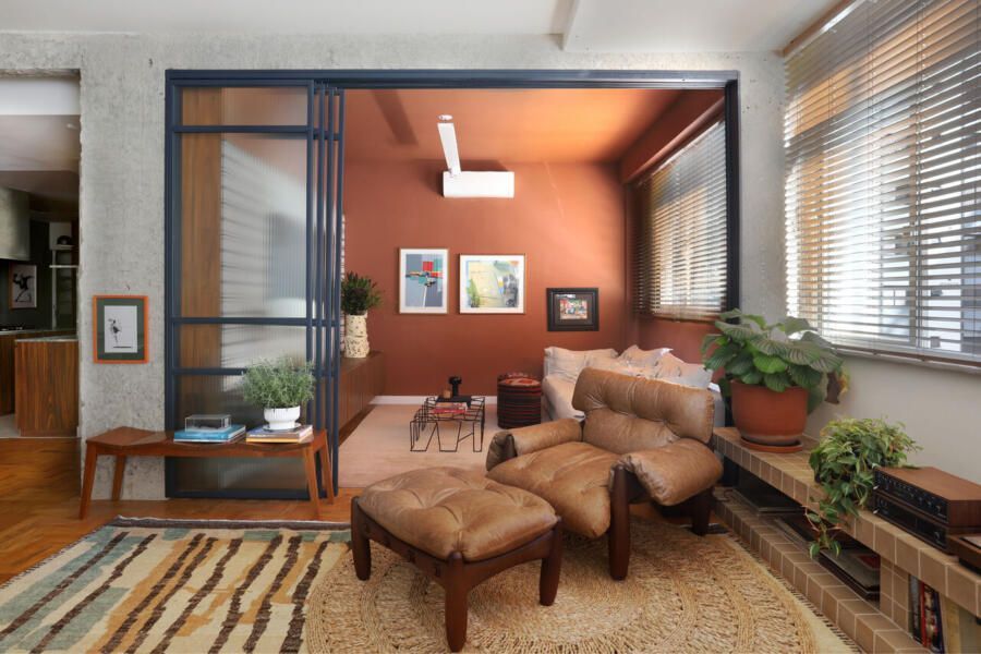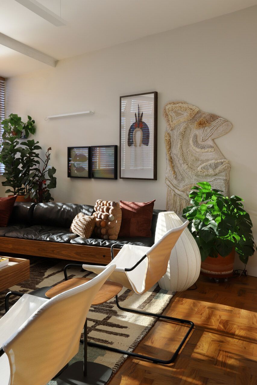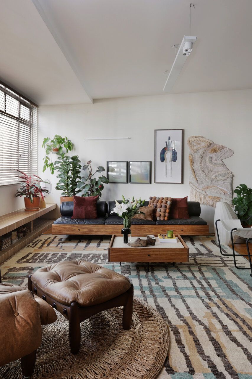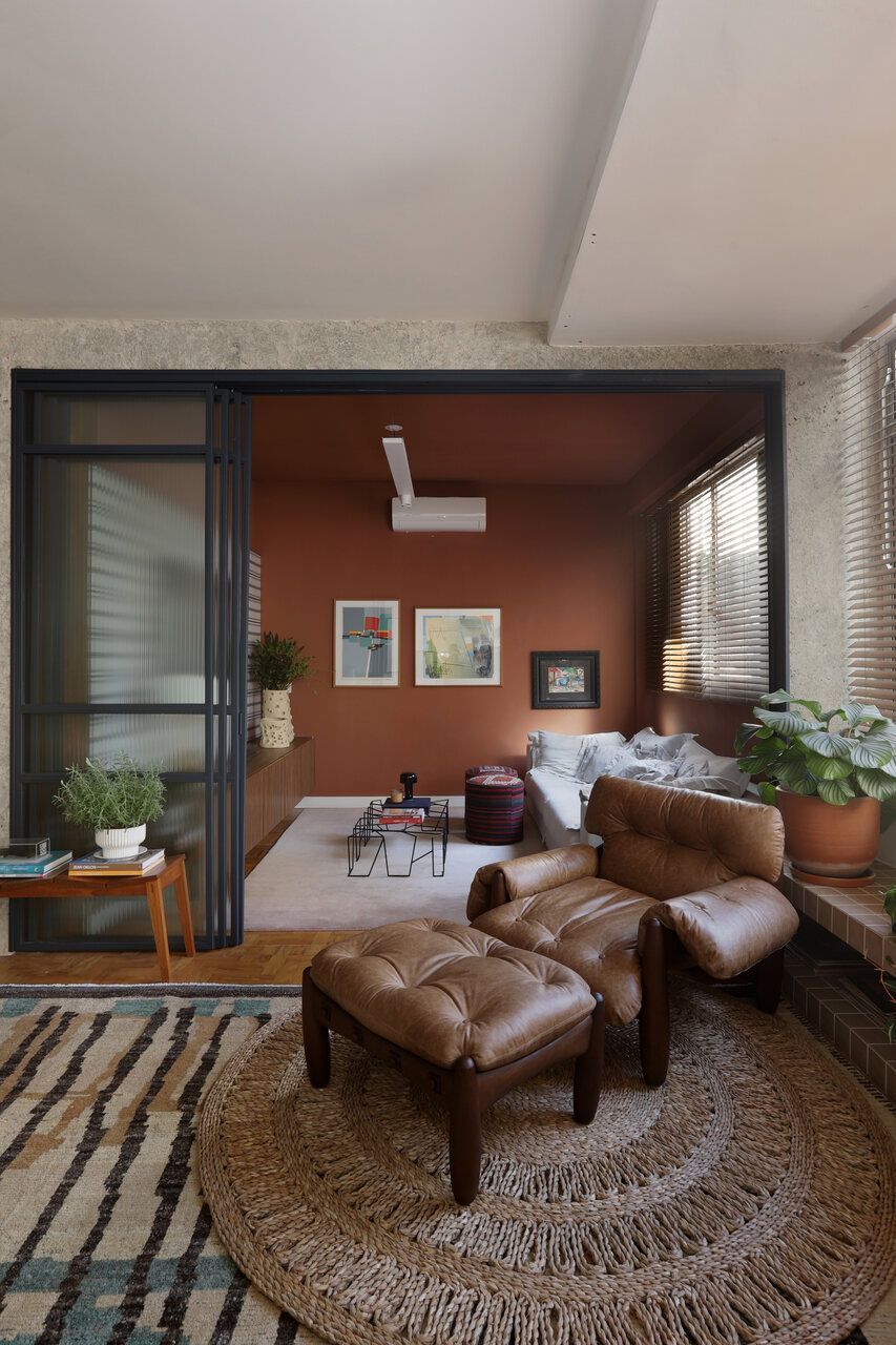 Uma coisa que achei interessante é que não houve nenhuma obra estrutural na casa. Toda a transformação aconteceu com pintura, escolha de móveis e uma curadoria muito cuidadosa de peças. Segundo Kika, a inspiração veio da própria energia da família, que ela descreve como solar. Por isso os tons terrosos aparecem bastante, trazendo uma sensação de acolhimento.