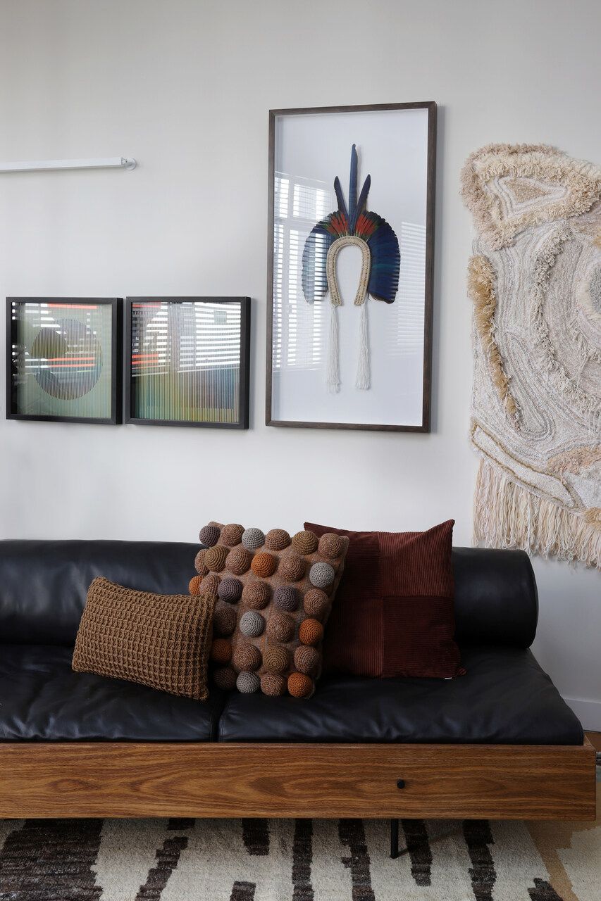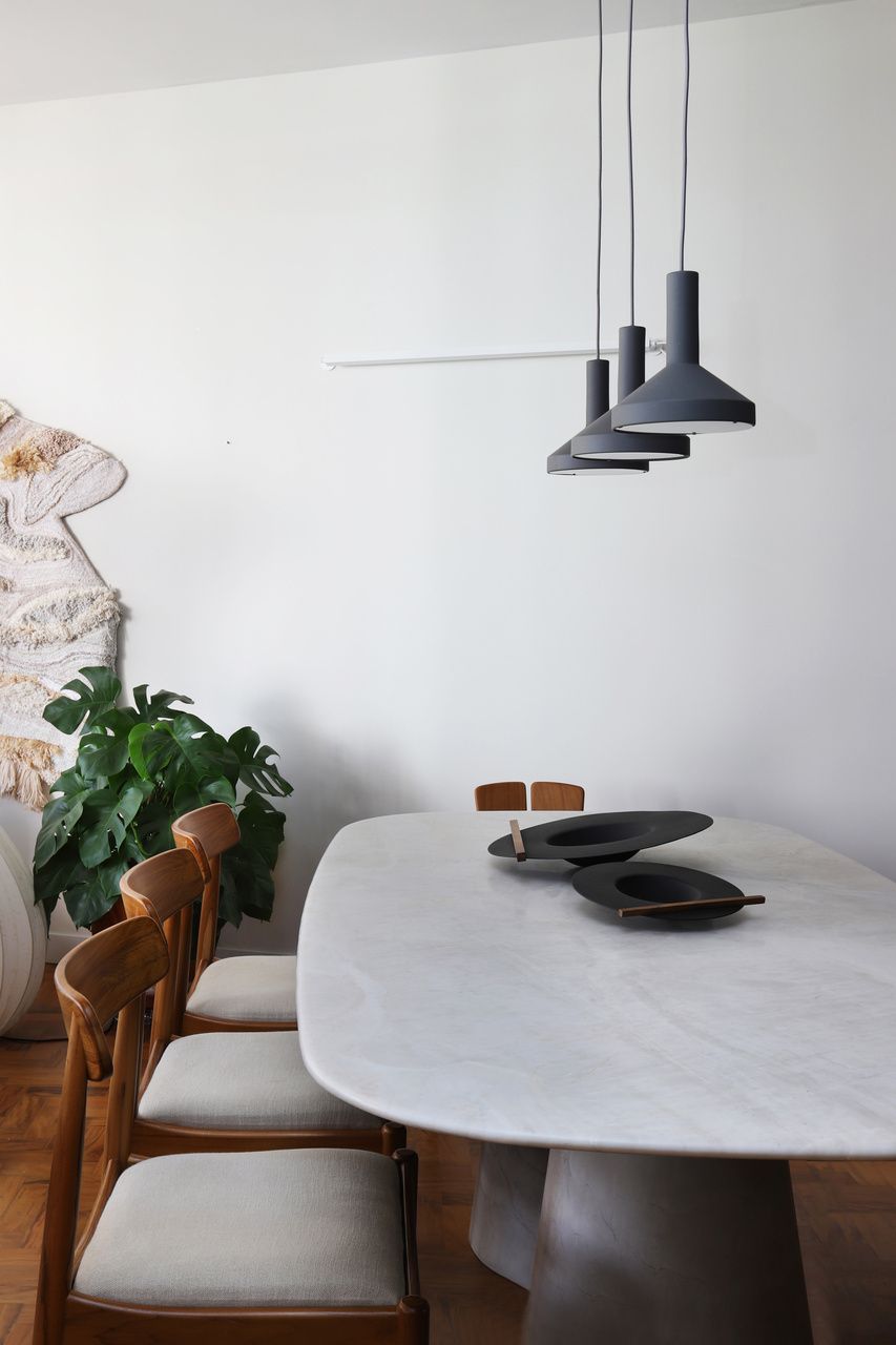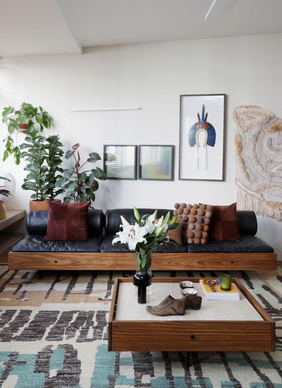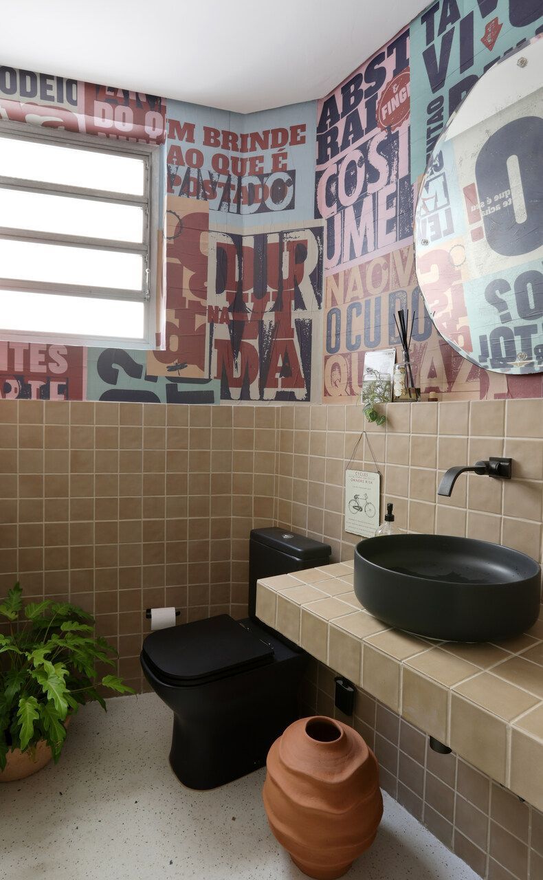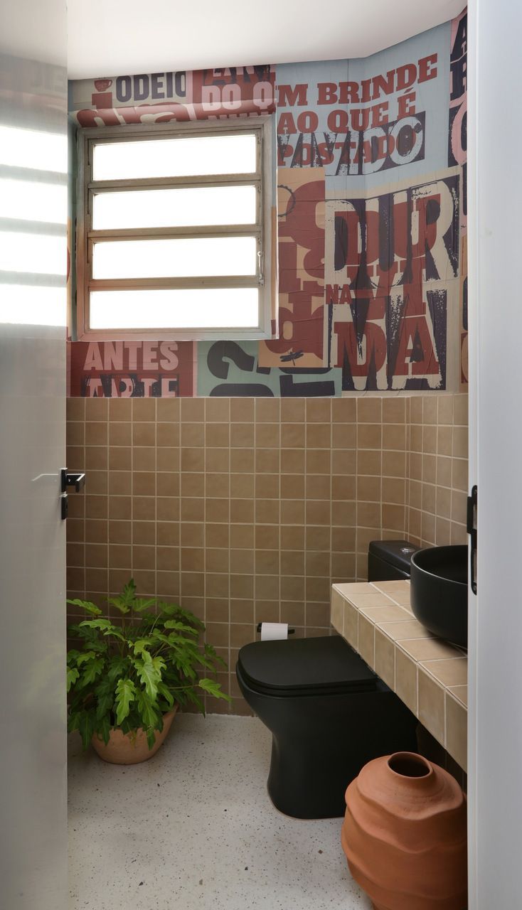 Uma coisa que achei interessante é que não houve nenhuma obra estrutural na casa. Toda a transformação aconteceu com pintura, escolha de móveis e uma curadoria muito cuidadosa de peças. Segundo Kika, a inspiração veio da própria energia da família, que ela descreve como solar. Por isso os tons terrosos aparecem bastante, trazendo uma sensação de acolhimento.