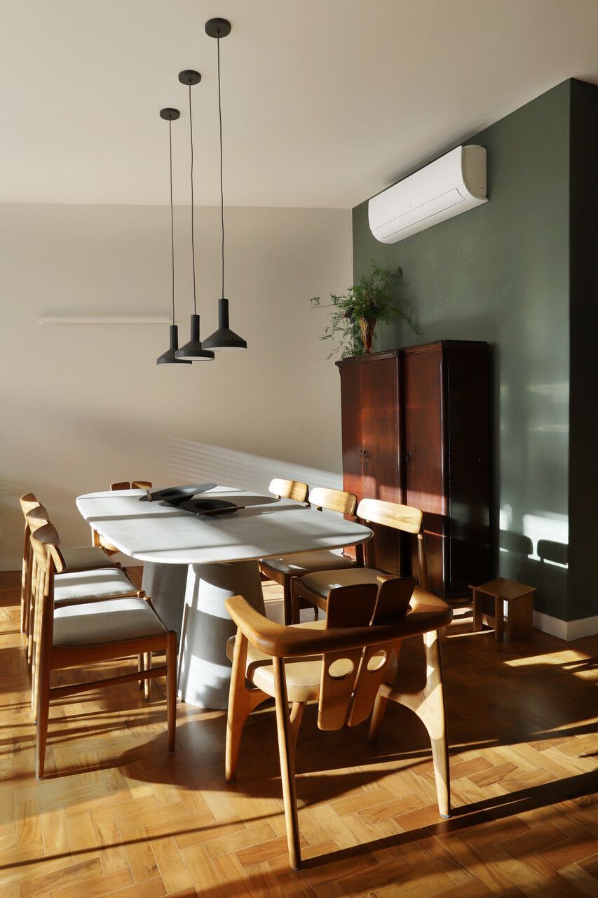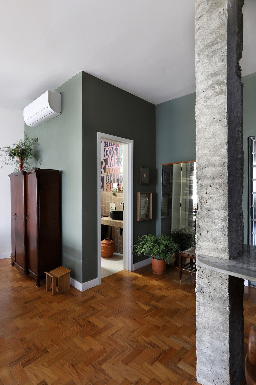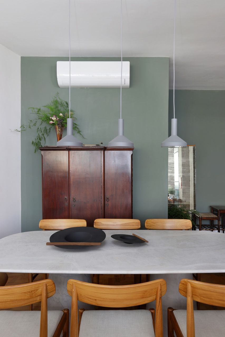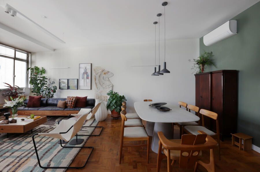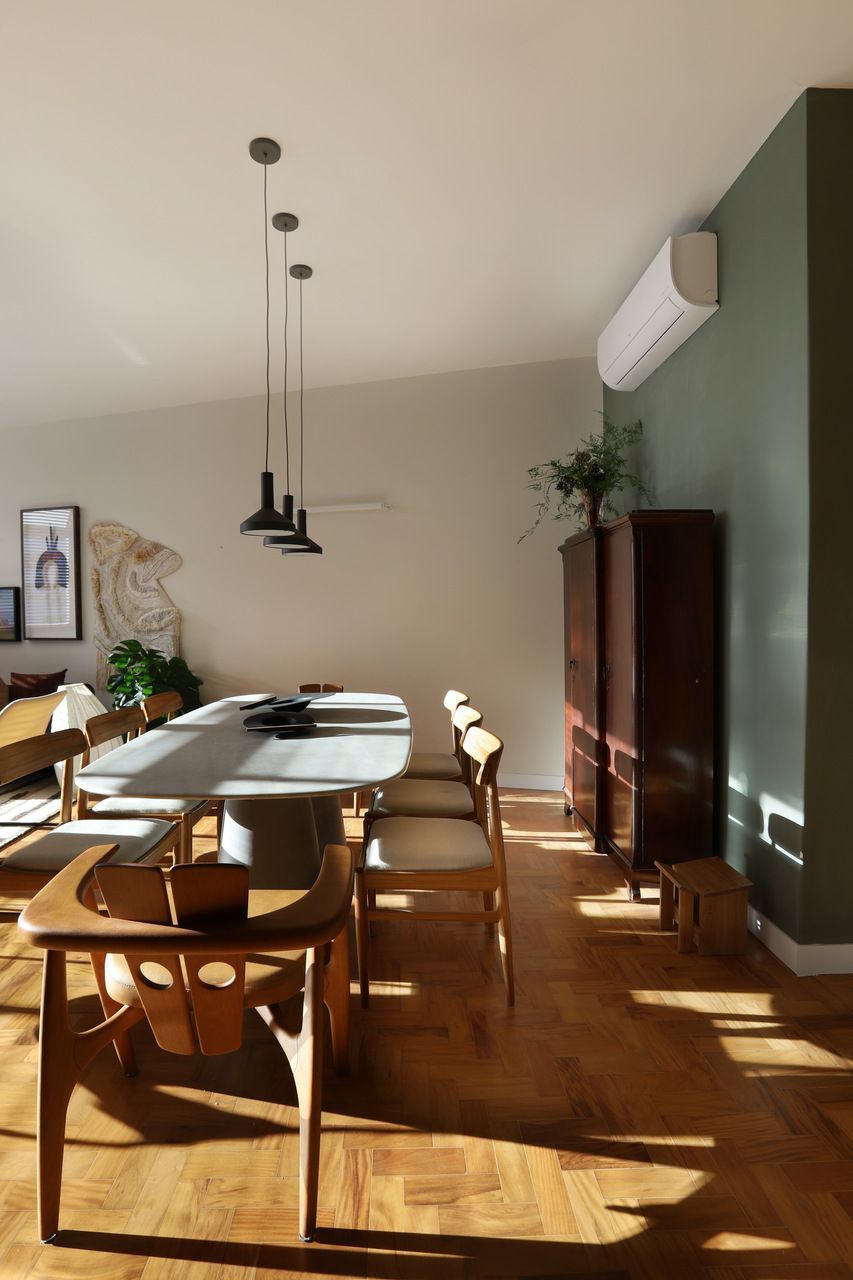 “Uma curiosidade que amo: não fizemos nenhuma obra estrutural. Tudo foi transformado com pintura, escolhas de mobiliário e muita curadoria afetiva. Trouxemos o verde da natureza pra dentro, no teto. As tesouras ganharam tom terracota, criando conexão com todo o mobiliário. Cada peça foi escolhida a dedo pra traduzir essa essência da Juliana, que é tão do mundo, mas ao mesmo tempo, tão baiana.”