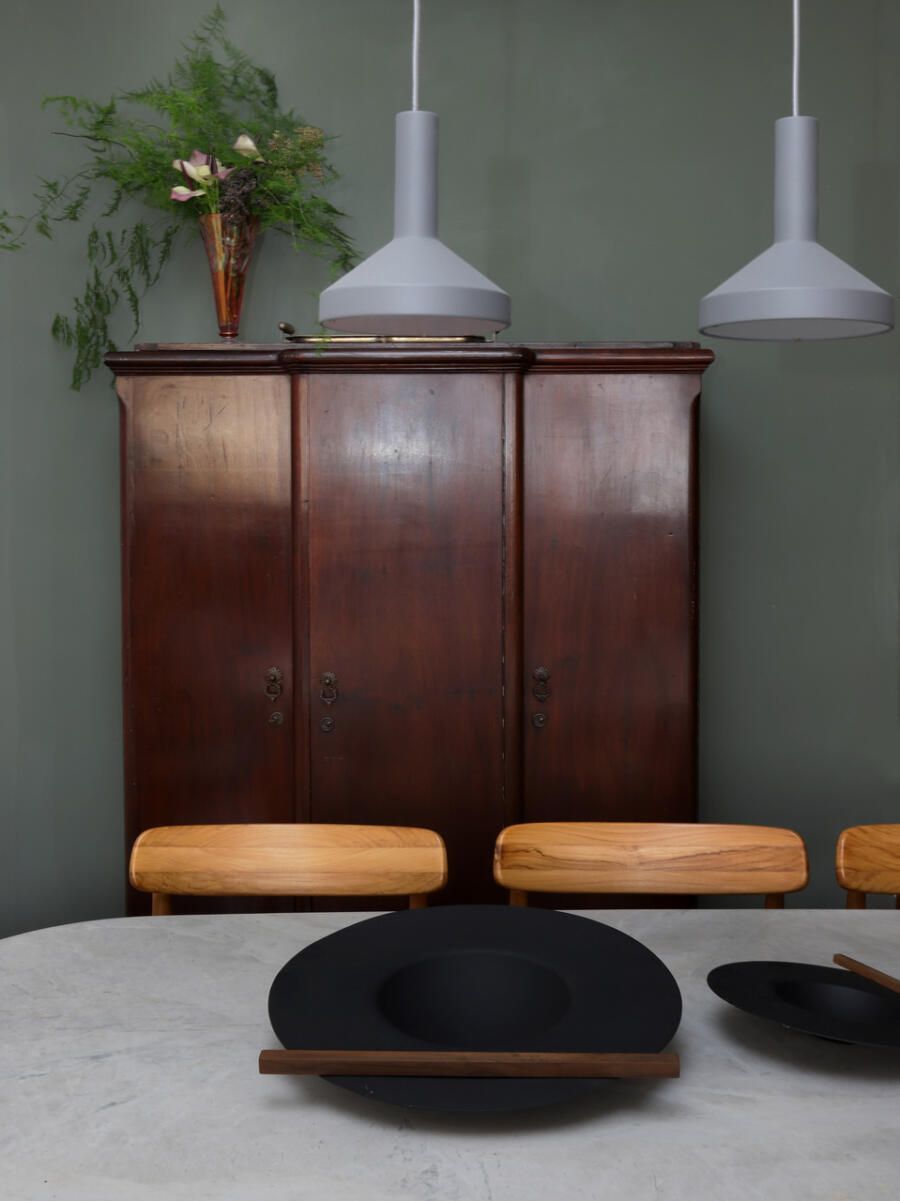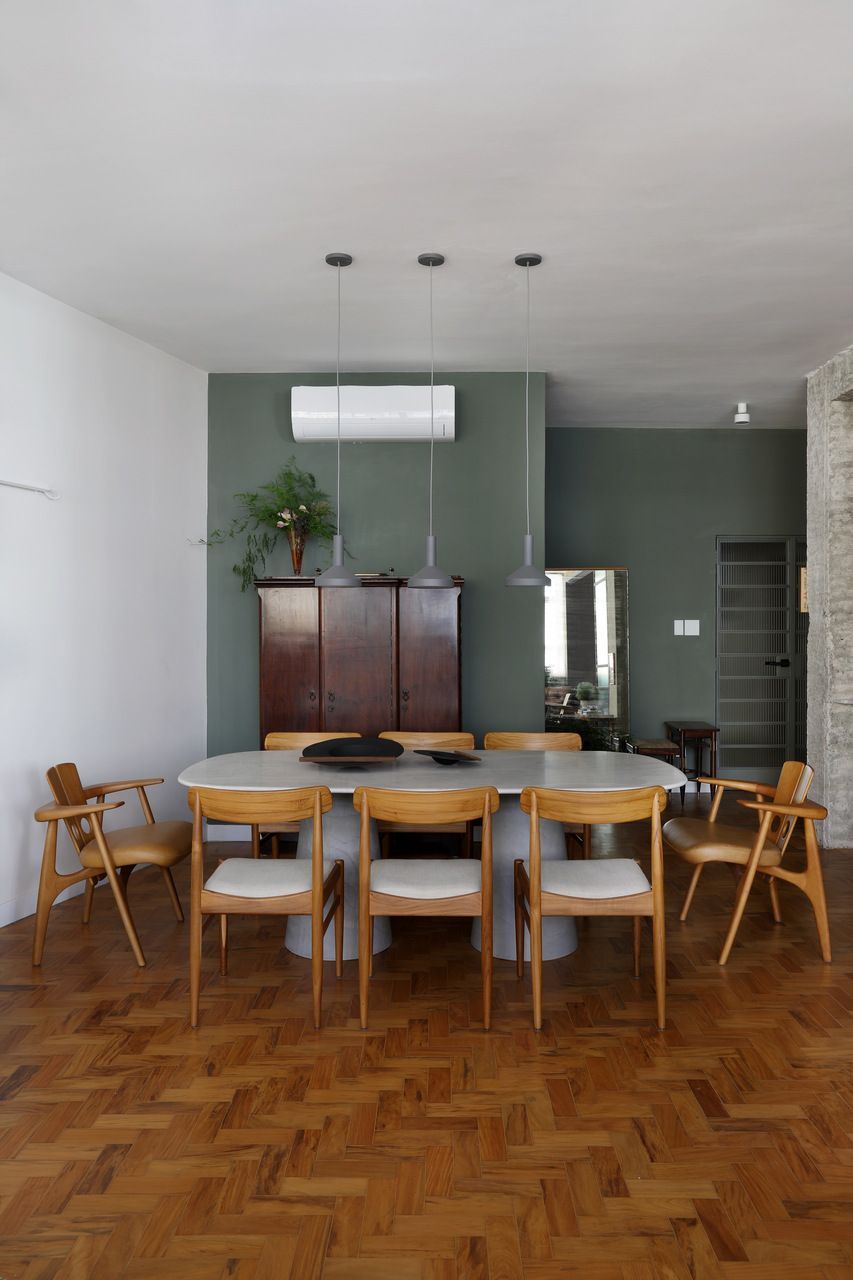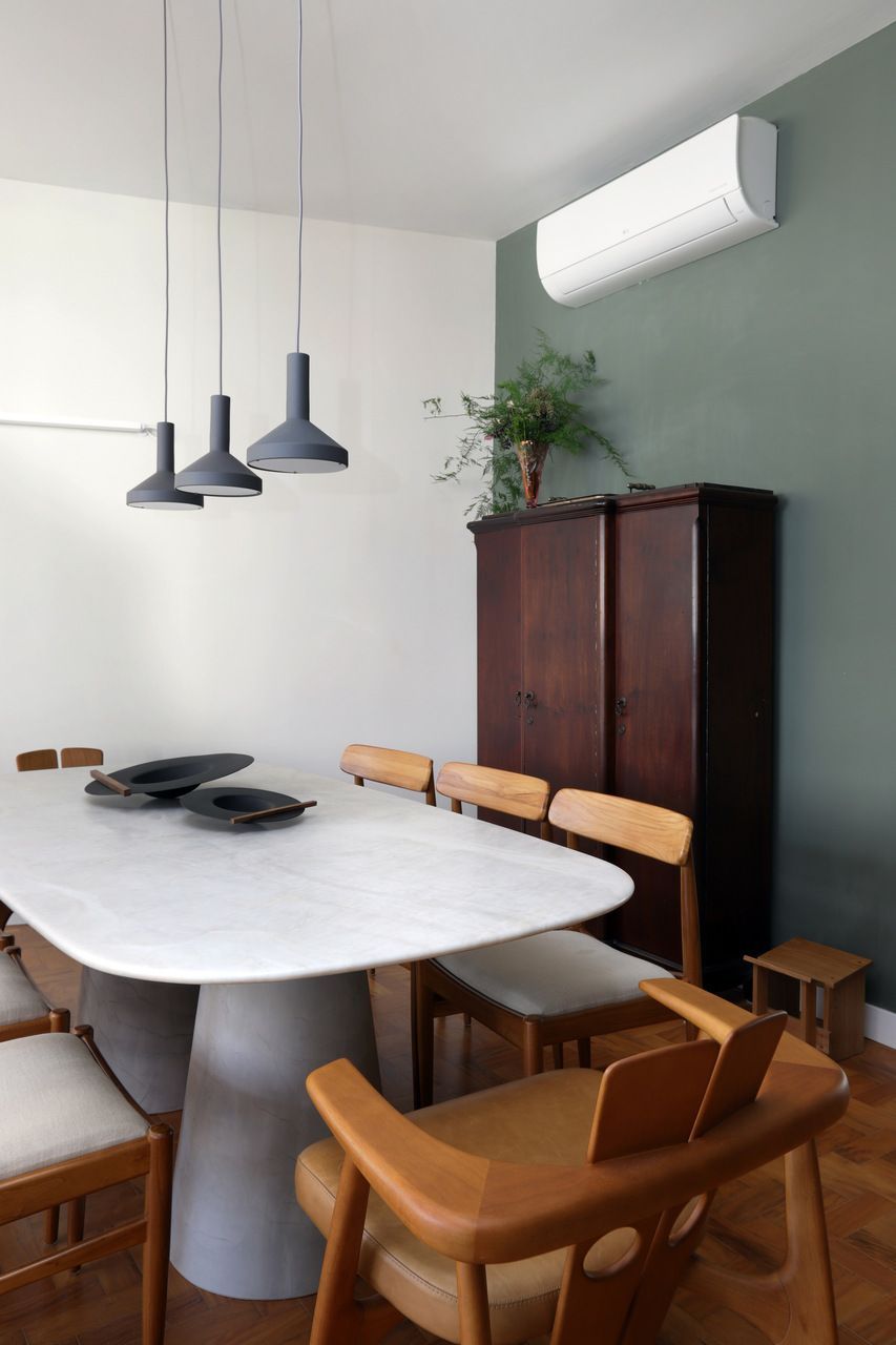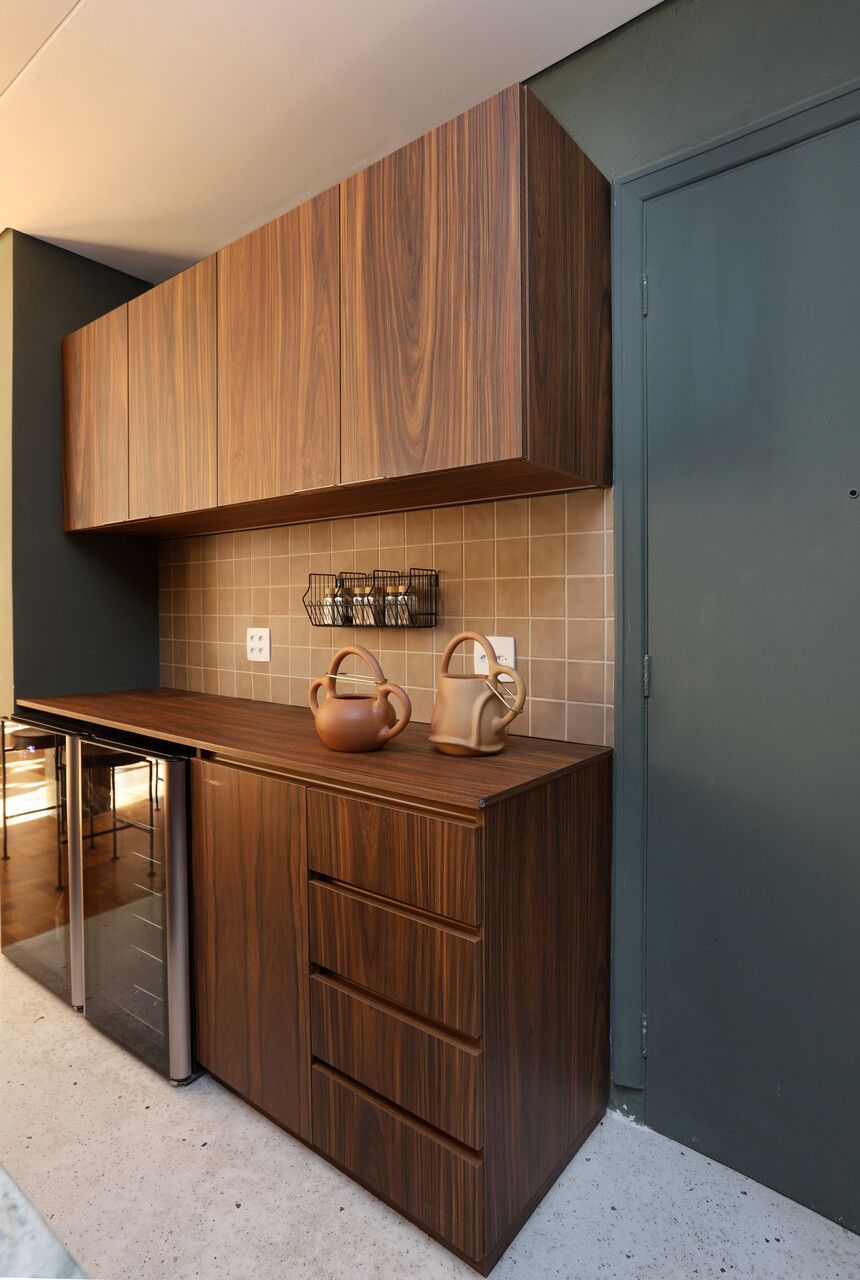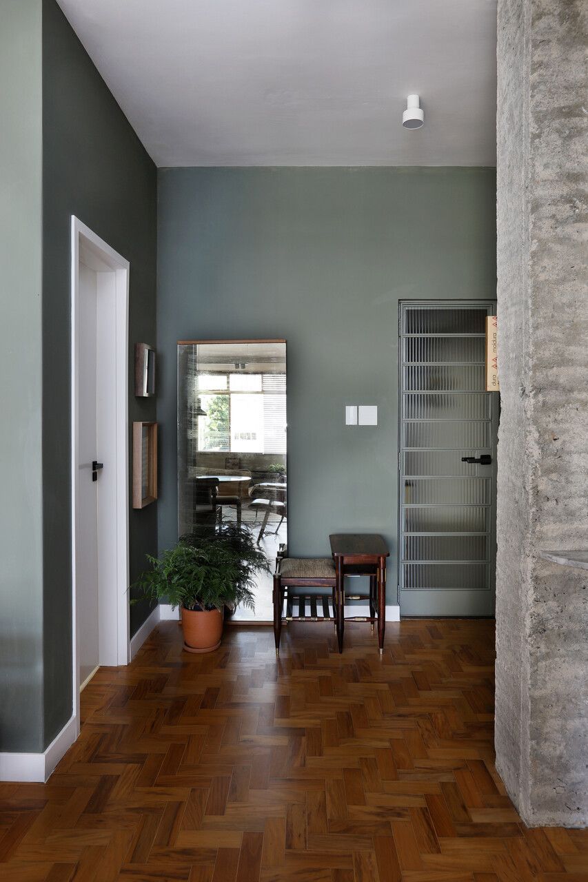 “Uma curiosidade que amo: não fizemos nenhuma obra estrutural. Tudo foi transformado com pintura, escolhas de mobiliário e muita curadoria afetiva. Trouxemos o verde da natureza pra dentro, no teto. As tesouras ganharam tom terracota, criando conexão com todo o mobiliário. Cada peça foi escolhida a dedo pra traduzir essa essência da Juliana, que é tão do mundo, mas ao mesmo tempo, tão baiana.”