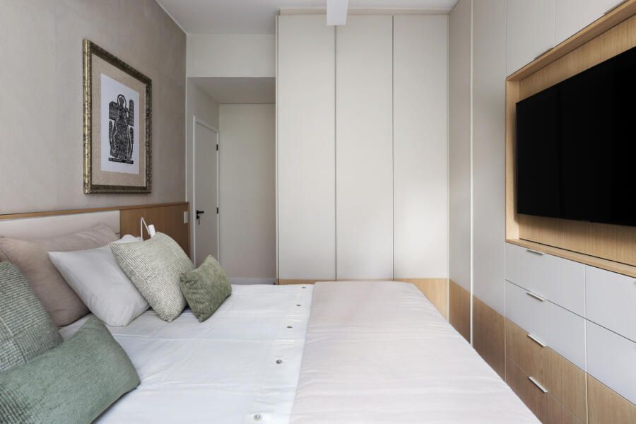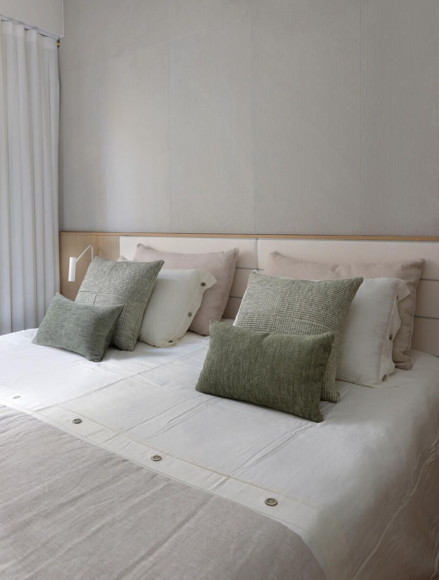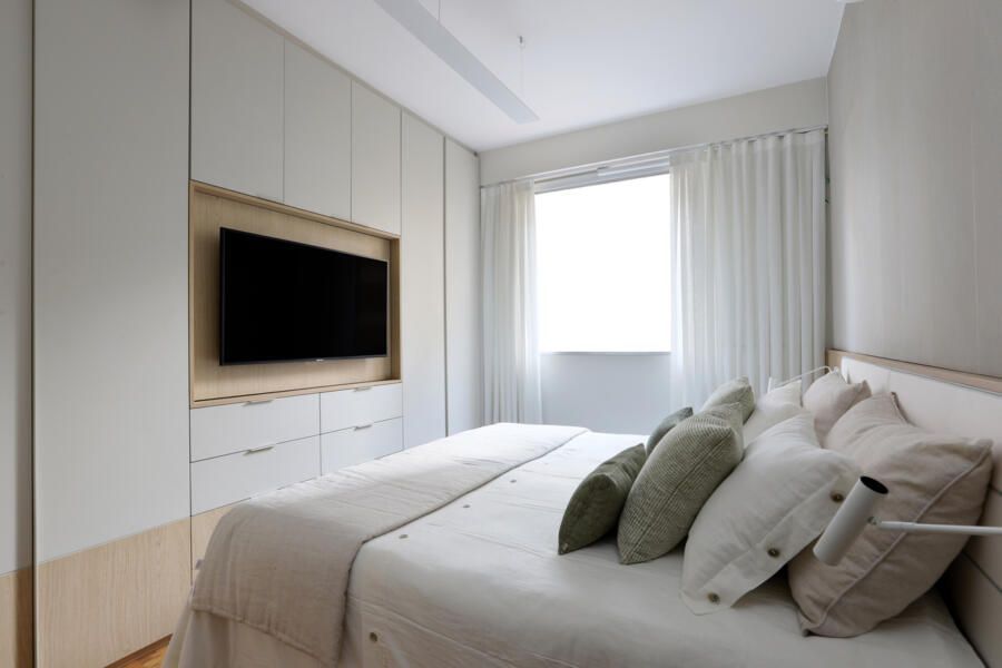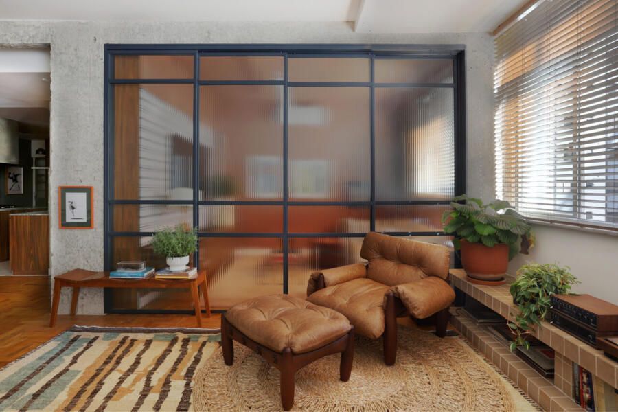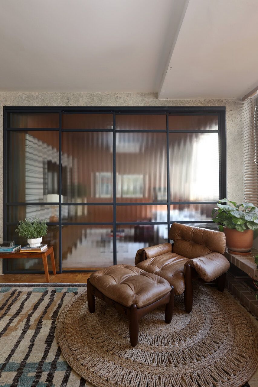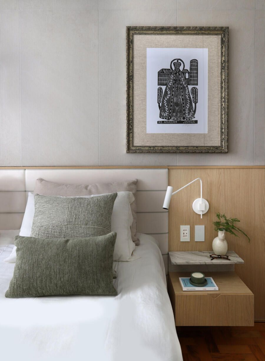 Kika também comenta sobre que alguns elementos da casa original não agradavam muito, como as esquadrias brancas e o piso cerâmico brilhante. O desafio foi justamente deixar tudo mais acolhedor sem mexer na estrutura, e as soluções vieram principalmente pela decoração. Durante a visita completa, ela também mostra com mais calma o living e a suíte master, dois ambientes que ajudam a entender bem a lógica do projeto.
