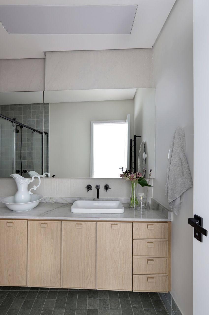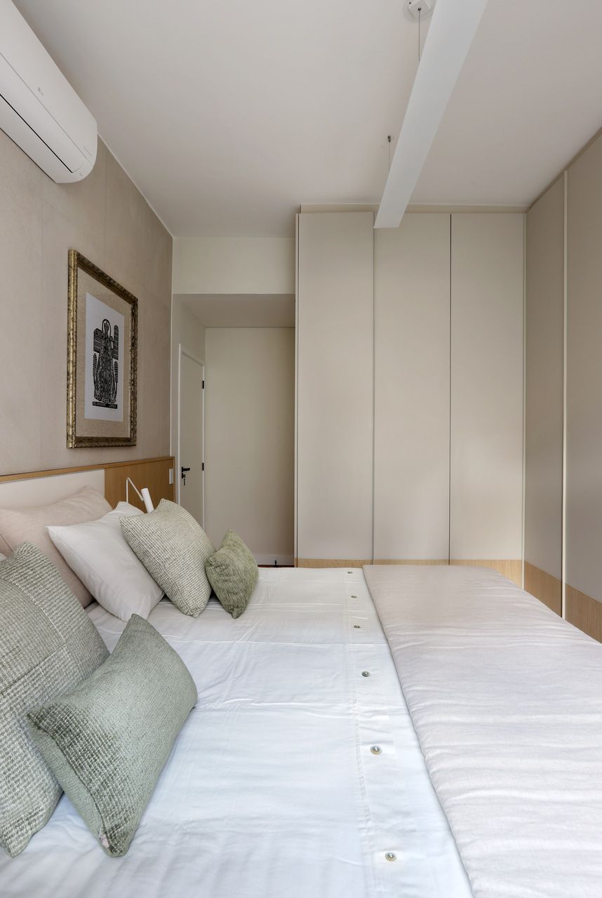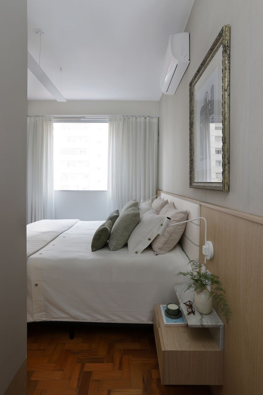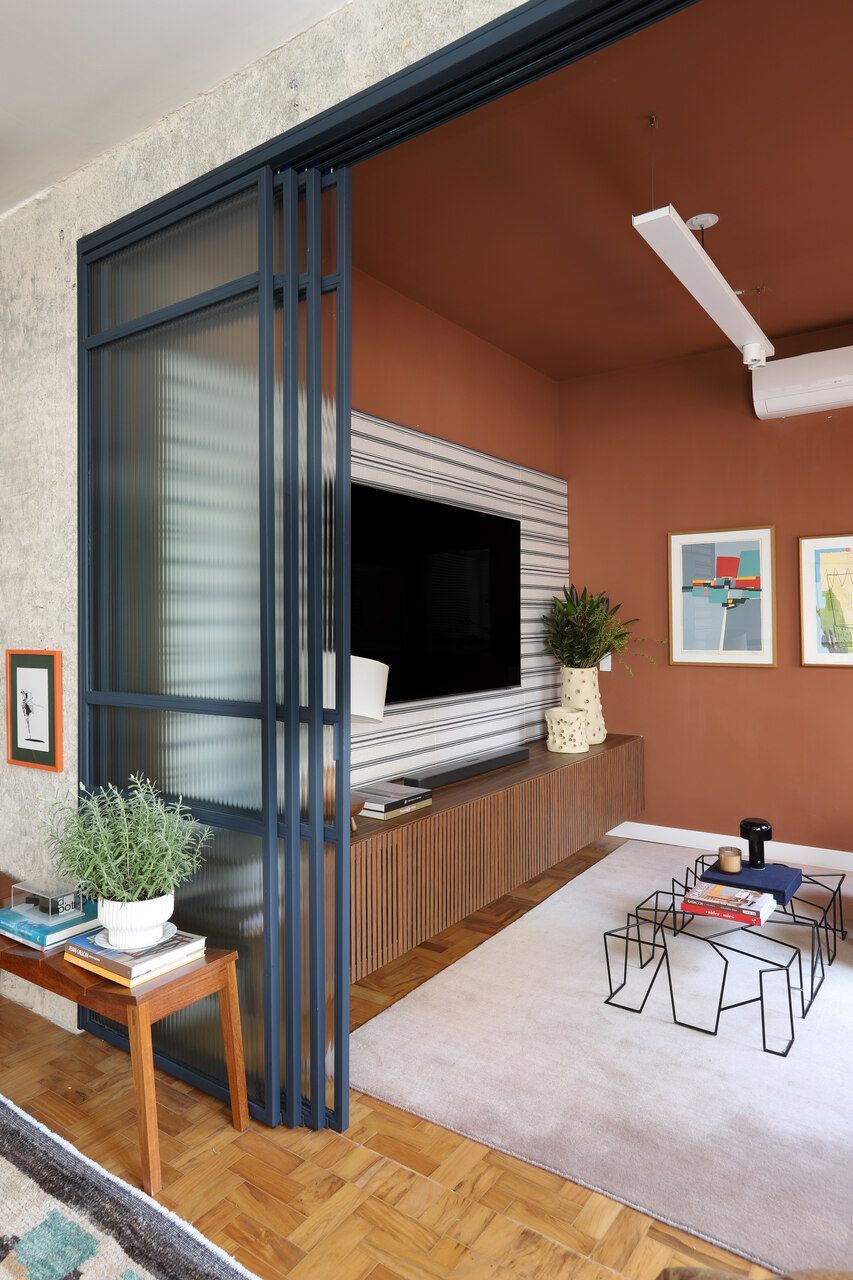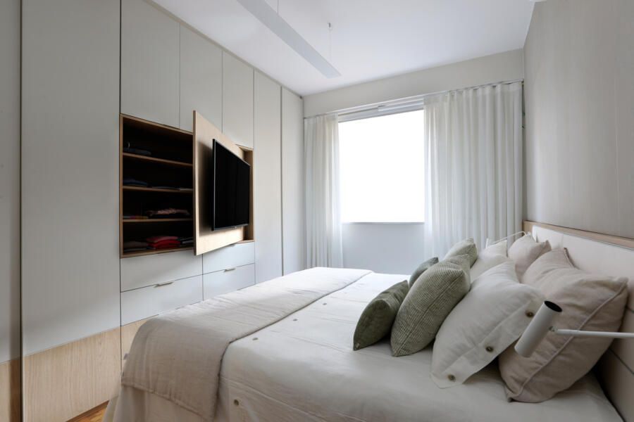Kika também comenta sobre que alguns elementos da casa original não agradavam muito, como as esquadrias brancas e o piso cerâmico brilhante. O desafio foi justamente deixar tudo mais acolhedor sem mexer na estrutura, e as soluções vieram principalmente pela decoração. Durante a visita completa, ela também mostra com mais calma o living e a suíte master, dois ambientes que ajudam a entender bem a lógica do projeto.