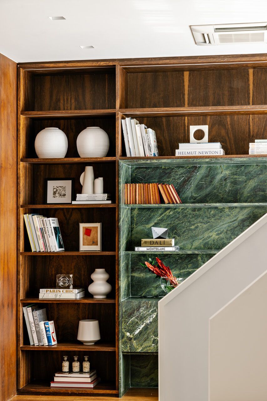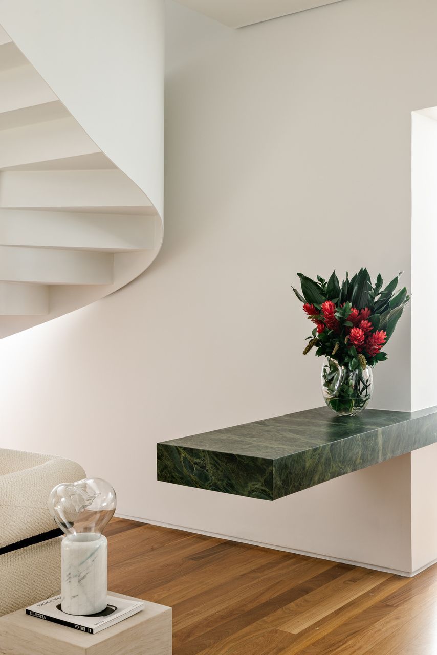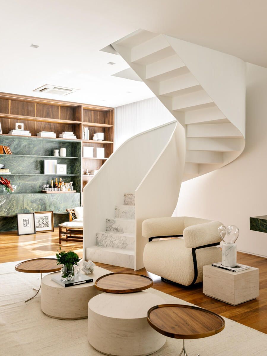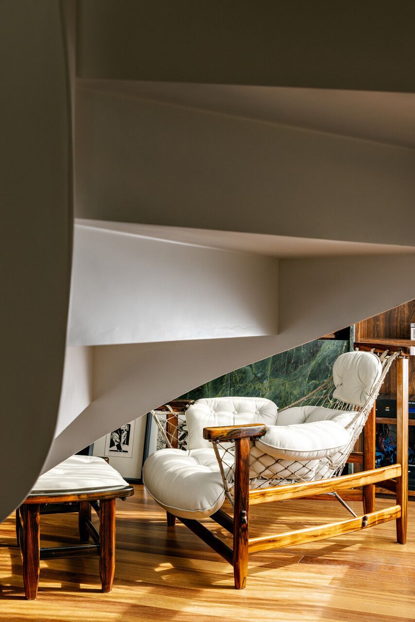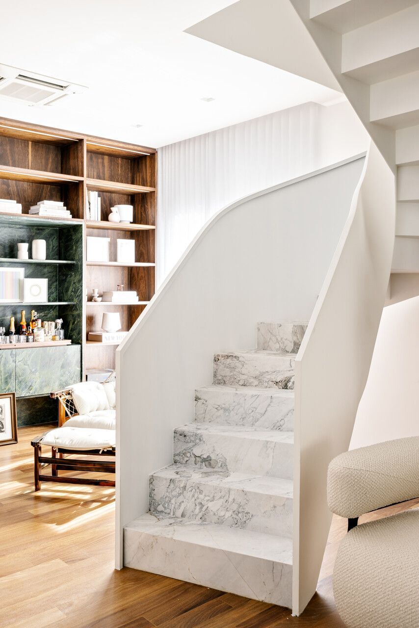 Falando em iluminação, aqui entra a verdadeira virada: a escada. Antes pesada e fragmentada, ela bloqueava a passagem de luz e dividia o espaço de forma rígida. A solução criada por Marcela foi transformar essa estrutura no ponto de costura do projeto. Agora com um desenho contínuo, leve e quase escultórico, a escada conecta, ilumina e define a narrativa vertical do apartamento. Subindo por ela, chegamos à suíte master com closet de um lado, e ao home office — hoje segunda suíte — do outro, garantindo um equilíbrio perfeito entre privacidade e funcionalidade.