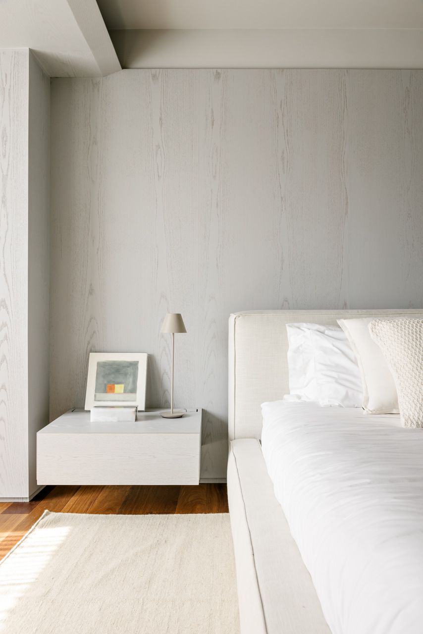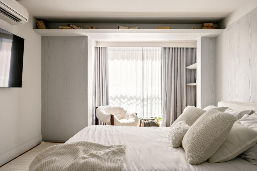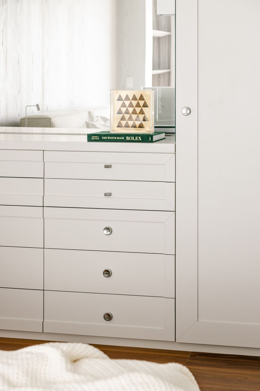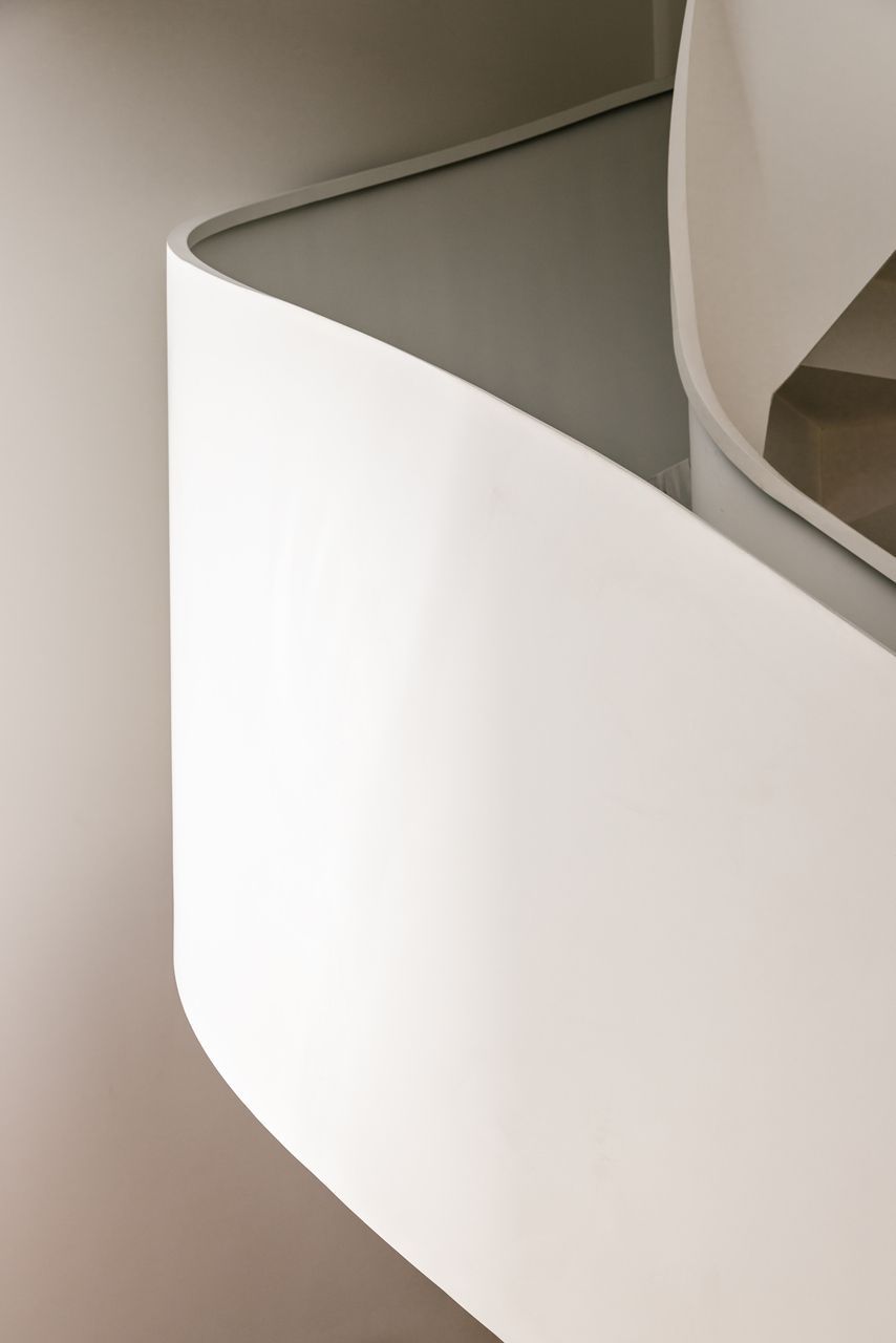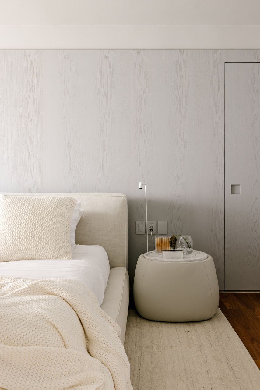 Falando em iluminação, aqui entra a verdadeira virada: a escada. Antes pesada e fragmentada, ela bloqueava a passagem de luz e dividia o espaço de forma rígida. A solução criada por Marcela foi transformar essa estrutura no ponto de costura do projeto. Agora com um desenho contínuo, leve e quase escultórico, a escada conecta, ilumina e define a narrativa vertical do apartamento. Subindo por ela, chegamos à suíte master com closet de um lado, e ao home office — hoje segunda suíte — do outro, garantindo um equilíbrio perfeito entre privacidade e funcionalidade.