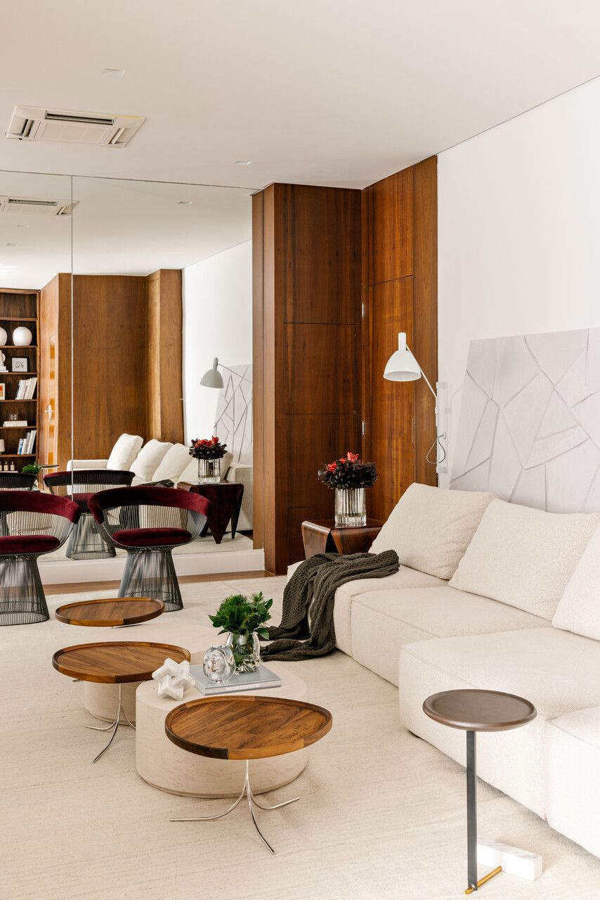 E a planta original passou por uma bela mudança. O apartamento tinha três suítes, mas uma delas foi integrada à área social, ampliando a sala e dando respiro ao layout. O banheiro desse antigo quarto migrou para a suíte master, reforçando o conforto do pavimento superior. Hoje, o apê conta com duas suítes e um lavabo, sendo uma delas usada como escritório.