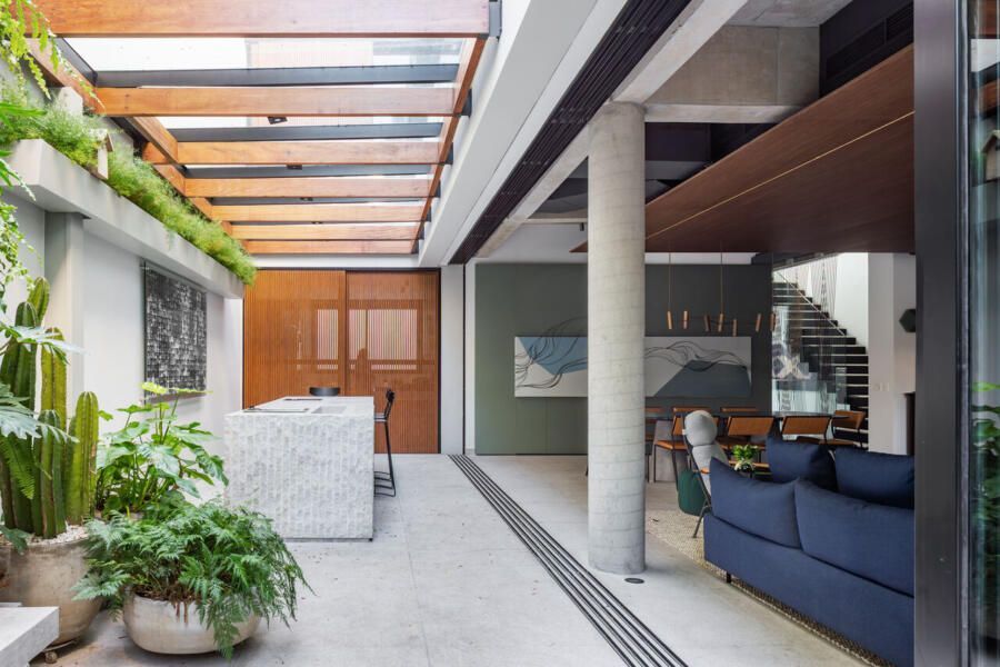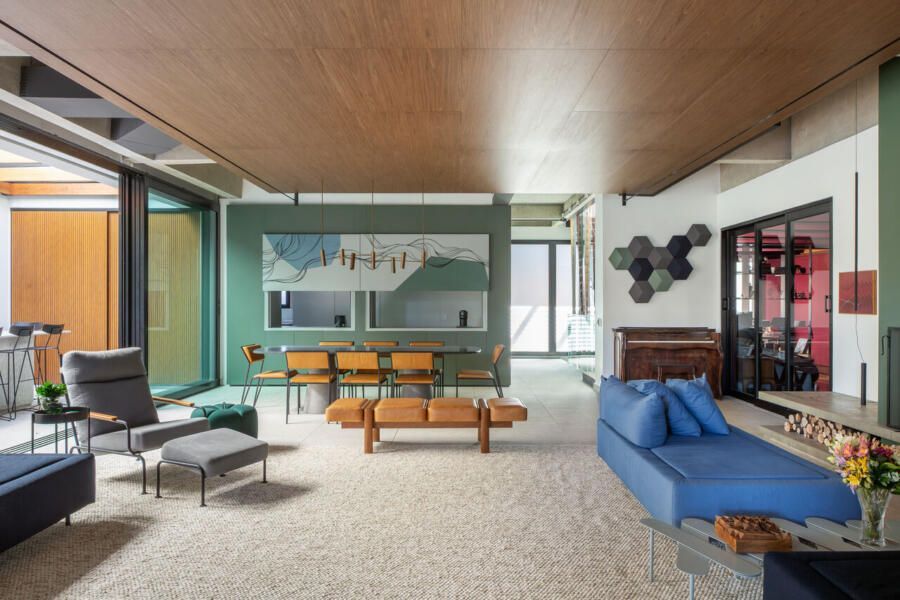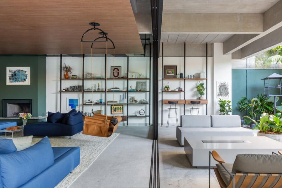 A cozinha é, sem dúvida, um dos grandes destaques do apê. Com uma estética industrial e moderna, ela aposta no cimento e no granito para criar um visual quase brutalista, marcado também pelas vigas aparentes. O resultado é um espaço prático, funcional e elegante — daqueles que funcionam muito bem no dia a dia, mas não abrem mão de impacto visual. Ali, um quadro com uma fotografia do Pelé em um momento importante de apoio ao movimento Diretas Já adiciona uma camada simbólica e potente ao ambiente. Na sala, além do mobiliário bem escolhido, a vista para a Avenida Paulista rouba a cena. É aquele tipo de paisagem urbana que muda ao longo do dia e dialoga diretamente com a proposta contemporânea do projeto. Já o quarto traz um clima mais minimalista e se integra parcialmente à área social. Edu conta que esse ambiente ainda está em desenvolvimento, parte de um processo contínuo de criação, com novas ideias que devem surgir ao longo do tempo.