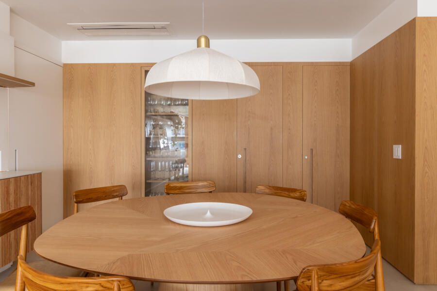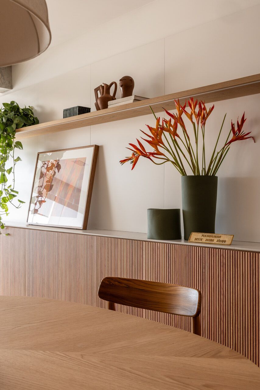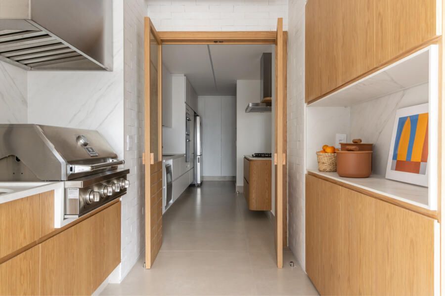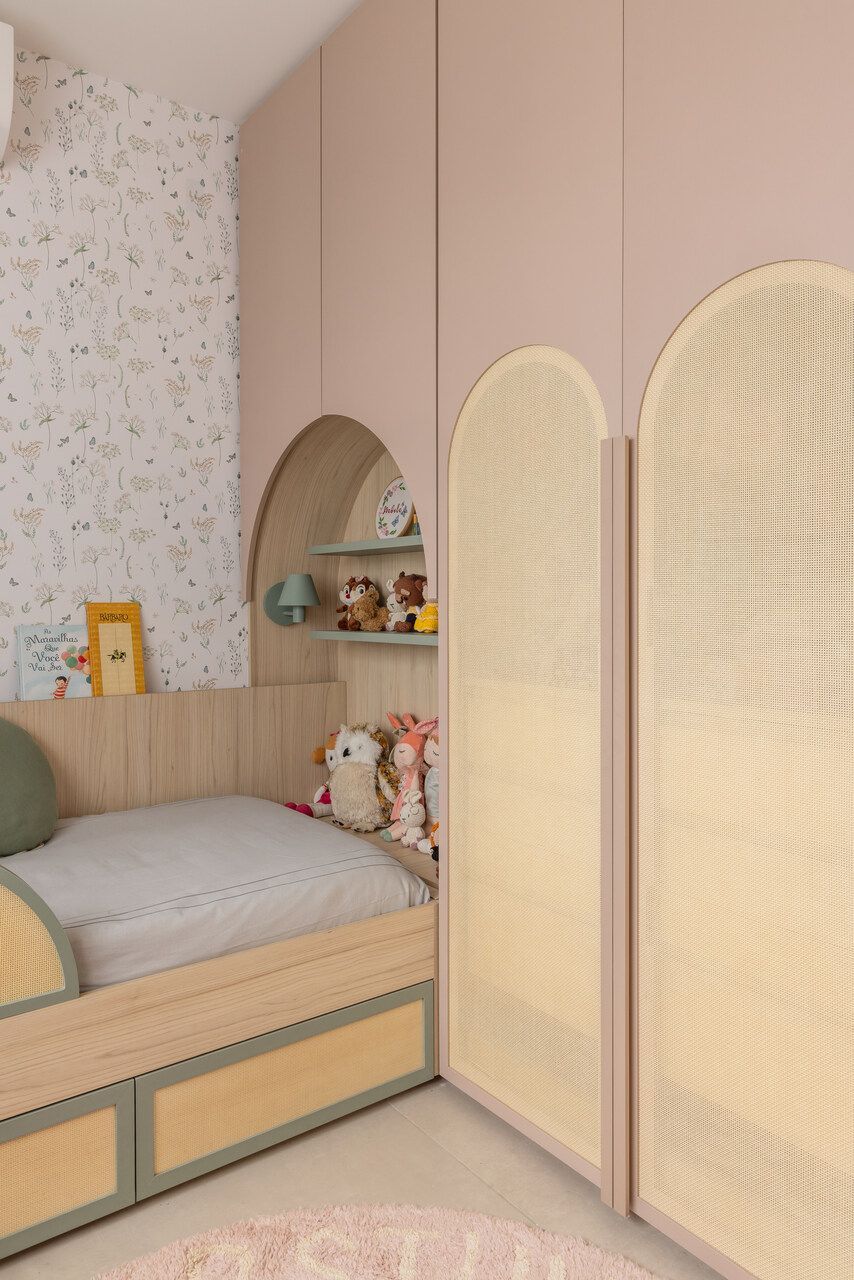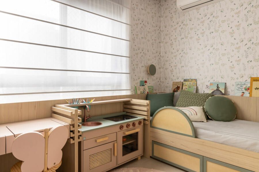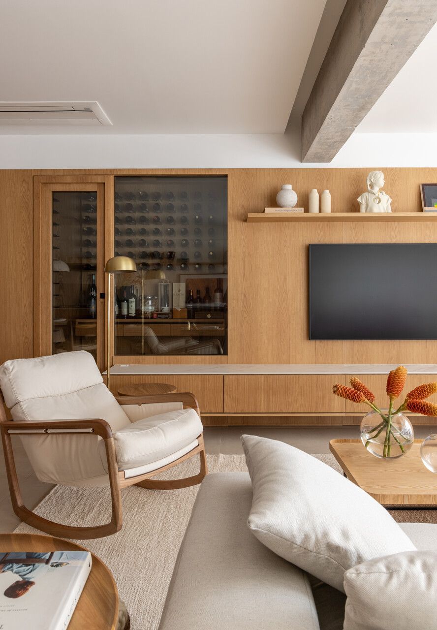 Seguindo pelo apartamento, dá para perceber como o projeto foi totalmente moldado aos desejos dos moradores. O quarto das meninas, por exemplo, é lúdico e criativo, incentivando o brincar, mas com soluções que mantêm a organização. Já entre a área social e a ala íntima, a adega walk-in cria uma transição elegante e reforça o estilo de vida dos moradores, que adoram receber visitas.