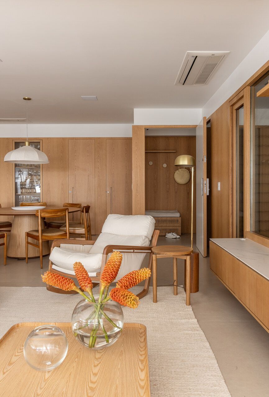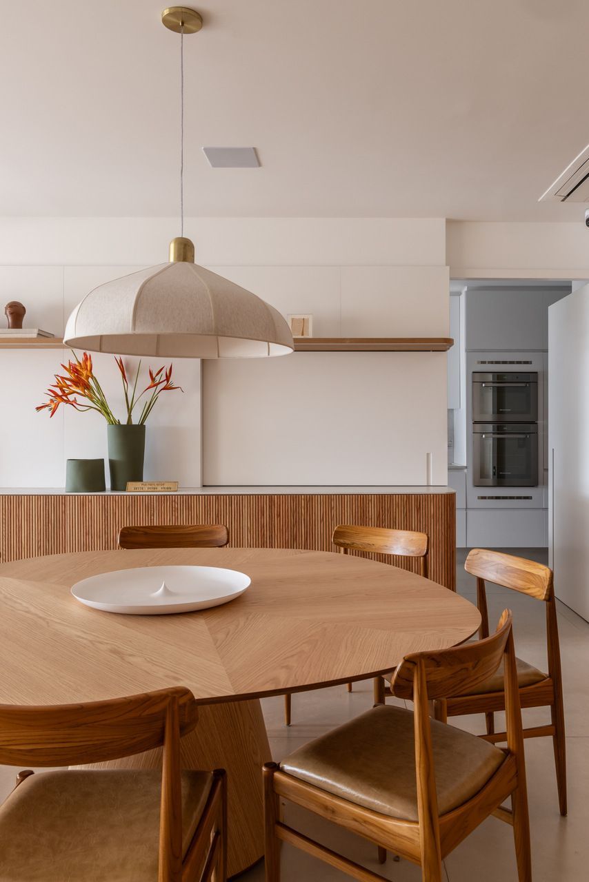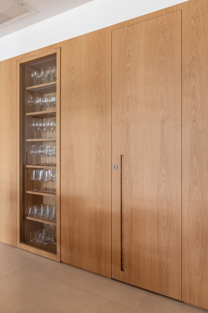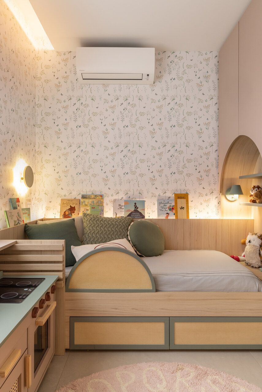 Seguindo pelo apartamento, dá para perceber como o projeto foi totalmente moldado aos desejos dos moradores. O quarto das meninas, por exemplo, é lúdico e criativo, incentivando o brincar, mas com soluções que mantêm a organização. Já entre a área social e a ala íntima, a adega walk-in cria uma transição elegante e reforça o estilo de vida dos moradores, que adoram receber visitas.