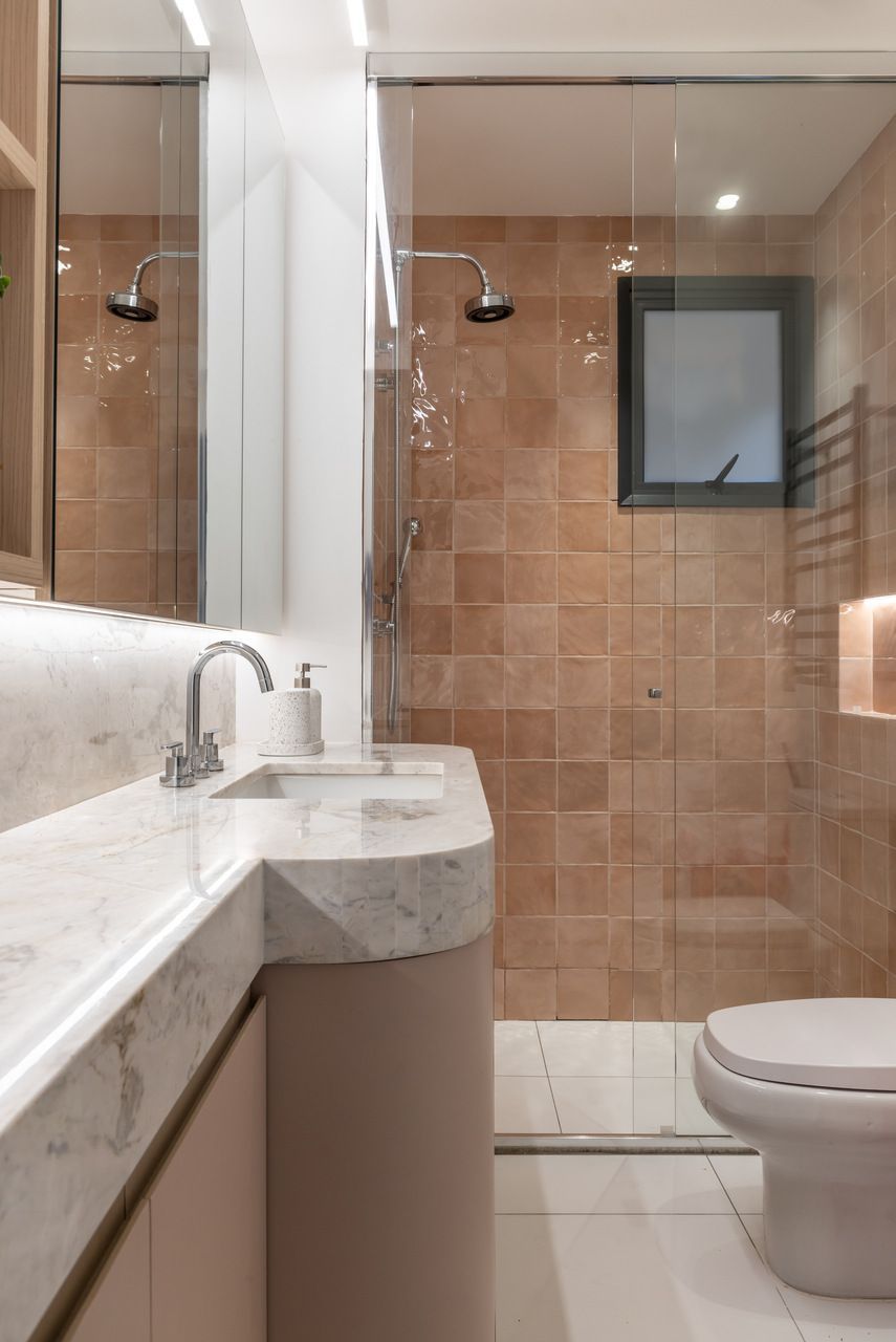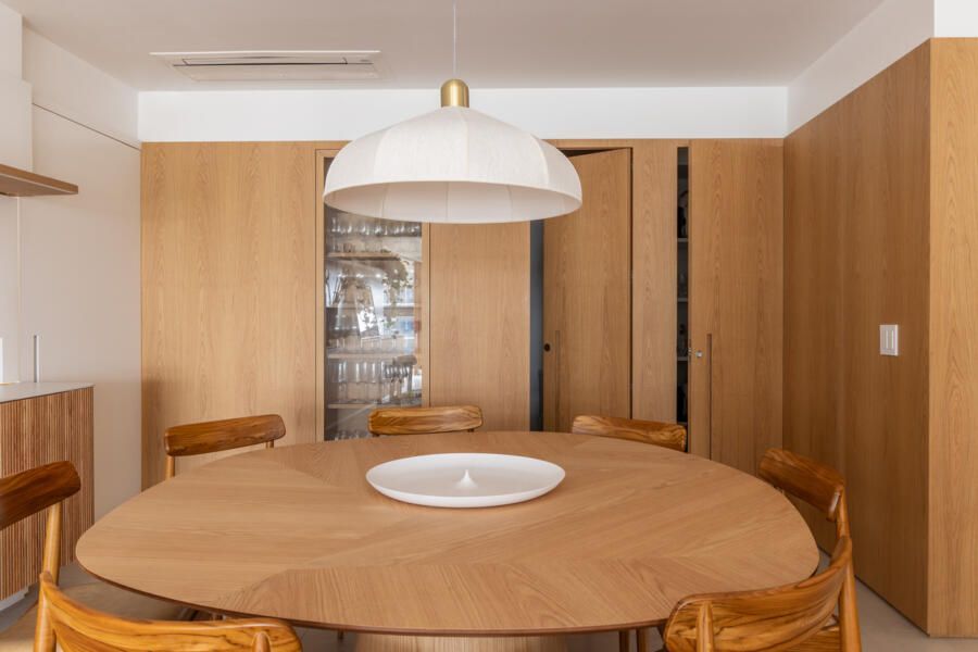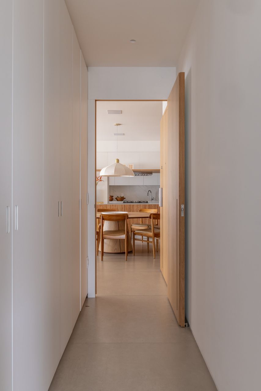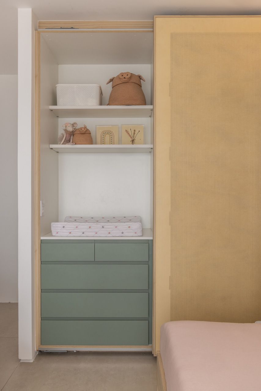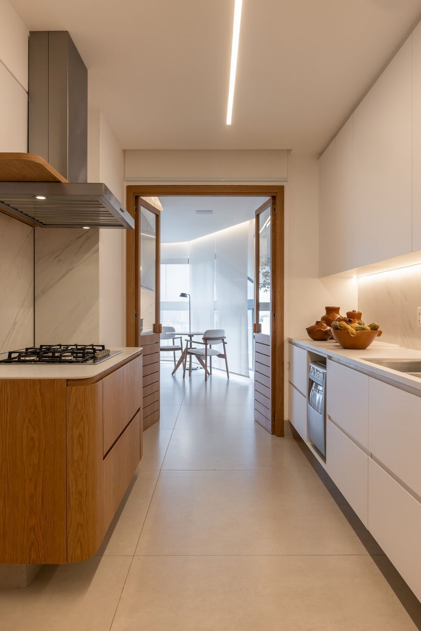 Seguindo pelo apartamento, dá para perceber como o projeto foi totalmente moldado aos desejos dos moradores. O quarto das meninas, por exemplo, é lúdico e criativo, incentivando o brincar, mas com soluções que mantêm a organização. Já entre a área social e a ala íntima, a adega walk-in cria uma transição elegante e reforça o estilo de vida dos moradores, que adoram receber visitas.