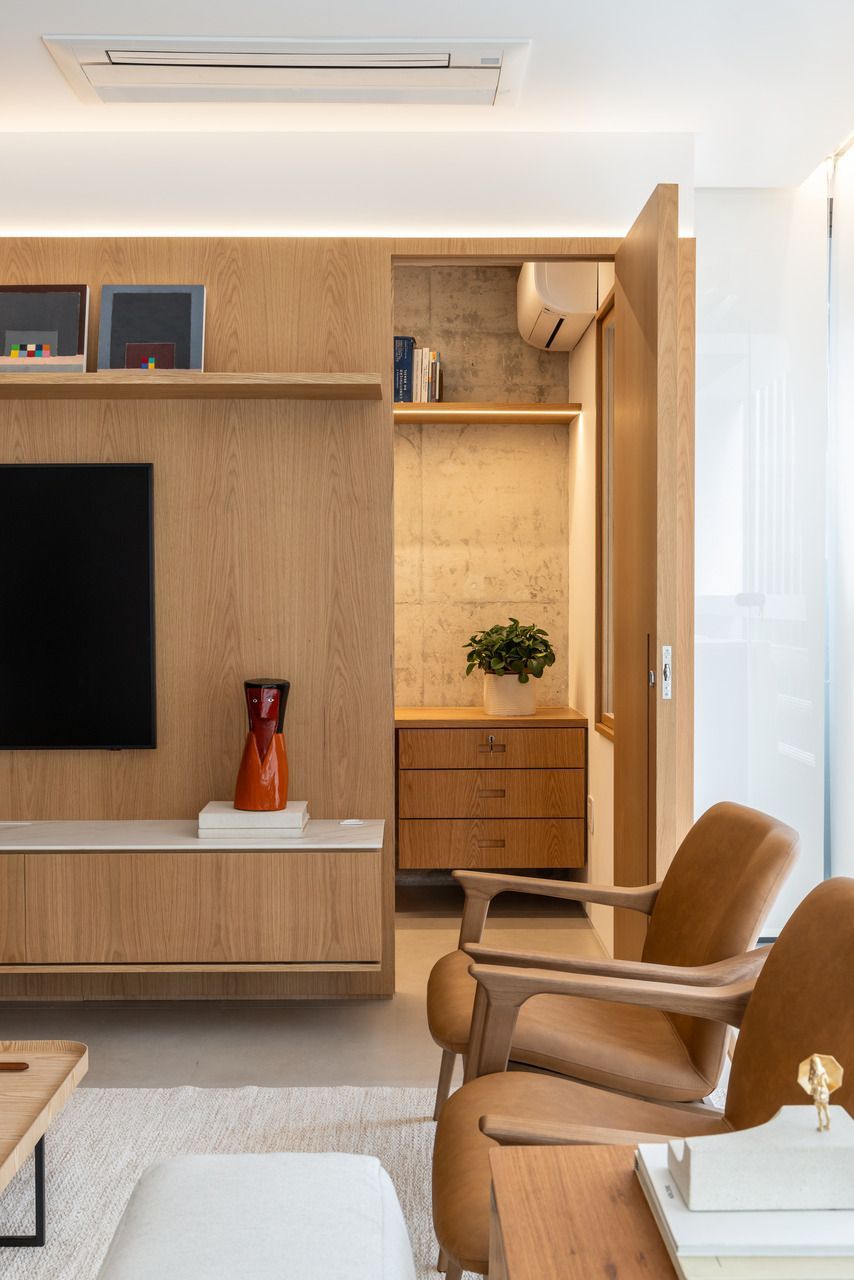 A TV da sala ainda está combinada com uma Soundbar Samsung de desenho super slim, com menos de 4 cm de espessura, que já entrou oficialmente para a minha wishlist de casa. Mariana e Claudia me contaram que usam bastante esse modelo nos projetos justamente pelo desenho discreto e pela facilidade de integração com diferentes estilos. Além de elegante, ela entrega um som imersivo, com áudio que se ajusta de acordo com o que você está assistindo. E o mais interessante é que ela funciona em harmonia com os alto-falantes da TV por meio da tecnologia Q-Symphony, criando uma experiência sonora muito mais rica, sem interferir na estética do ambiente ou exigir cabos aparentes.