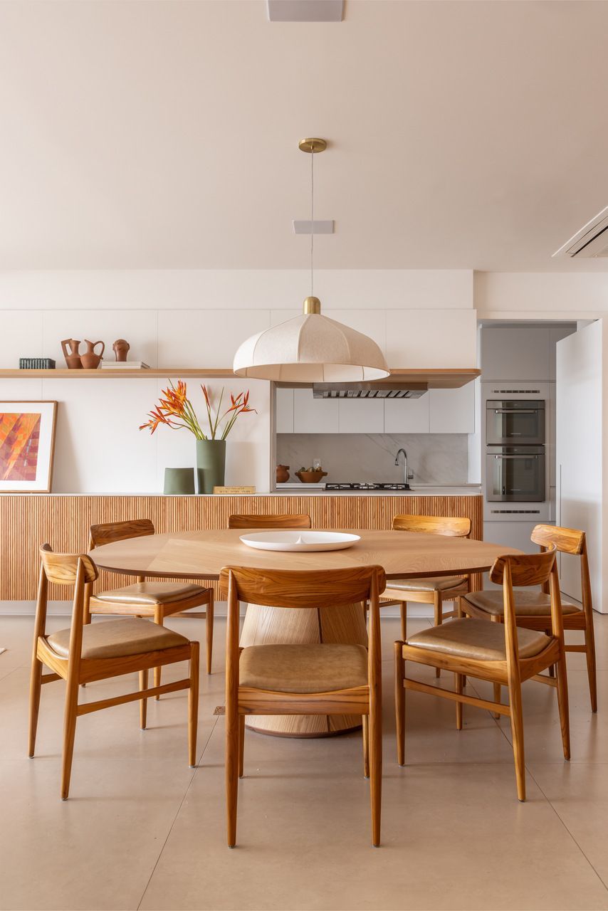 Logo na entrada, a área social integrada já mostra a força do projeto: sala de estar, jantar, cozinha e terraço gourmet se conectam de forma fluida, mas com recursos que permitem isolar ambientes quando necessário. É uma casa pronta tanto para receber amigos quanto para acompanhar a rotina da família. E é justamente nesse espaço que a tecnologia entra como extensão do design. Na sala, a TV The Frame da Samsung se encaixa perfeitamente na proposta estética do ambiente.