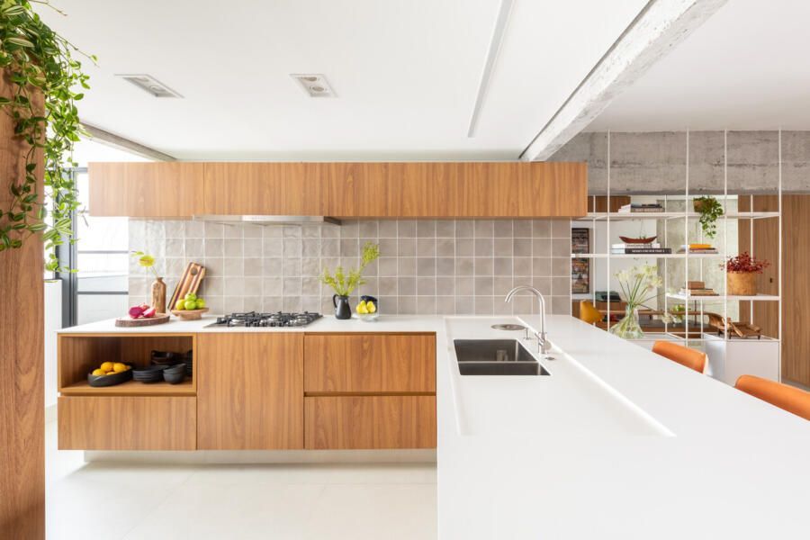 Durante a visita, a integração dos ambientes chama atenção logo de cara. Sala, jantar, cozinha e office funcionam como um único espaço. O concreto aparente é protagonista: vigas e pilares tiveram o reboco removido para deixar a estrutura à mostra, equilibrada por paredes brancas e muita madeira. Na sala, o destaque vai para a grande estante suspensa em freijó, com quase sete metros, que reúne livros, objetos afetivos e memórias do casal. O banco de concreto revestido em azulejaria, criado quase de última hora, acabou virando um dos detalhes mais queridos do projeto.