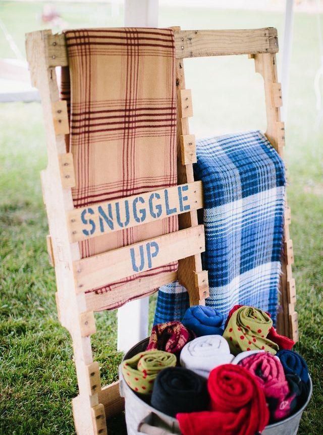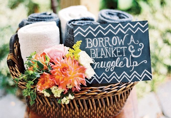 A festa vai acontecer durante o outono ou inverno? Então é bom garantir que seus convidados não sintam frio! Deixe a disposição deles algumas mantas ou echarpes. A apresentação em cestos fica um charme, olha só: