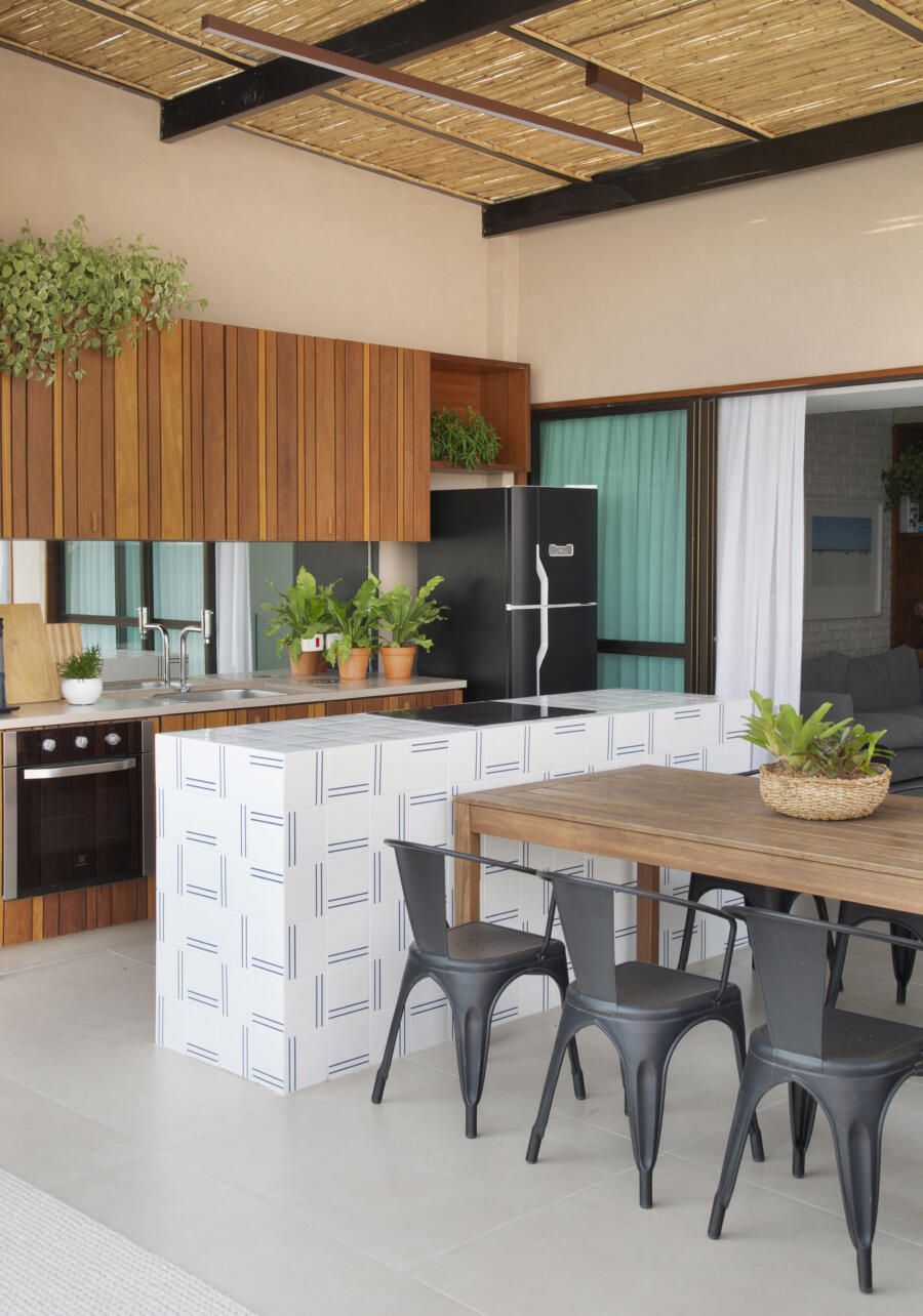Se for possível, inclua uma cortina de vidro isto é, uma espécie de janela de vidro — para aumentar a integração com a sala de estar e evitar inconveniências quando o tempo está chuvoso. Caso não seja possível, opte por pisos antiderrapantes. Ah! E é importante descartar a ideia de colocar estofados com tecido nesta área da casa: além de mofarem caso sejam expostos à chuva, também pegam o cheiro da fumaça da churrasqueira.