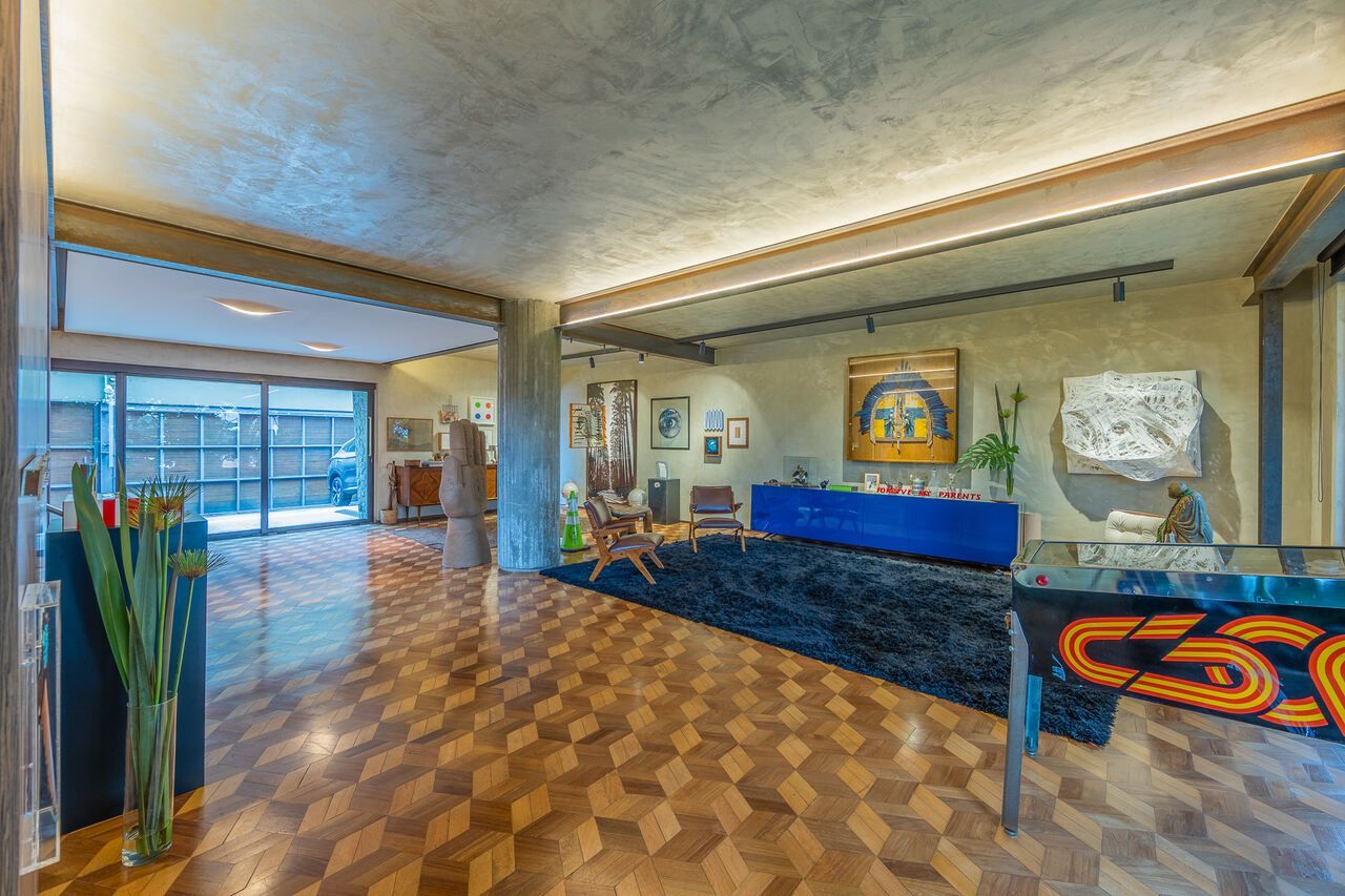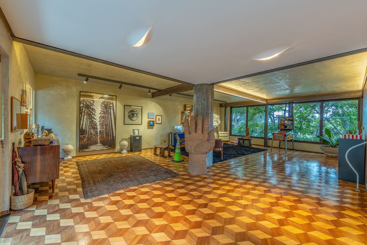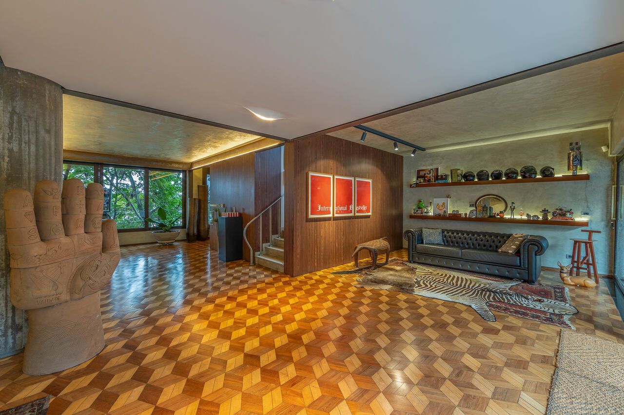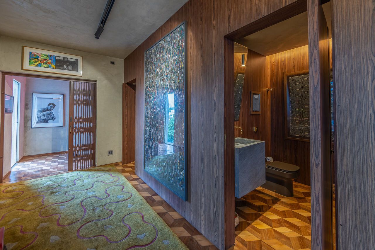 A casa é repleta de obras de arte, algumas inclusive ficarão no imóvel quando for vendido, e muita história, como o restauro do piso do hall de entrada, que ficou incrível.