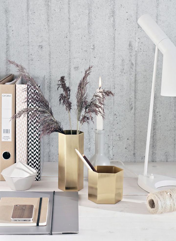 Decoração de: Home office - luminárias pendentes douradas; Casa de ValentinaDecoração de: Home office - abajur dourado; Casa de ValentinaDecoração de: Detalhes  - prateleira mão fancesa dourada; Casa de Valentina