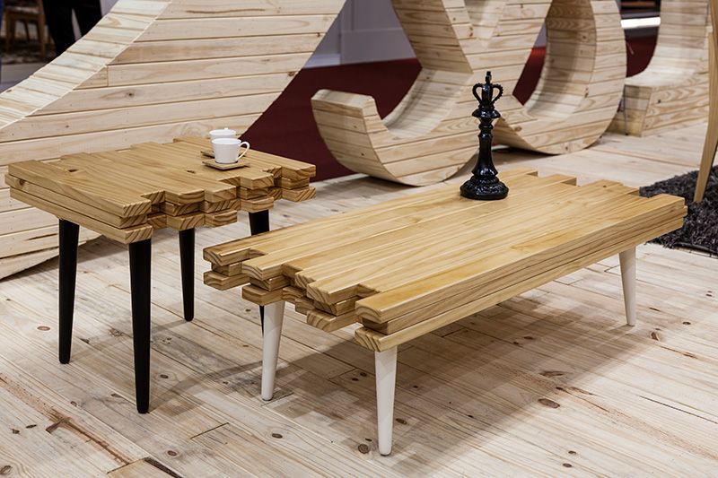Divertidas as mesinhas da P&C Artemobili imitando parquets de madeira empilhados!