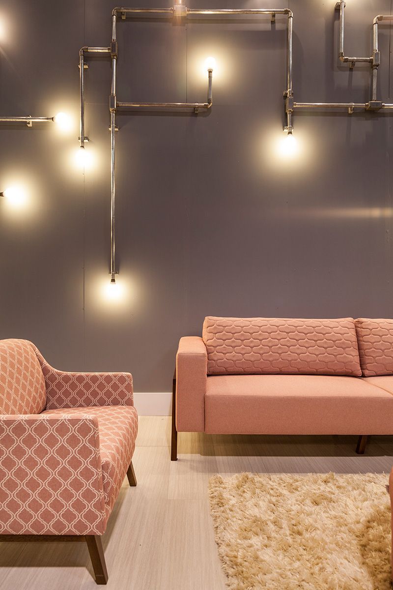 Olha que cantinho lindo no estande da Enele! O cor-de-rosa dos sofás é uma tendência e tanto, viu? A própria Pantone está apostando nesse tom, que eles chamam de Rose Quartz, como uma das cores de 2016:
