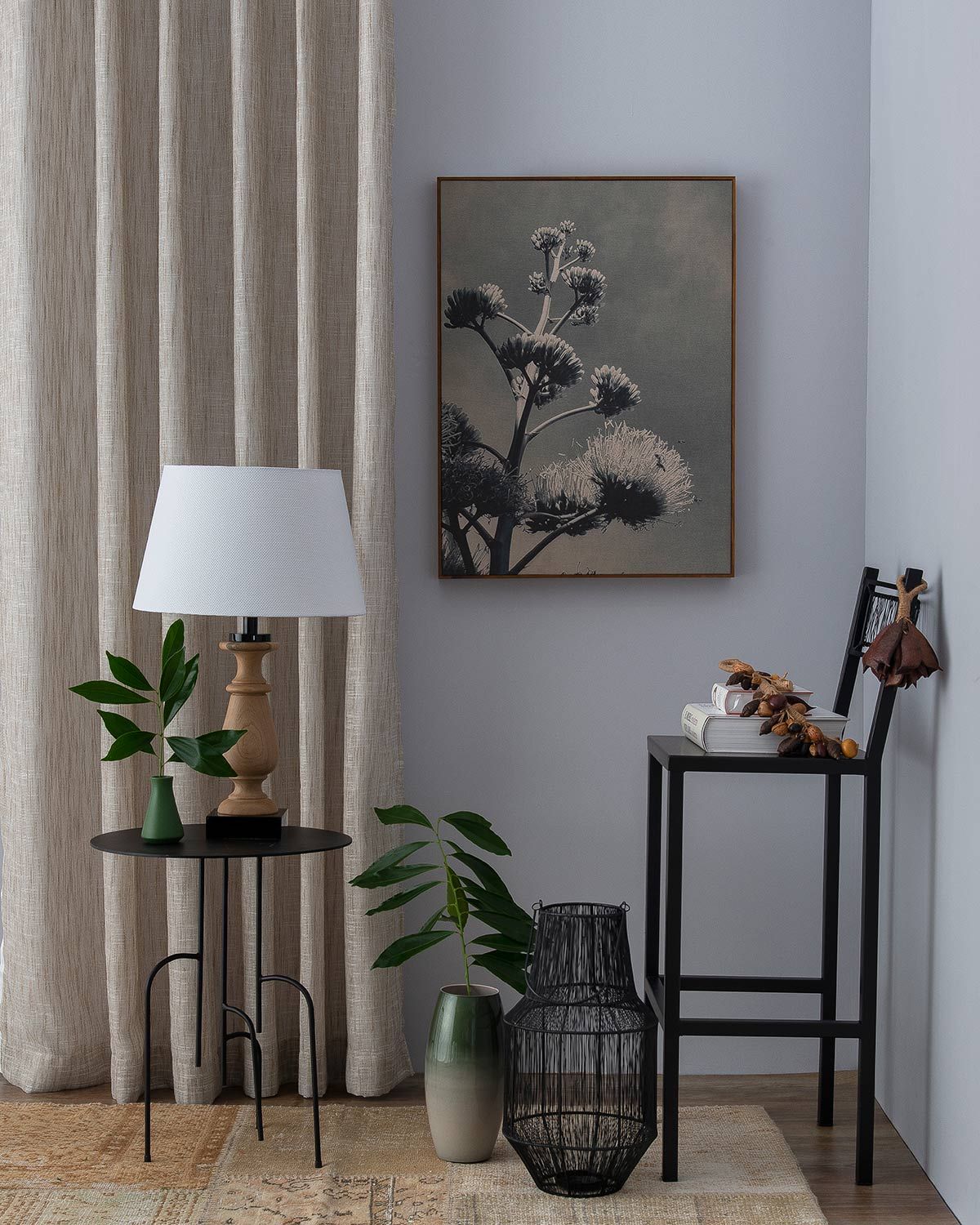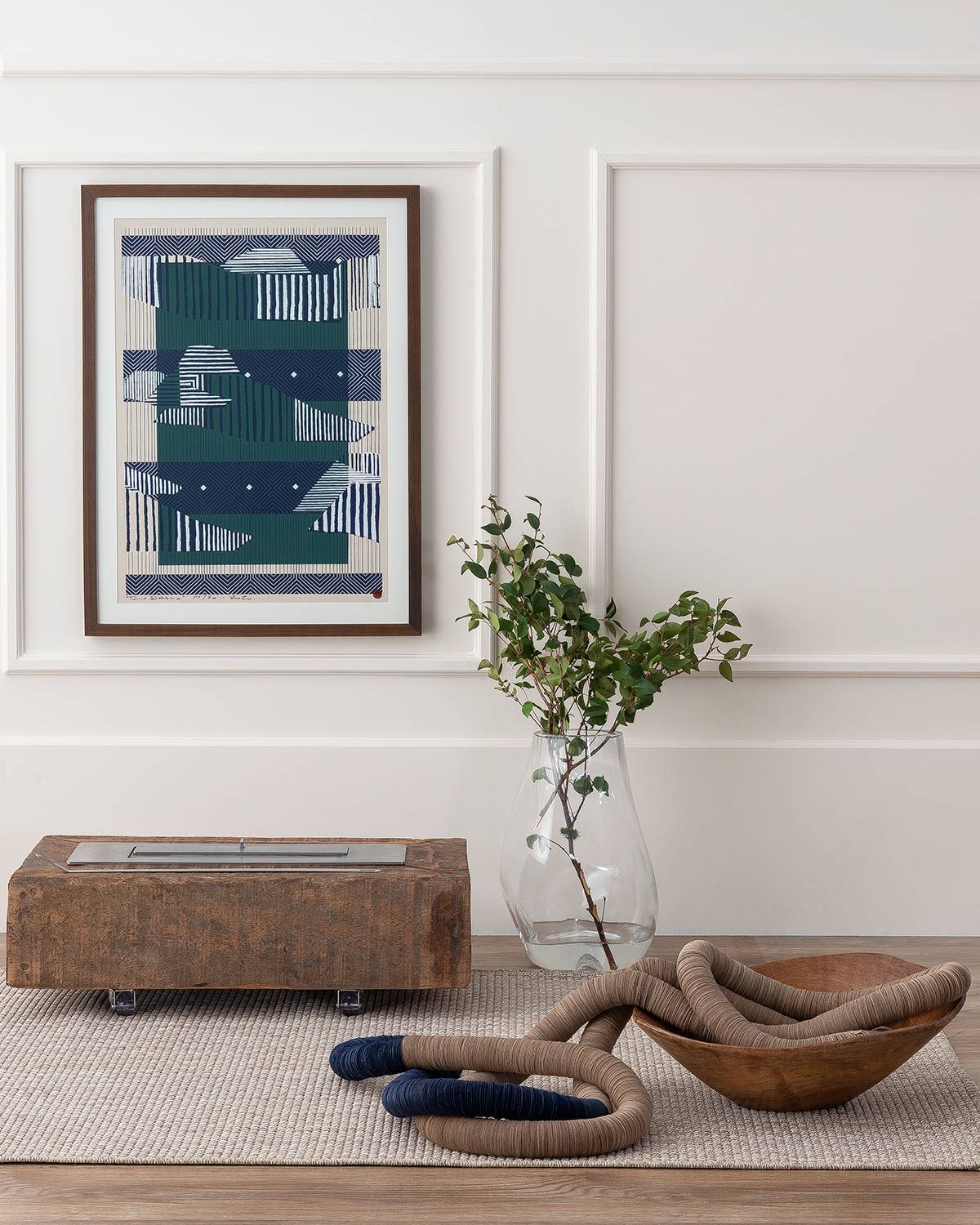 Quadro Opano; luminária Kurhi; cachepot e jarra GMA Talheres.