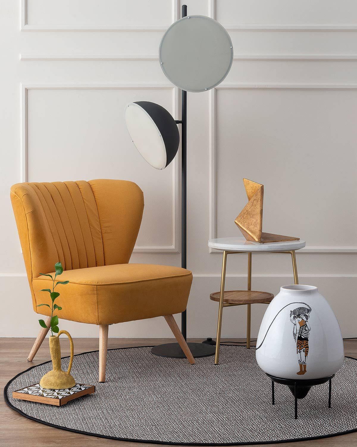 Poltrona Modali; luminária Claudia Troncon; mesa 6F; escultura dourada Studio Lopomo; vaso branco Evelyn Tannus; vaso amarelo Carol W.; bandeja Kyra Objeto; tapete Rayza Tapetes.