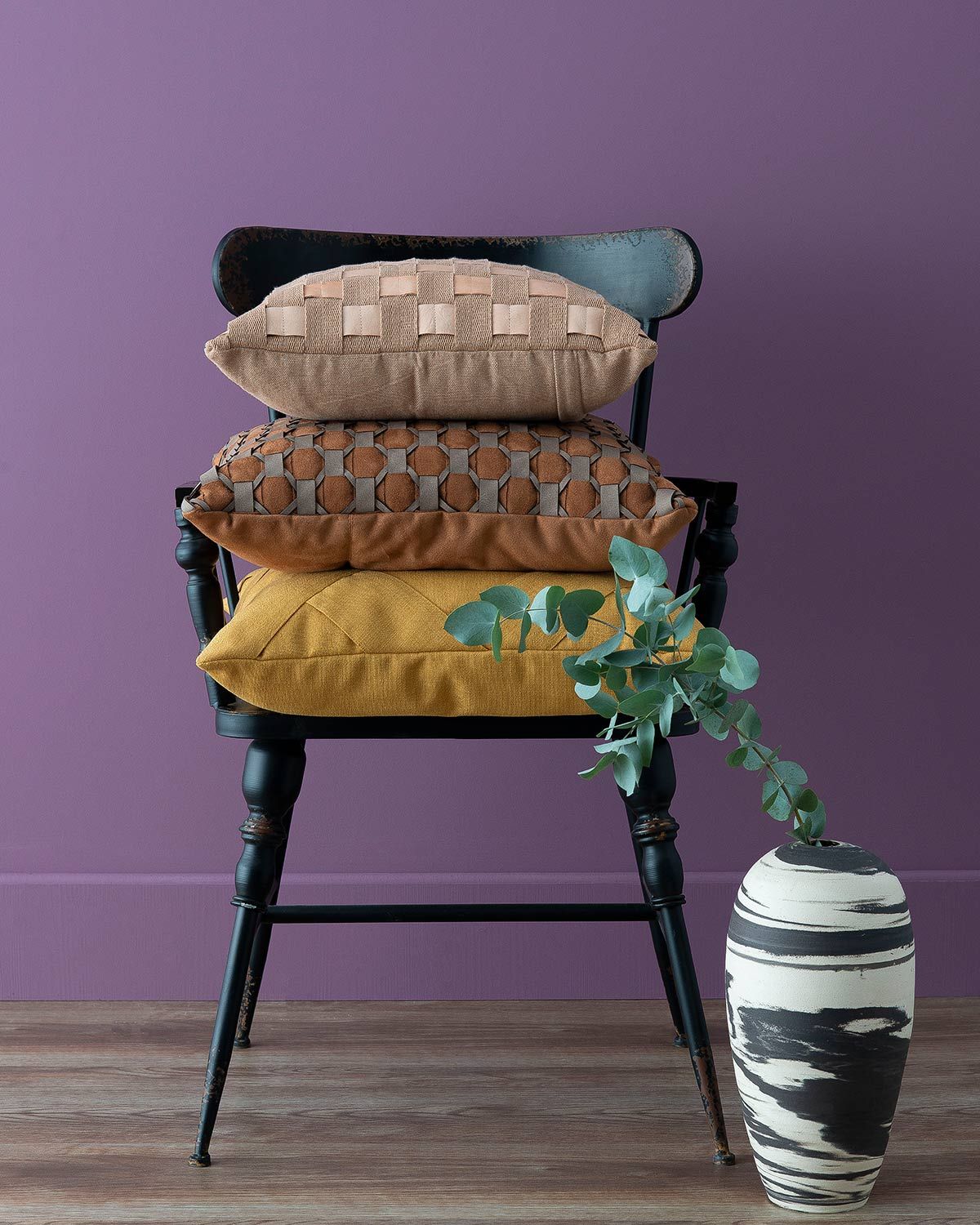 Cadeira KZ Home; vaso Dentro Design; almofada bege Santa Luzia; almofada marrom Unica; almofada amarela Ângela Missoni.