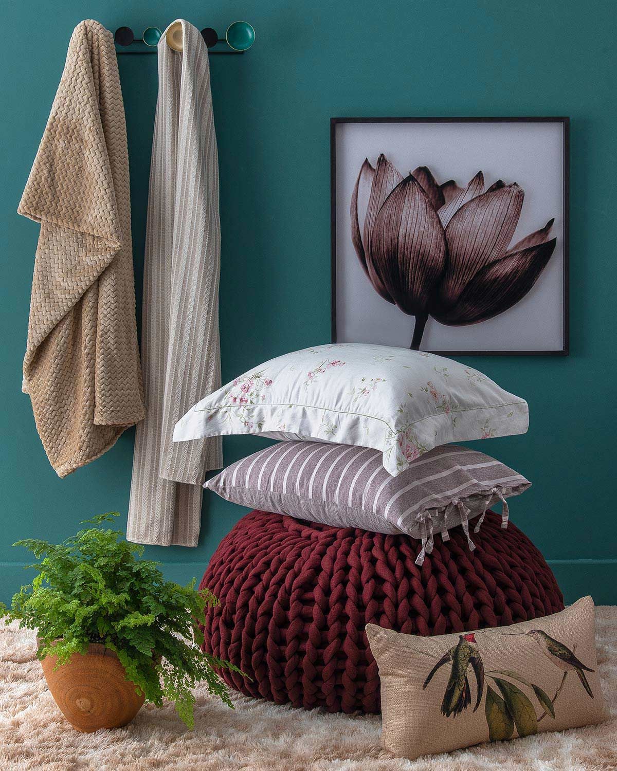 Ganchos parede Modali; manta marrom Ksatex; manta bege listrada Dahruj/Beca Decor; quadro W. Bibiano; almofada branca Scavone; almofada listrada Lavive; pufe Regina Misk; almofada pássaros Originalità; tapete Entreposto/Costa Oro; vaso Pedro Petru.