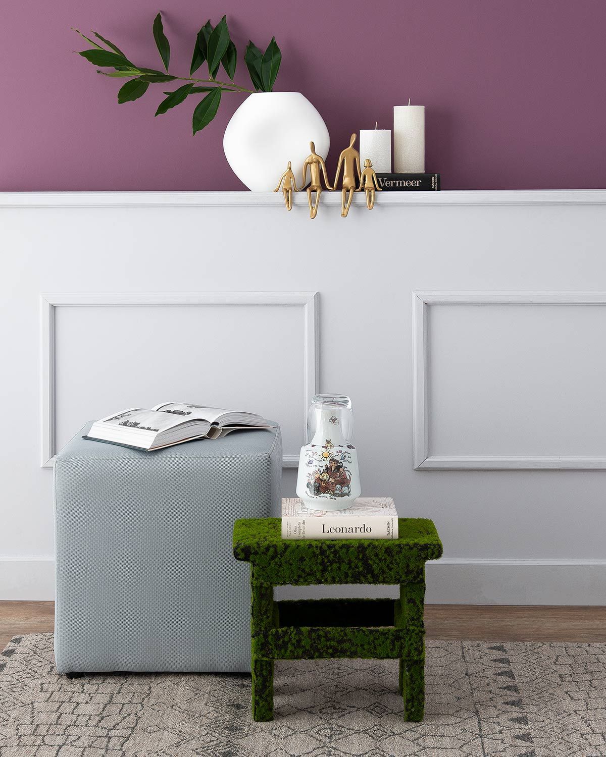 Vaso branco Ateliê Recul; escultura humanos dourados Alúmen Design; velas Senhora das Velas; livros Paisagem; puge Imetextil; moringa Atelier Patricia Virmond; banco Raízes Arranjos; tapete Tapetes Gishar.
