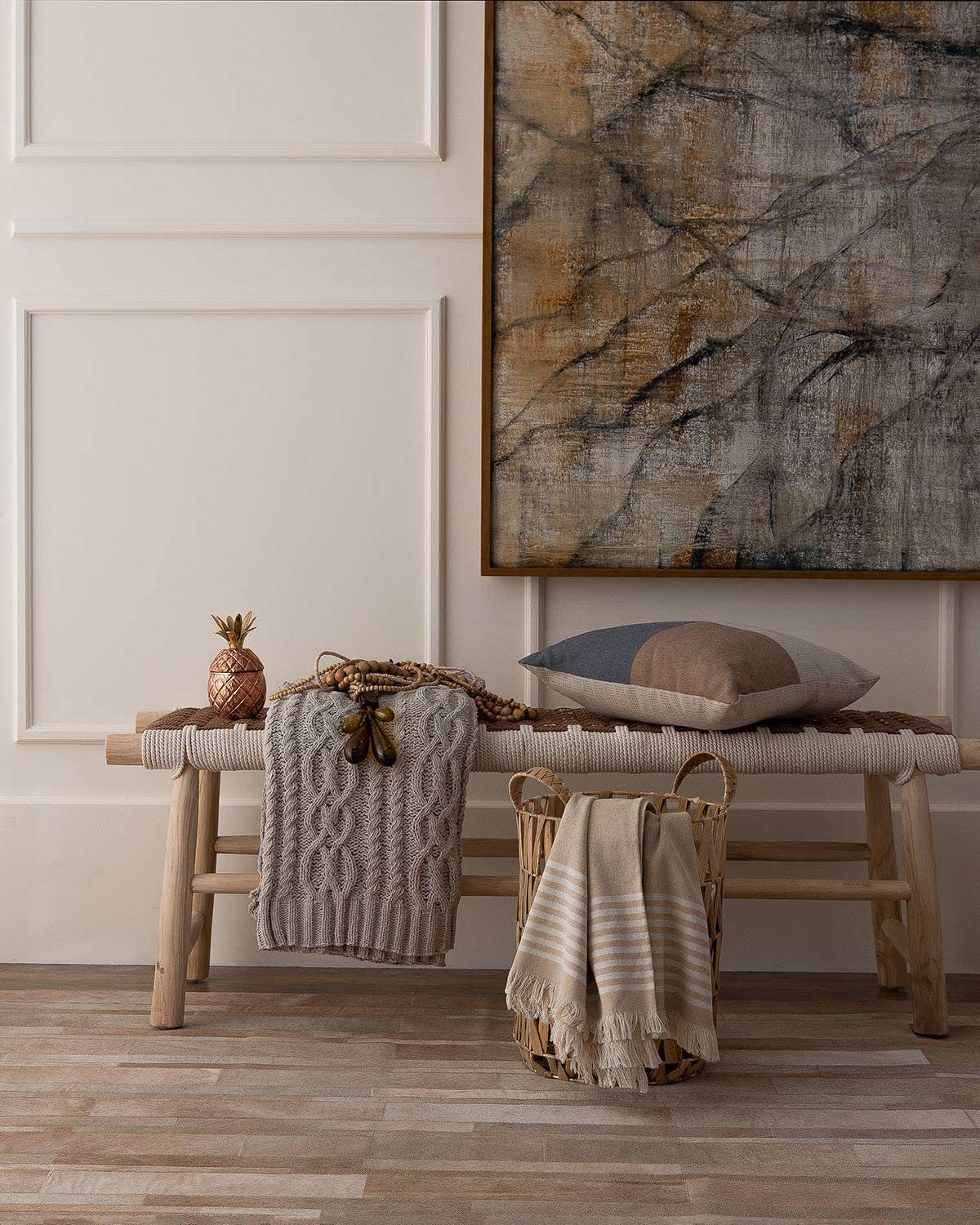 Quadro Marco Caratta Artes; banco Antica; abacaxi Apolo Pratarias; aplique Claude Decor; manta tricot Rozac; cesto Meia Luz; manta listrada e almofada Bella Janela; tapete Raro Requinte.