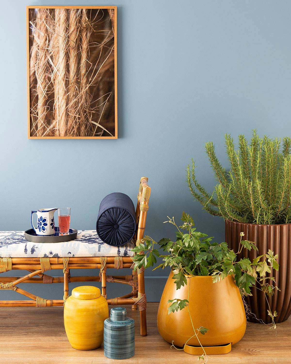 Quadro Neoali Brasil Art; banco Sweet Home; bandeja Germer; jarra Porcelana Monte Sião; copo Bella Vita; vasos amarelo e azul Luiz Salvador; vasos grandes laranja e marrom Vasart.