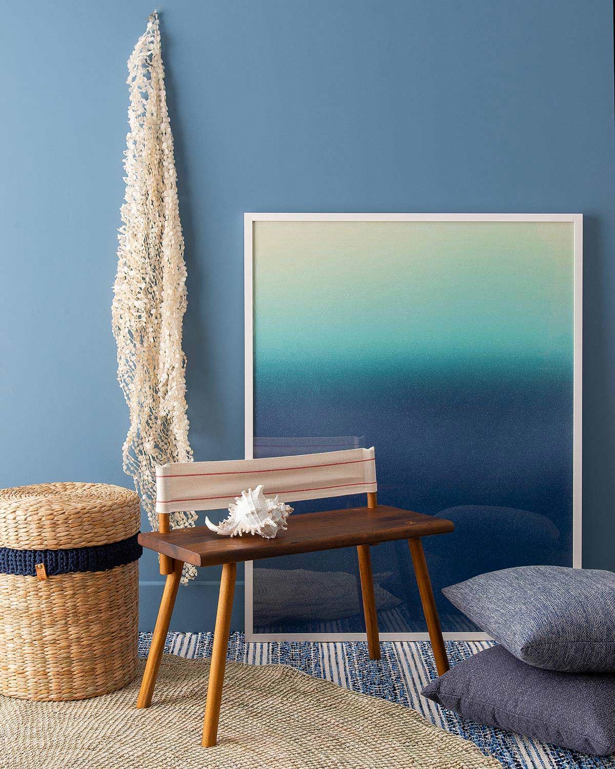 Quadro Tomarello; aplique Mônica Carvalho; banco Wet&Wood; concha Asia Connection; almofadas Cortbrás; tapete redondo Estúdio Avelós e Projeto Sertões; cesto e tapete azul A Oficina da Roça.
