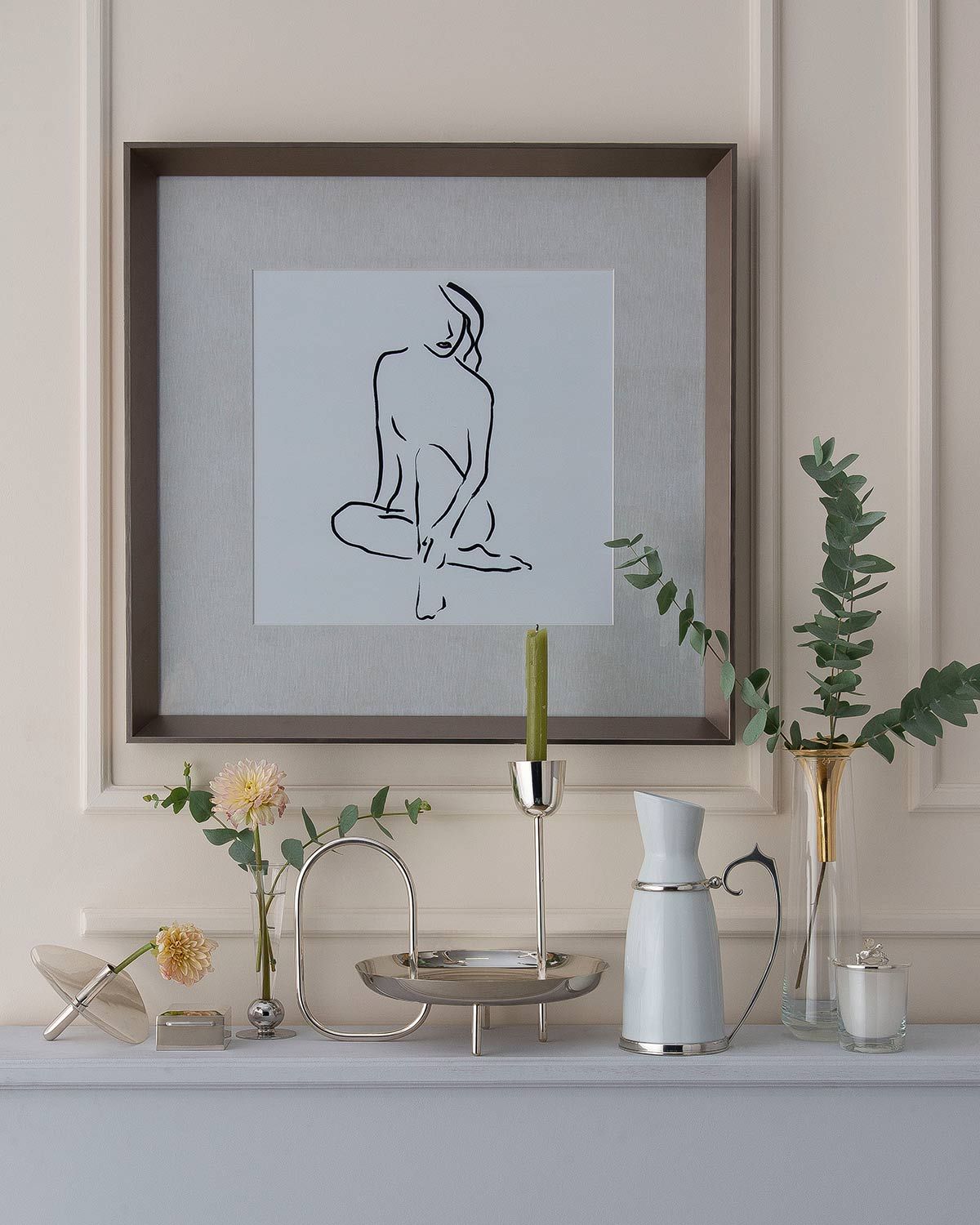 Quadro Artimage;  porta-treco Prataria Robles; vaso bola prata Orfevrerie Royale; vaso e bandeja com castição St. James; jarra Design by Somers; vaso transparente e dourado Riva; porta-velas Shefield Plate.