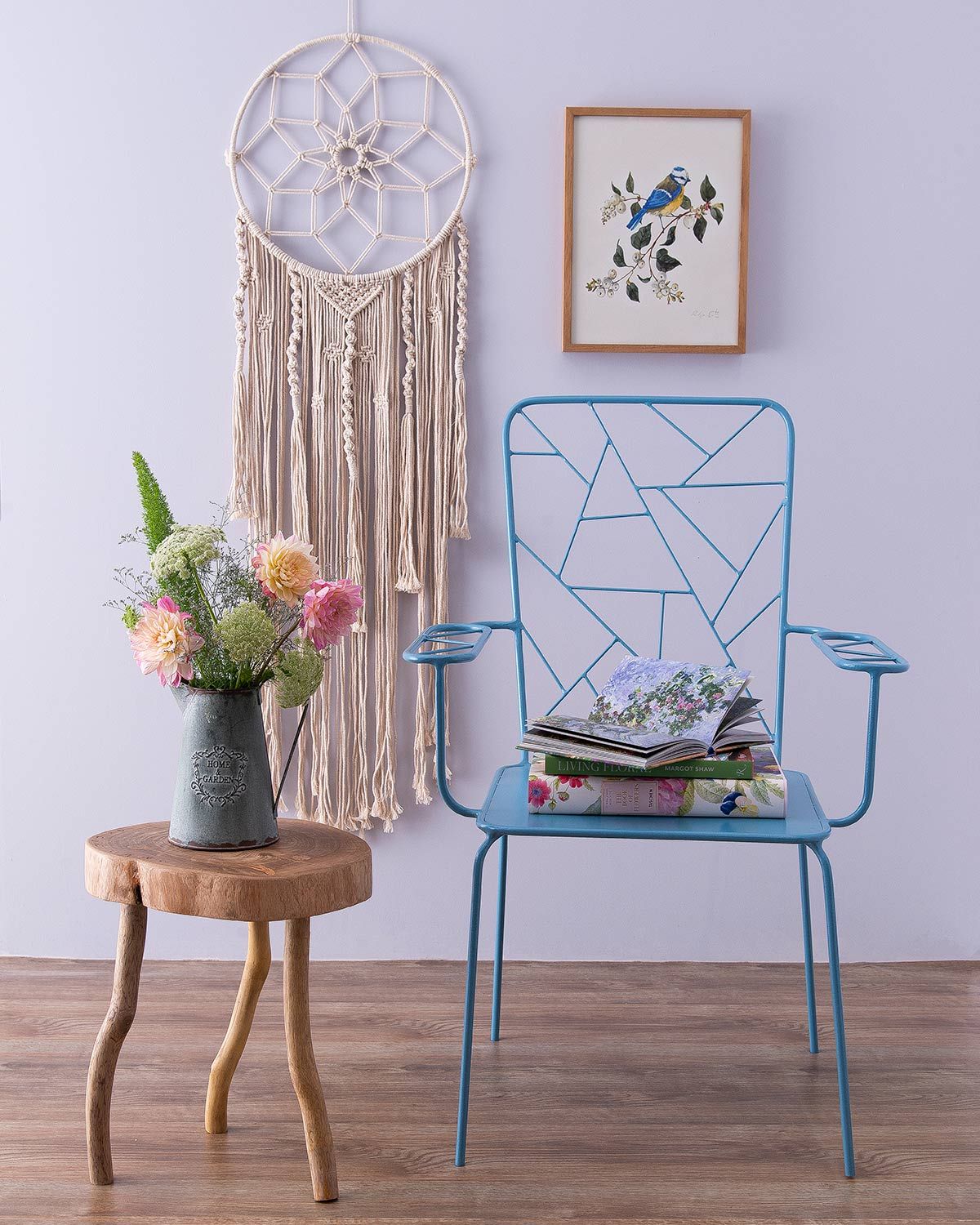Cadeira azul Manu Fish; livros Queen Books; quadro BR Frames; macramê Casa Mundo; banco tronco Marco 500; vaso Home&Garden.