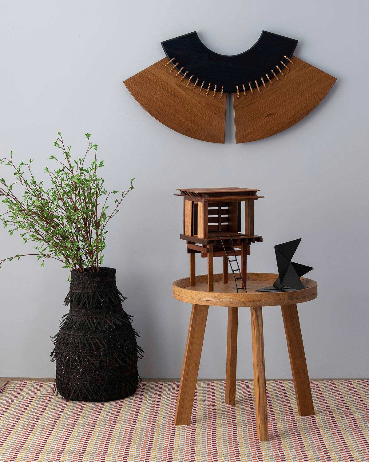 Escultura parede Sasai; mesa Thay Thay Home; escultura casa Ted Benvenutti; escultura preta Estúdio Mameluca; vaso Casa Bonita; tapete Marka Têxtil.