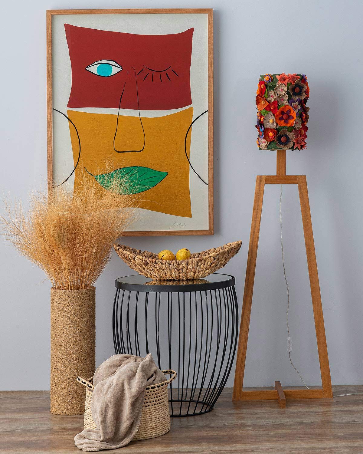 Quadro BR Frames; luminária e vaso Sebrae ES; mesa e cesto Casa Bonita; fruteira The Home; manta Corttex.