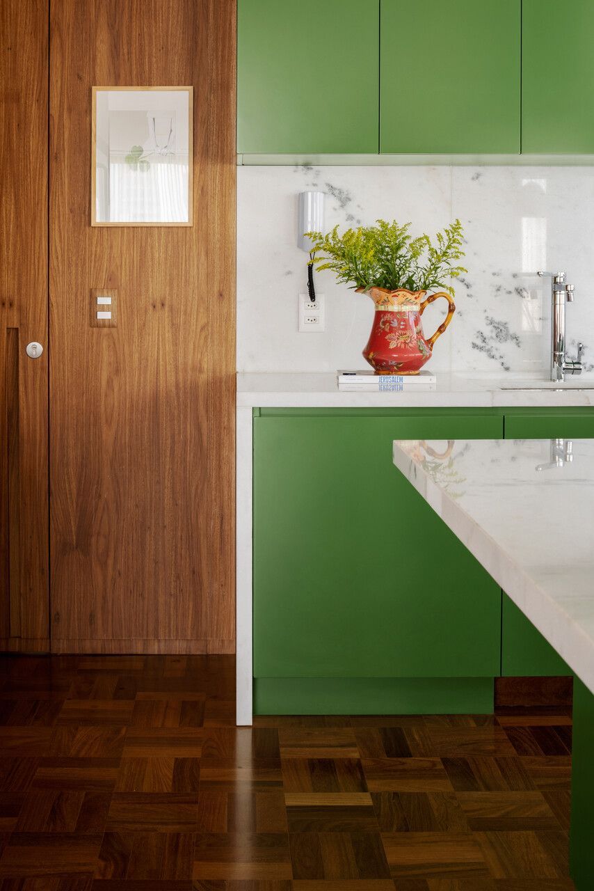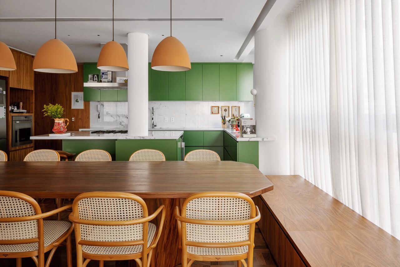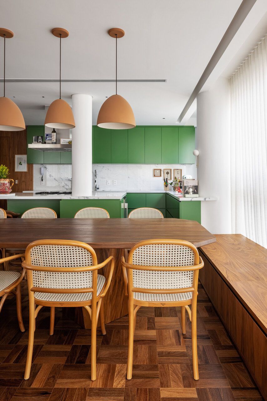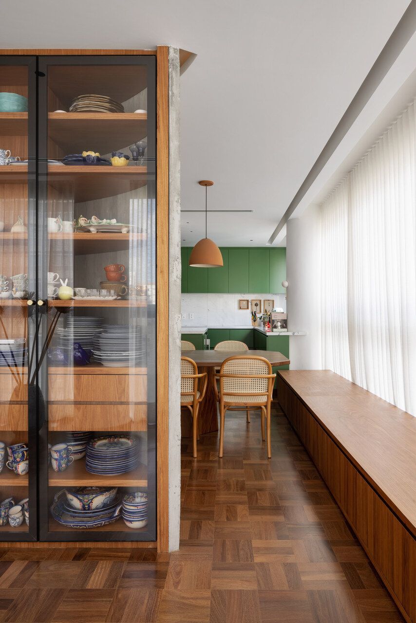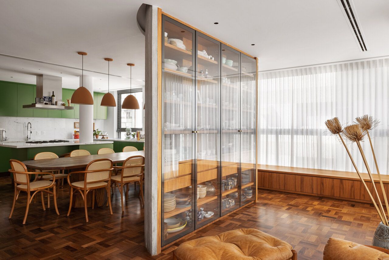 Lara queria tornar realidade o sonho de um lar colorido e cheio de energia, com uma pegada vintage e contemporânea. O apartamento tem o mesmo piso de taco, inclusive na cozinha, numa paginação um pouco diferente da clássica em diagonal. Um dos destaques do projeto é o pilar, que virou cristaleira e guarda as diversas peças que Lara tem.