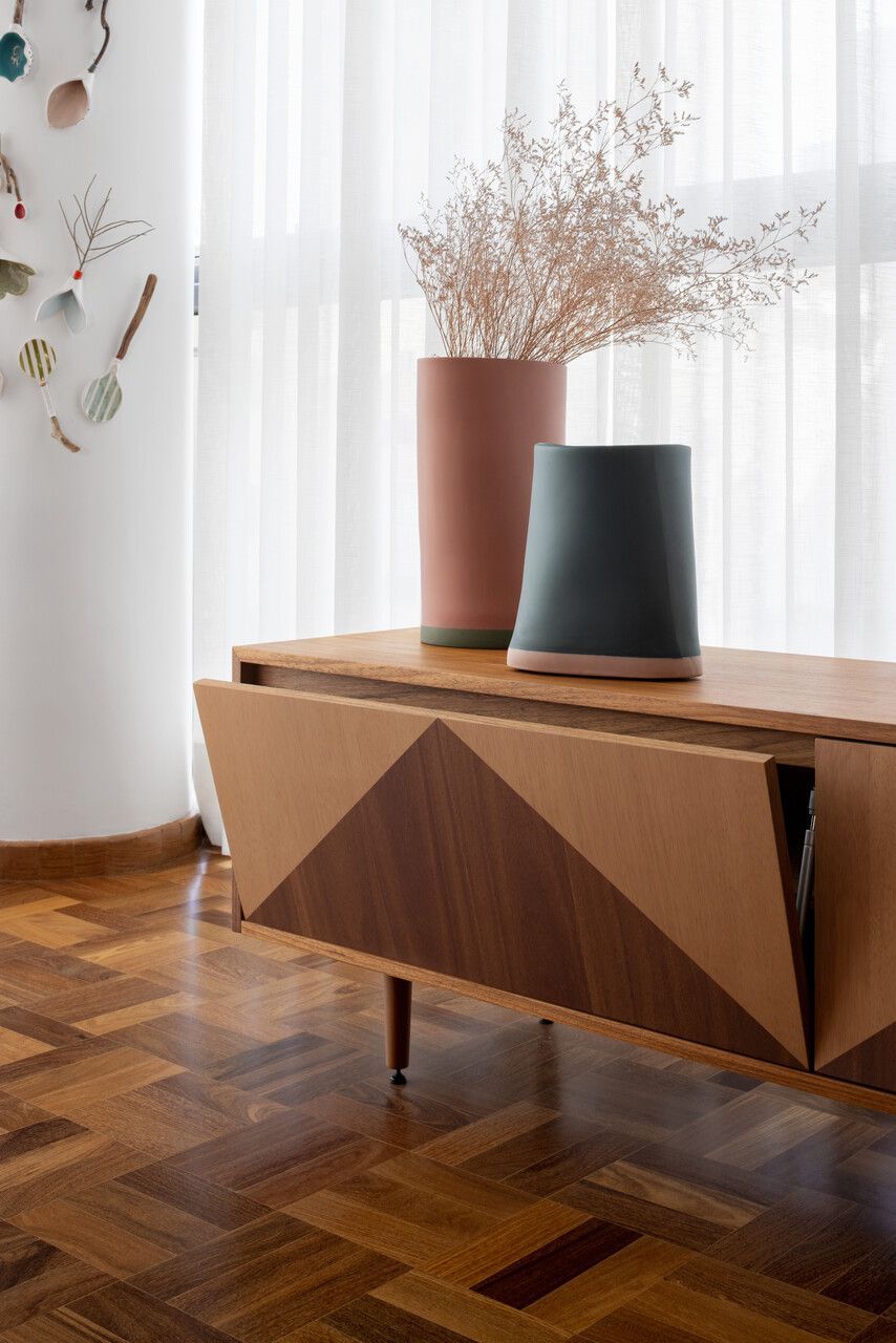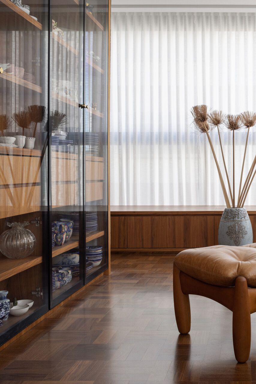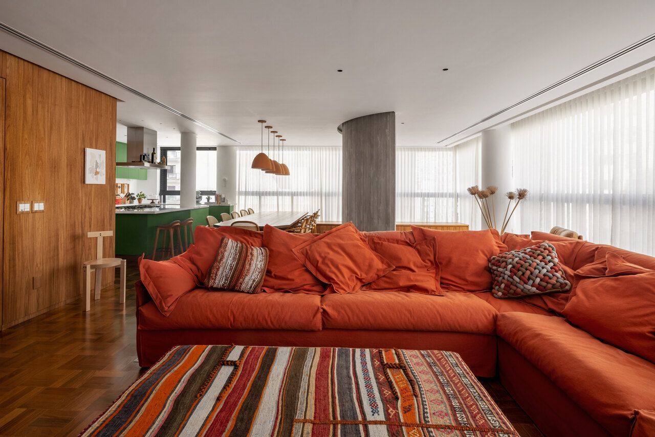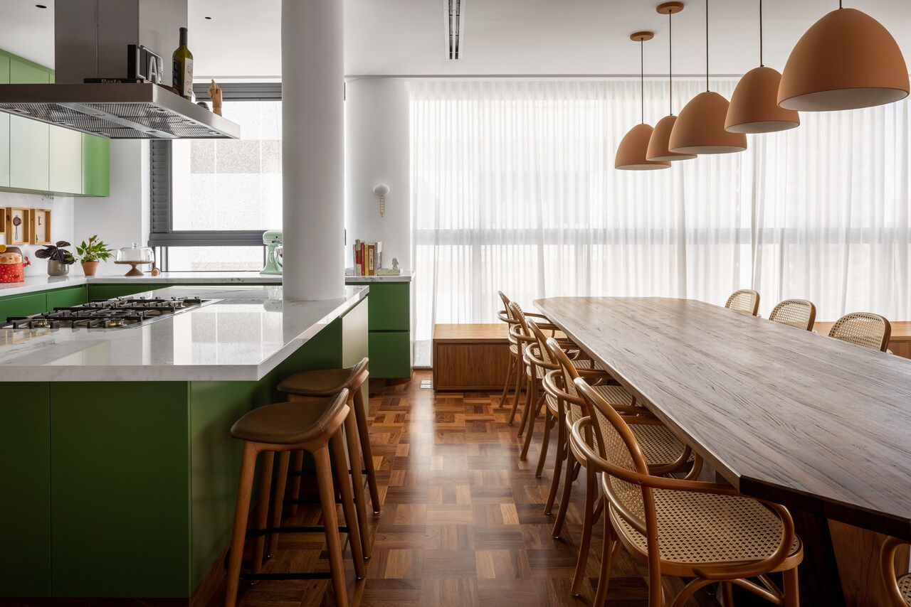 Lara queria tornar realidade o sonho de um lar colorido e cheio de energia, com uma pegada vintage e contemporânea. O apartamento tem o mesmo piso de taco, inclusive na cozinha, numa paginação um pouco diferente da clássica em diagonal. Um dos destaques do projeto é o pilar, que virou cristaleira e guarda as diversas peças que Lara tem.