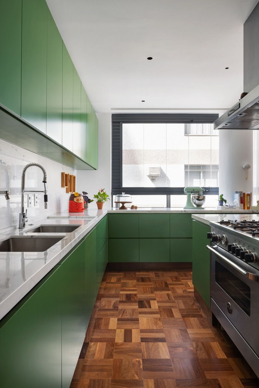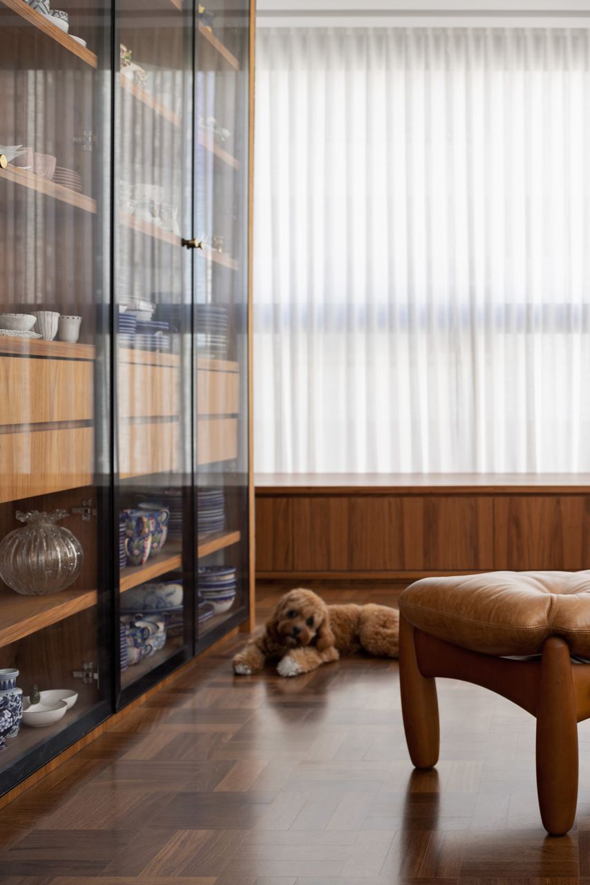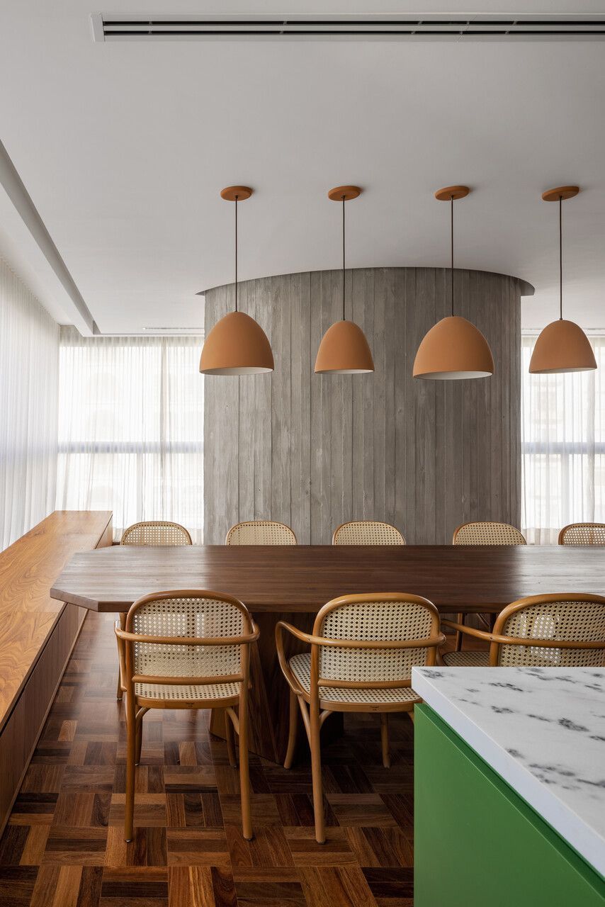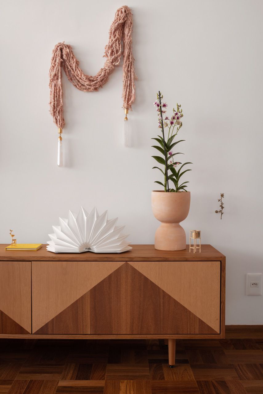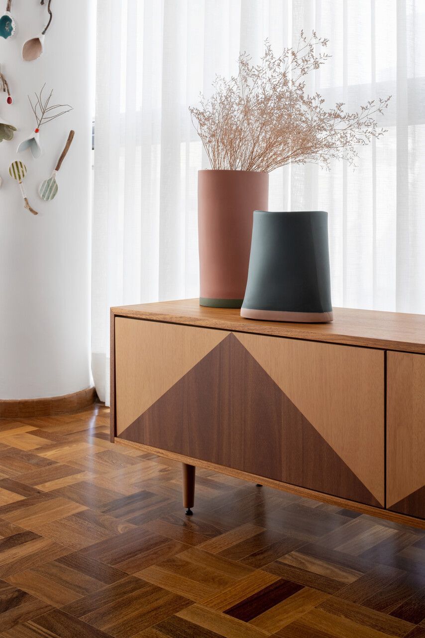 Lara queria tornar realidade o sonho de um lar colorido e cheio de energia, com uma pegada vintage e contemporânea. O apartamento tem o mesmo piso de taco, inclusive na cozinha, numa paginação um pouco diferente da clássica em diagonal. Um dos destaques do projeto é o pilar, que virou cristaleira e guarda as diversas peças que Lara tem.