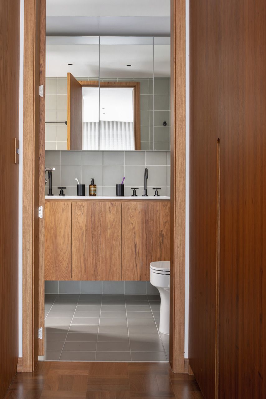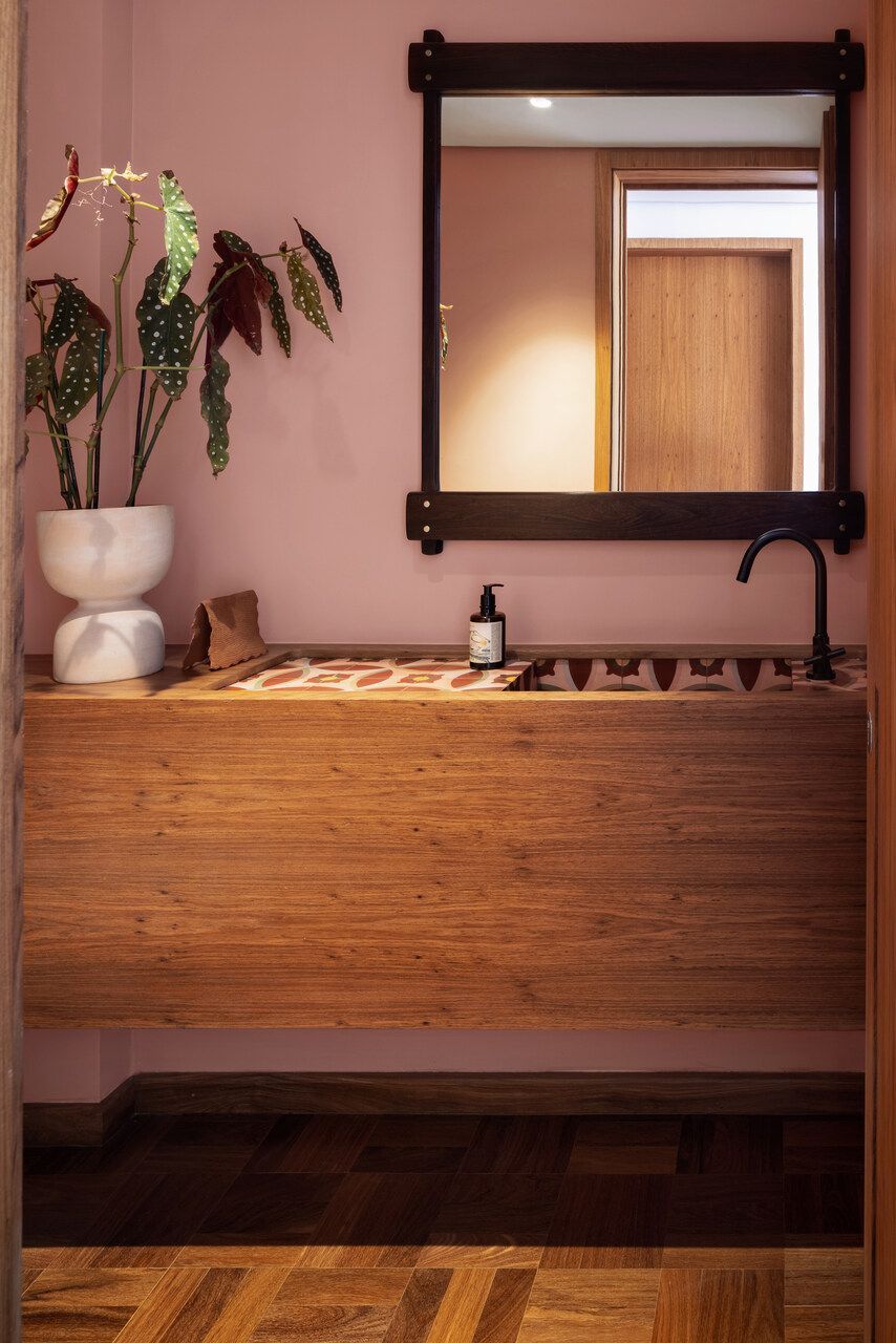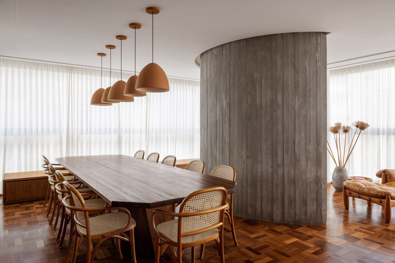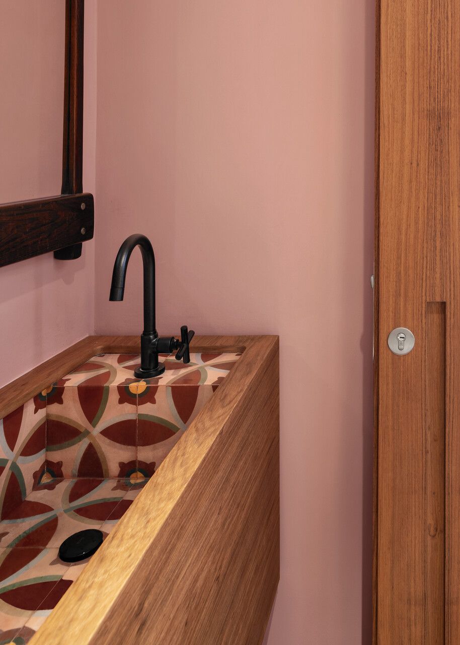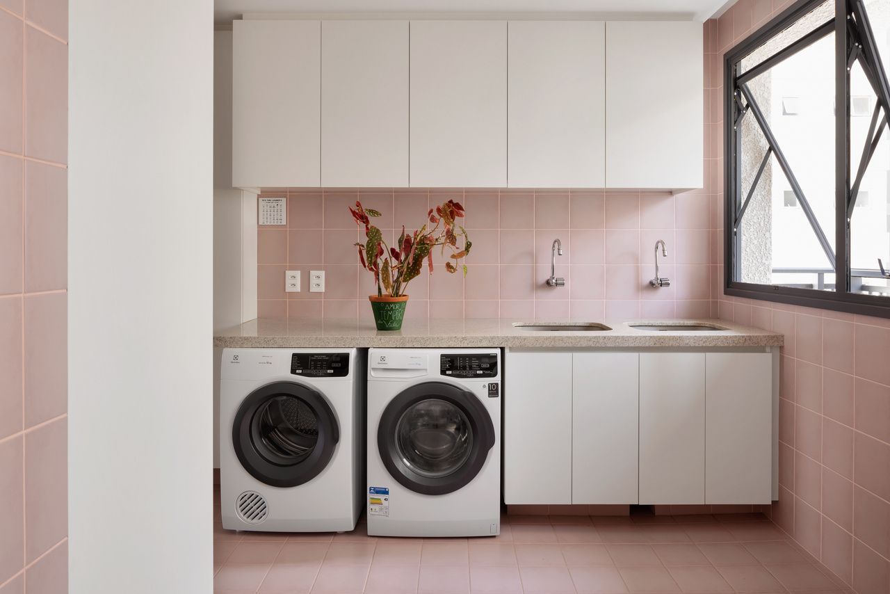 Lara queria tornar realidade o sonho de um lar colorido e cheio de energia, com uma pegada vintage e contemporânea. O apartamento tem o mesmo piso de taco, inclusive na cozinha, numa paginação um pouco diferente da clássica em diagonal. Um dos destaques do projeto é o pilar, que virou cristaleira e guarda as diversas peças que Lara tem.