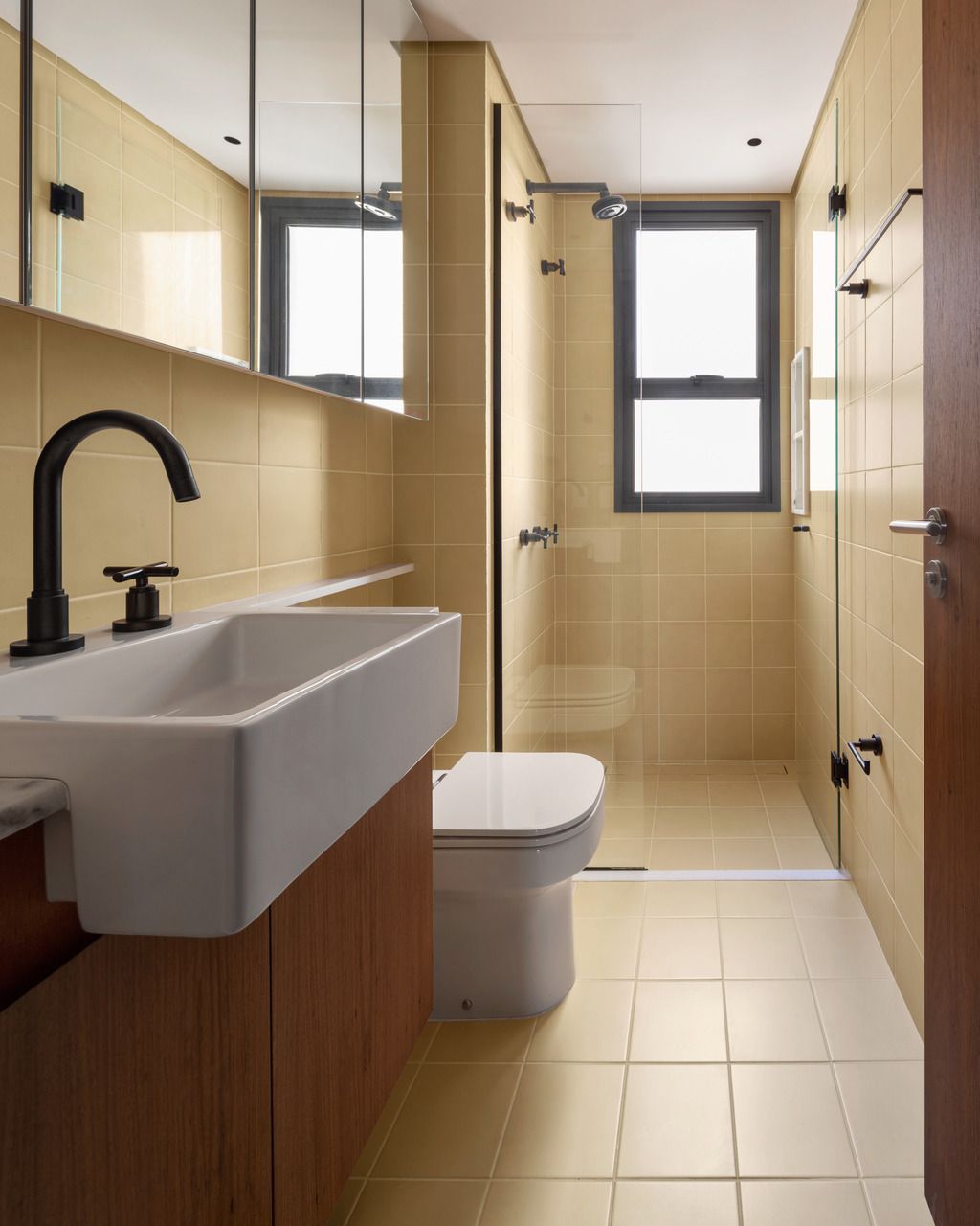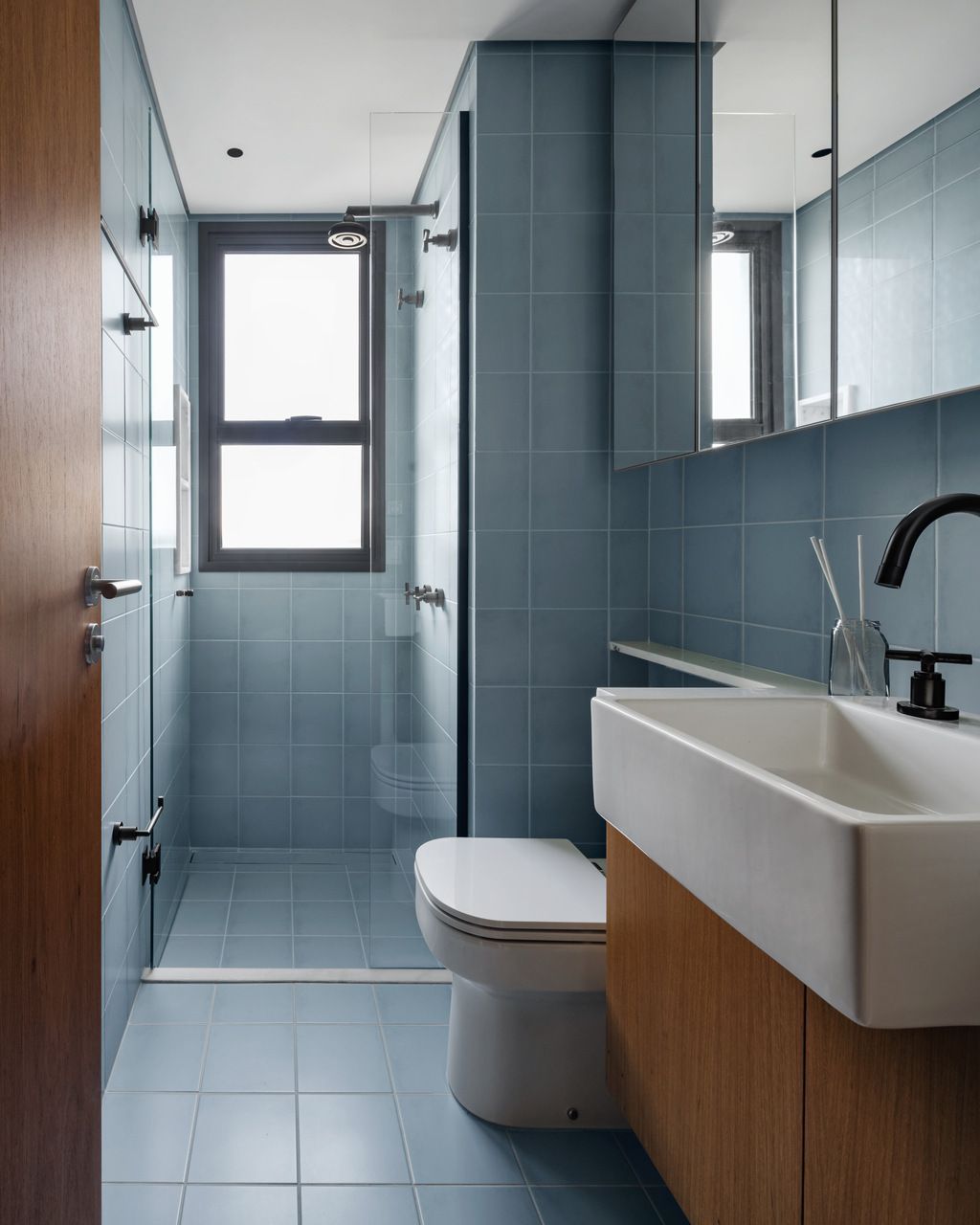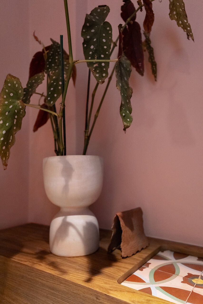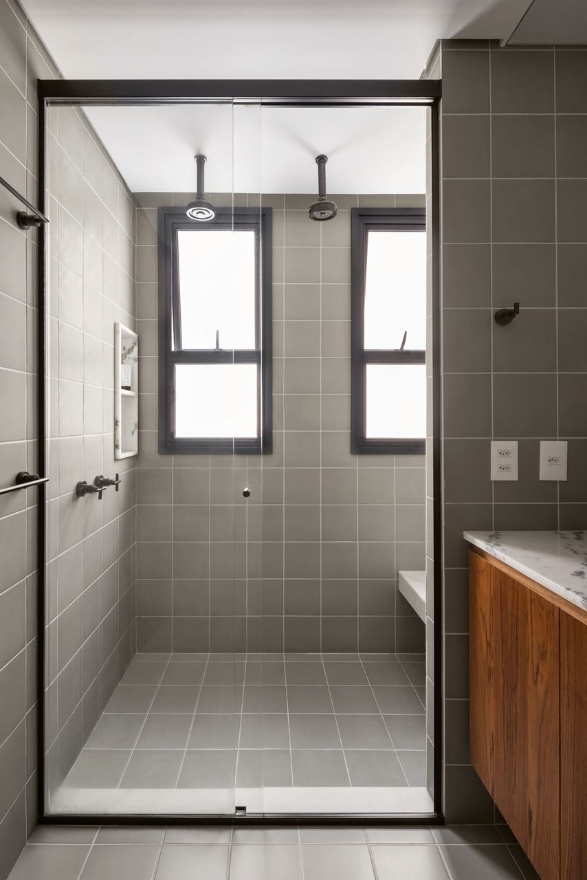 Lara queria tornar realidade o sonho de um lar colorido e cheio de energia, com uma pegada vintage e contemporânea. O apartamento tem o mesmo piso de taco, inclusive na cozinha, numa paginação um pouco diferente da clássica em diagonal. Um dos destaques do projeto é o pilar, que virou cristaleira e guarda as diversas peças que Lara tem.