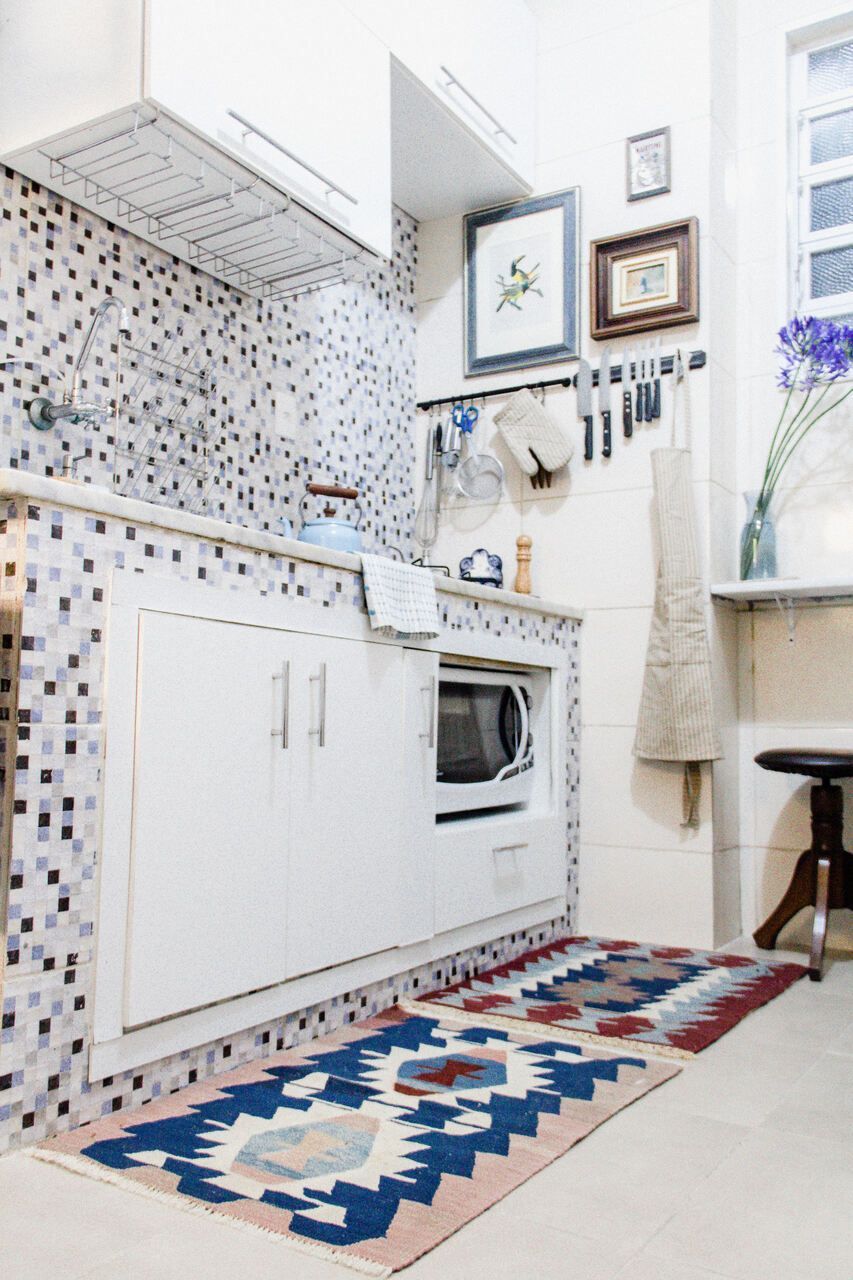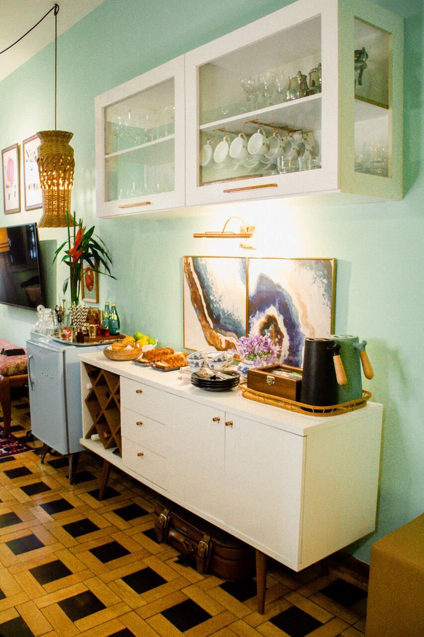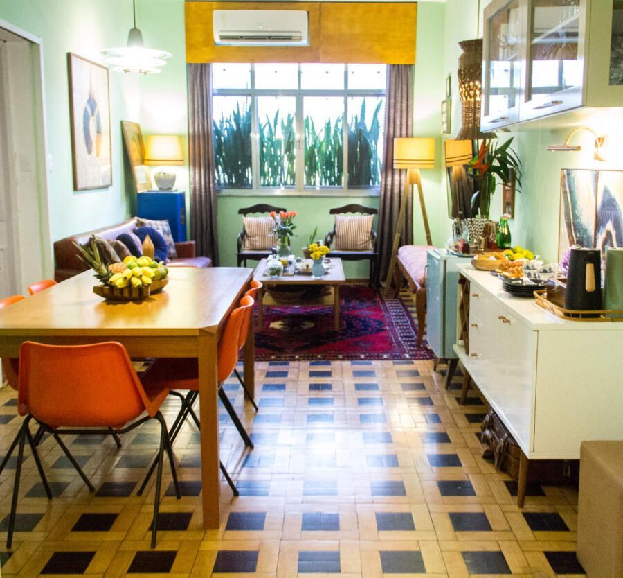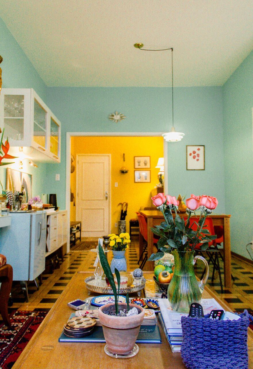 É claro que o resultado não poderia ser diferente: uma visita descontraída, mostrando todo o seu apê colorido e repleto de garimpo, e colhendo referências valiosas de cada cantinho do projeto de 94m2. É difícil acreditar que a reforma completa do apartamento aconteceu em apenas 45 dias! São muitas porcelanas, recordações de viagens, tapeçarias selecionadas a dedo e mobiliários que contam histórias.