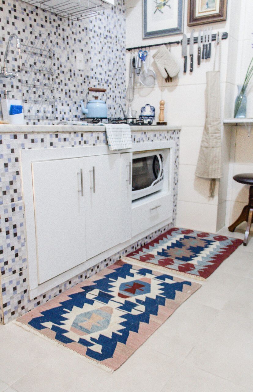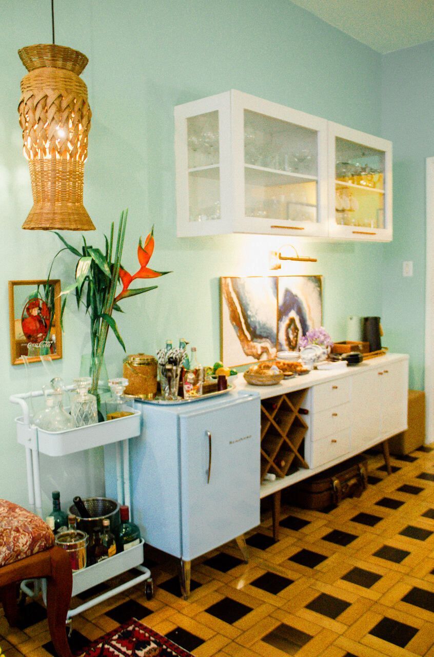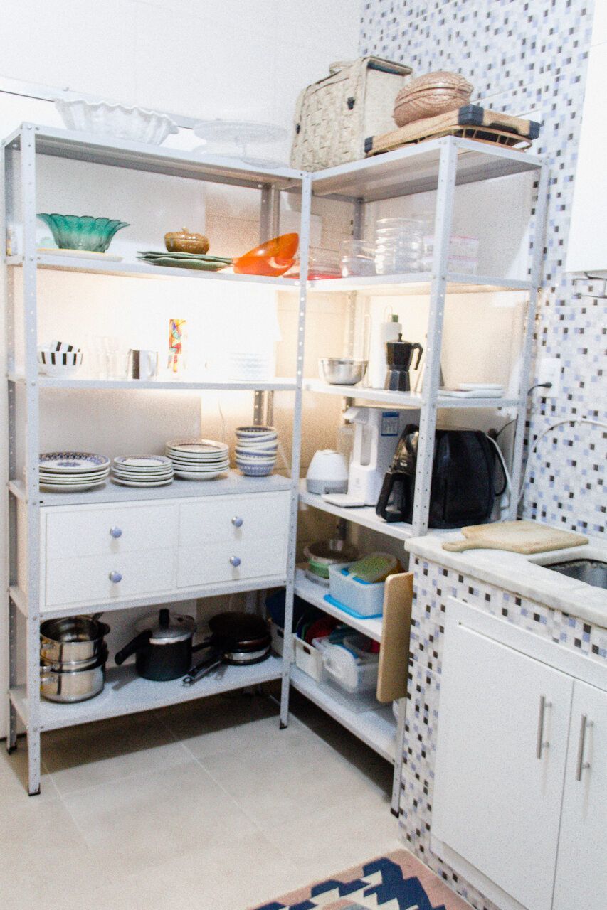 É claro que o resultado não poderia ser diferente: uma visita descontraída, mostrando todo o seu apê colorido e repleto de garimpo, e colhendo referências valiosas de cada cantinho do projeto de 94m2. É difícil acreditar que a reforma completa do apartamento aconteceu em apenas 45 dias! São muitas porcelanas, recordações de viagens, tapeçarias selecionadas a dedo e mobiliários que contam histórias.