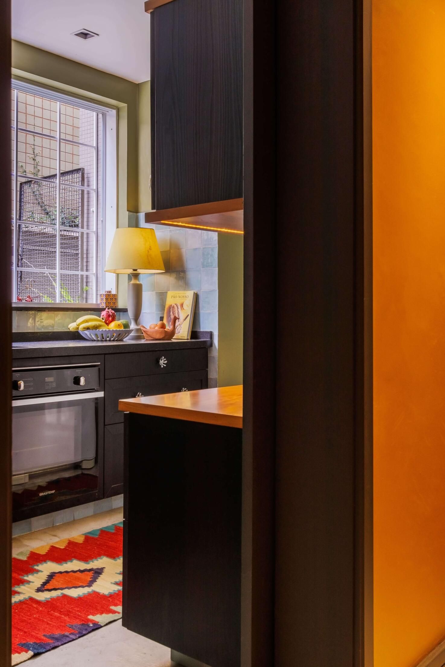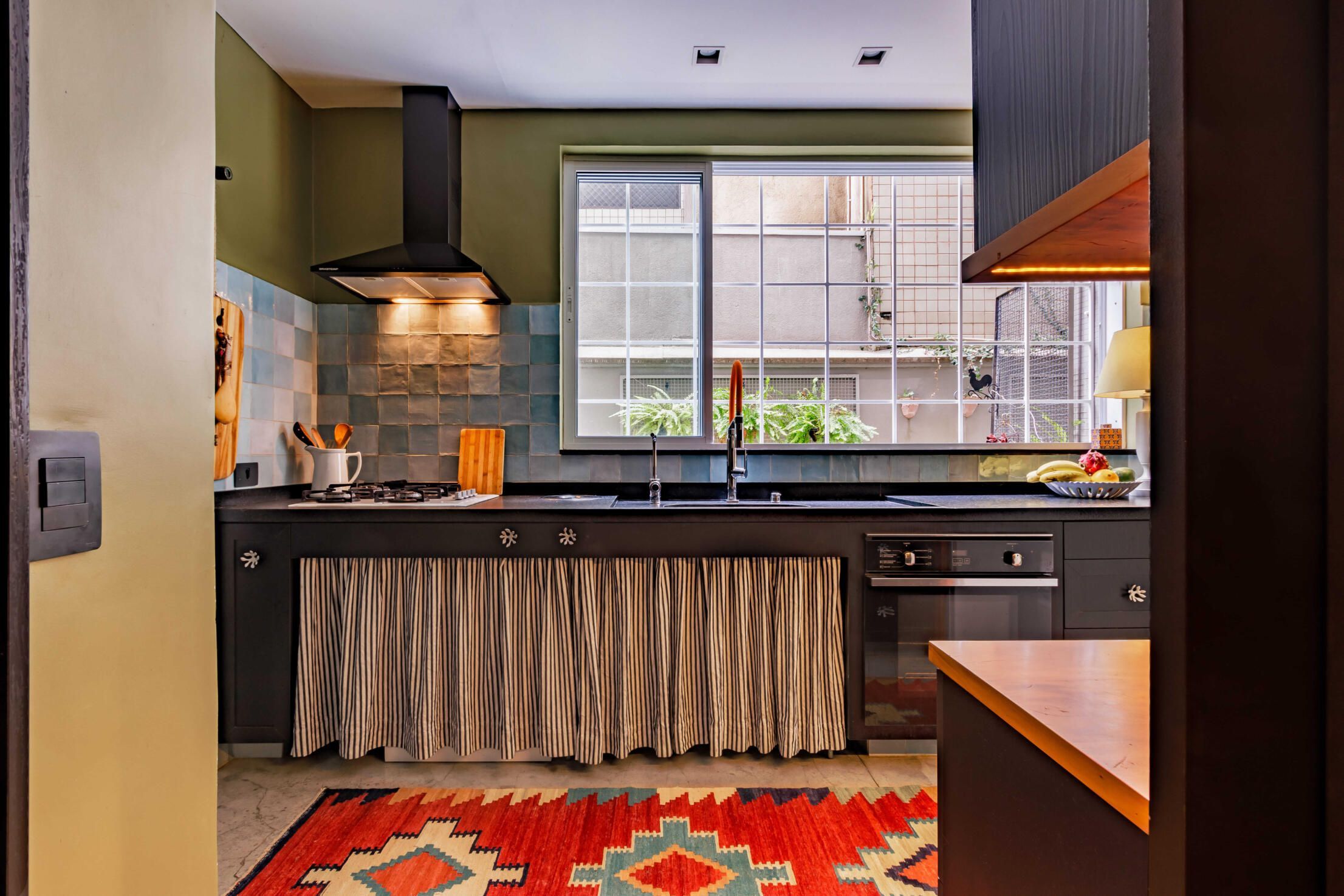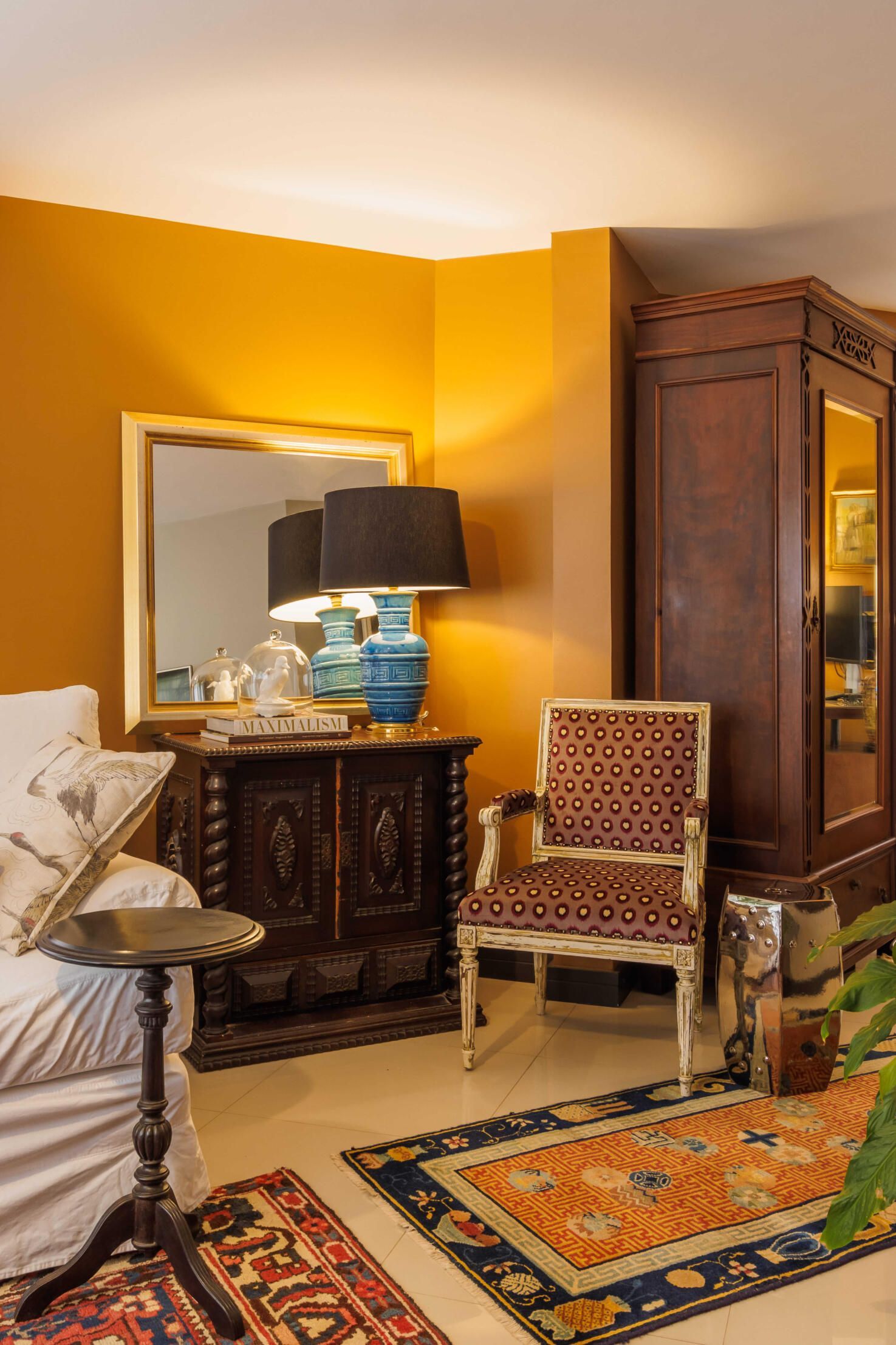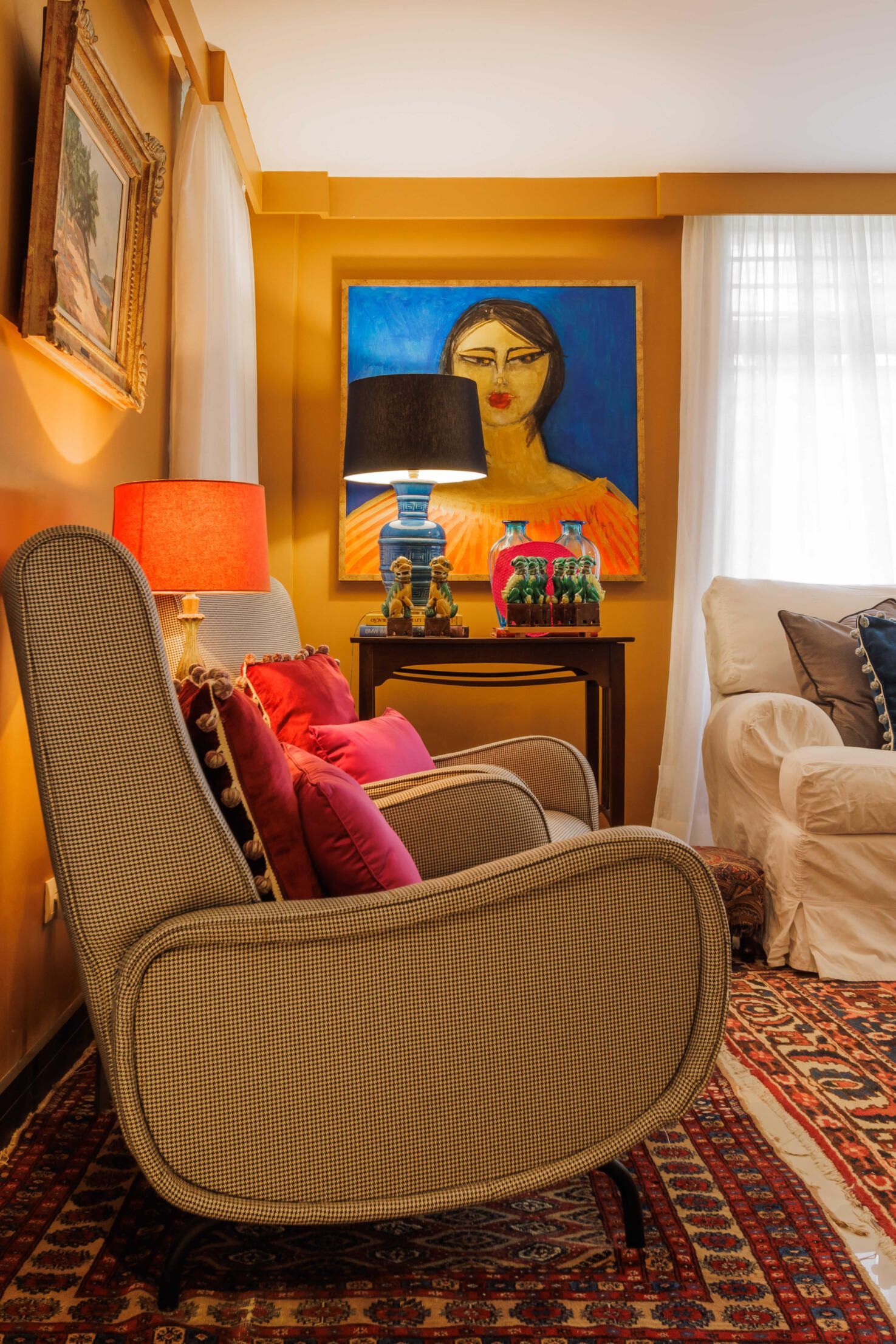 Esse projeto é fruto de muitas referências que fui construindo ao longo da minha trajetória. A curadoria de peças, principalmente os tapetes e decoração, mobiliário herdado de família, peças novas criando esse contraponto e trazendo essa união de estéticas. Fugi ao máximo do bege curitibano.