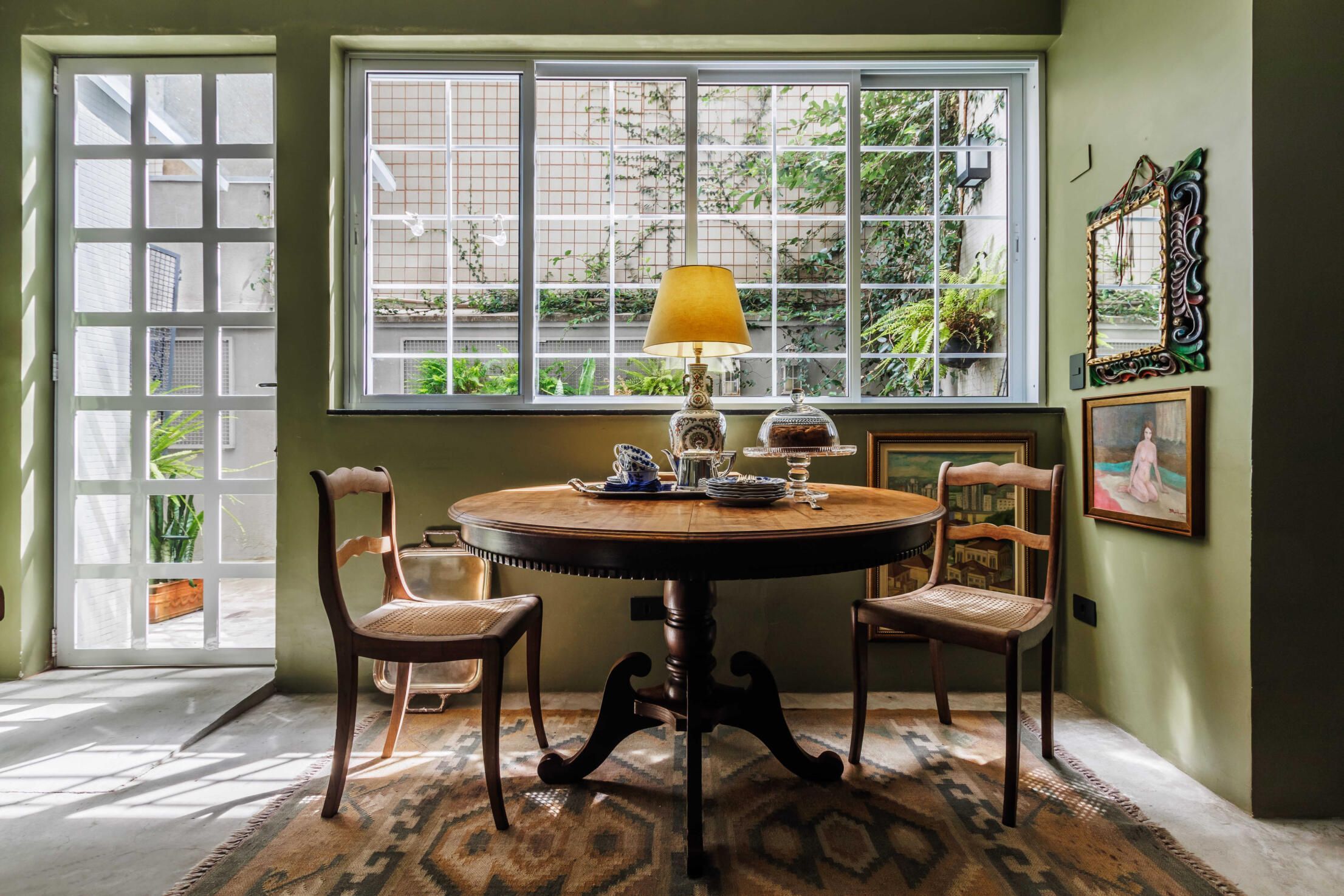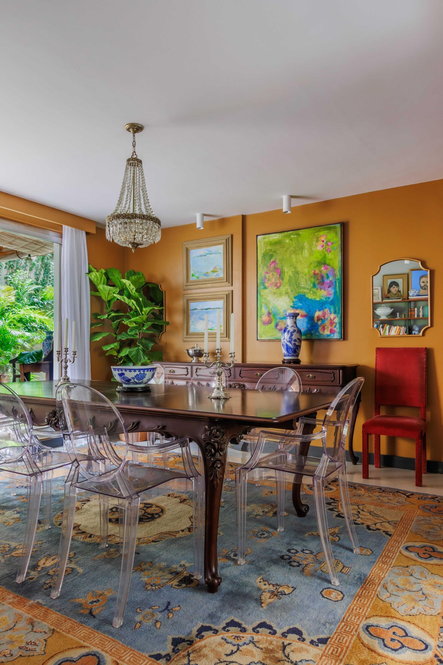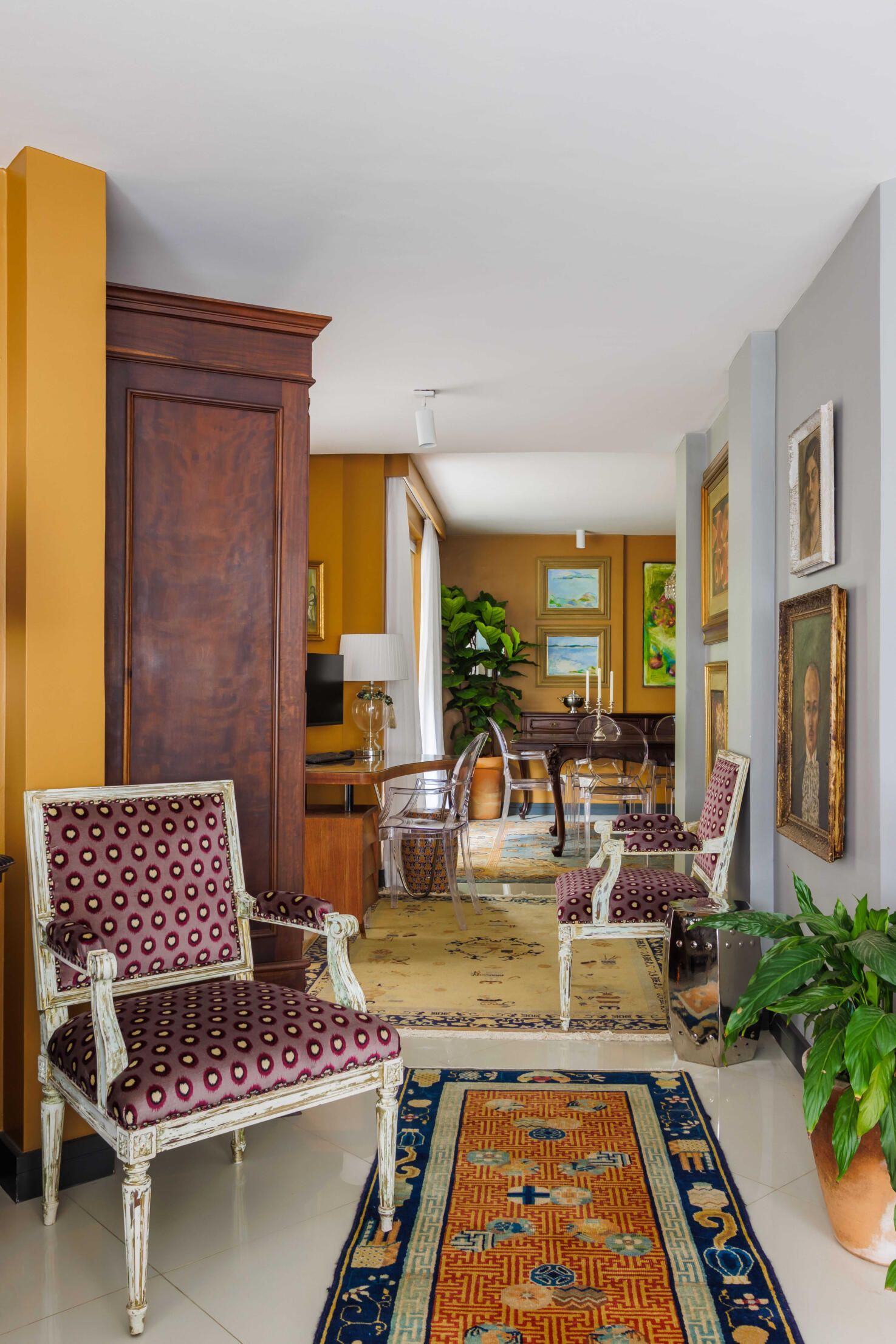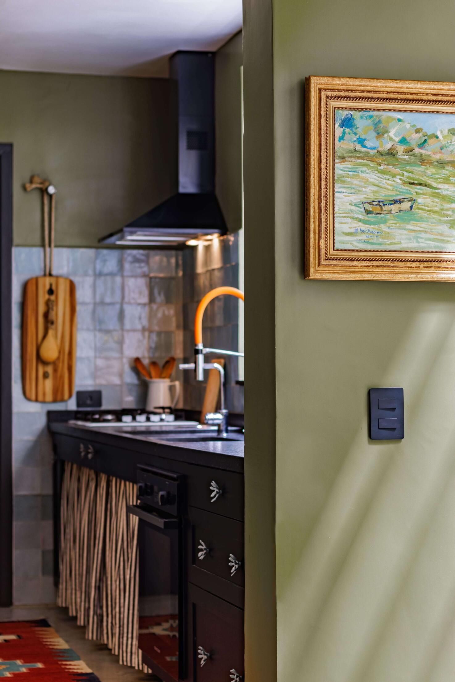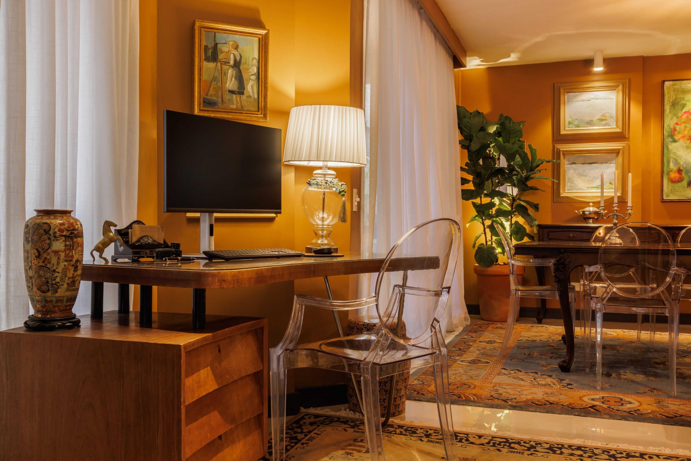 Esse projeto é fruto de muitas referências que fui construindo ao longo da minha trajetória. A curadoria de peças, principalmente os tapetes e decoração, mobiliário herdado de família, peças novas criando esse contraponto e trazendo essa união de estéticas. Fugi ao máximo do bege curitibano.
