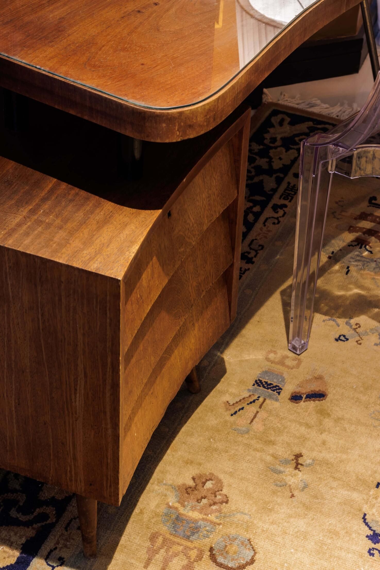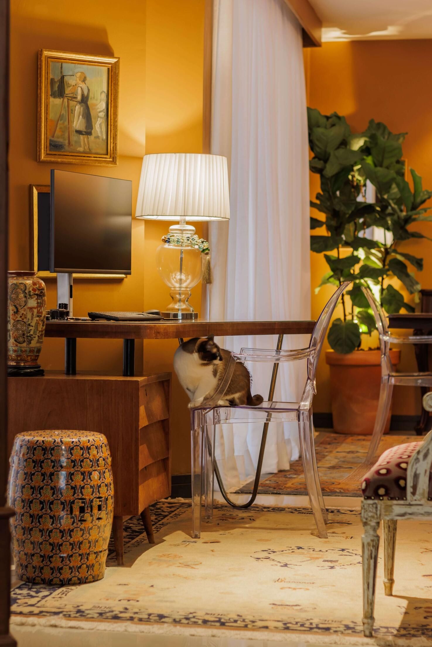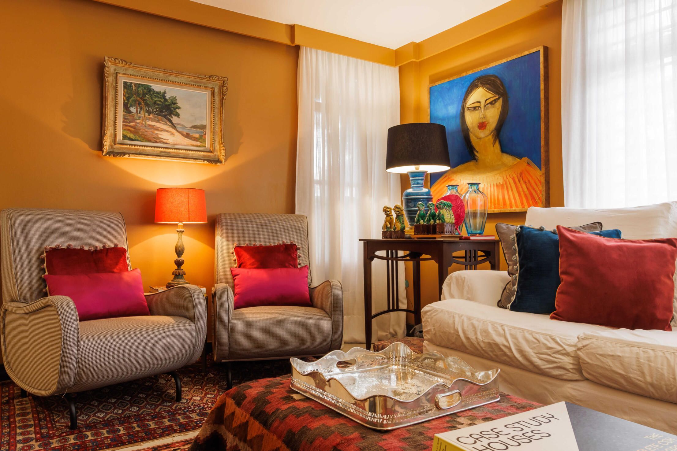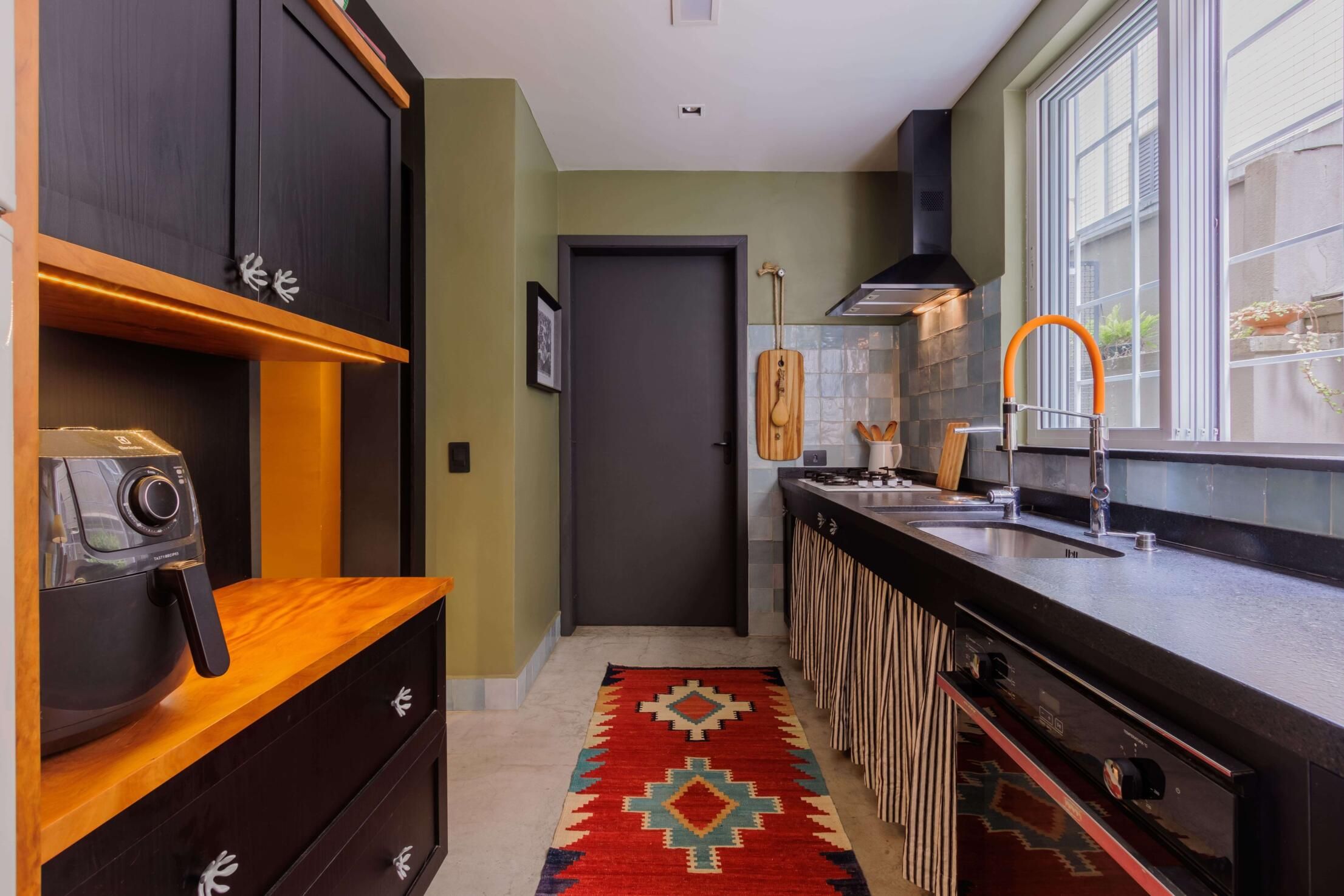 Esse projeto é fruto de muitas referências que fui construindo ao longo da minha trajetória. A curadoria de peças, principalmente os tapetes e decoração, mobiliário herdado de família, peças novas criando esse contraponto e trazendo essa união de estéticas. Fugi ao máximo do bege curitibano.