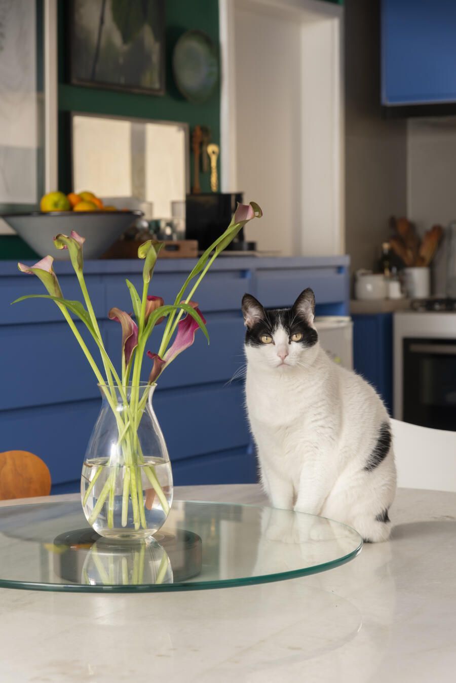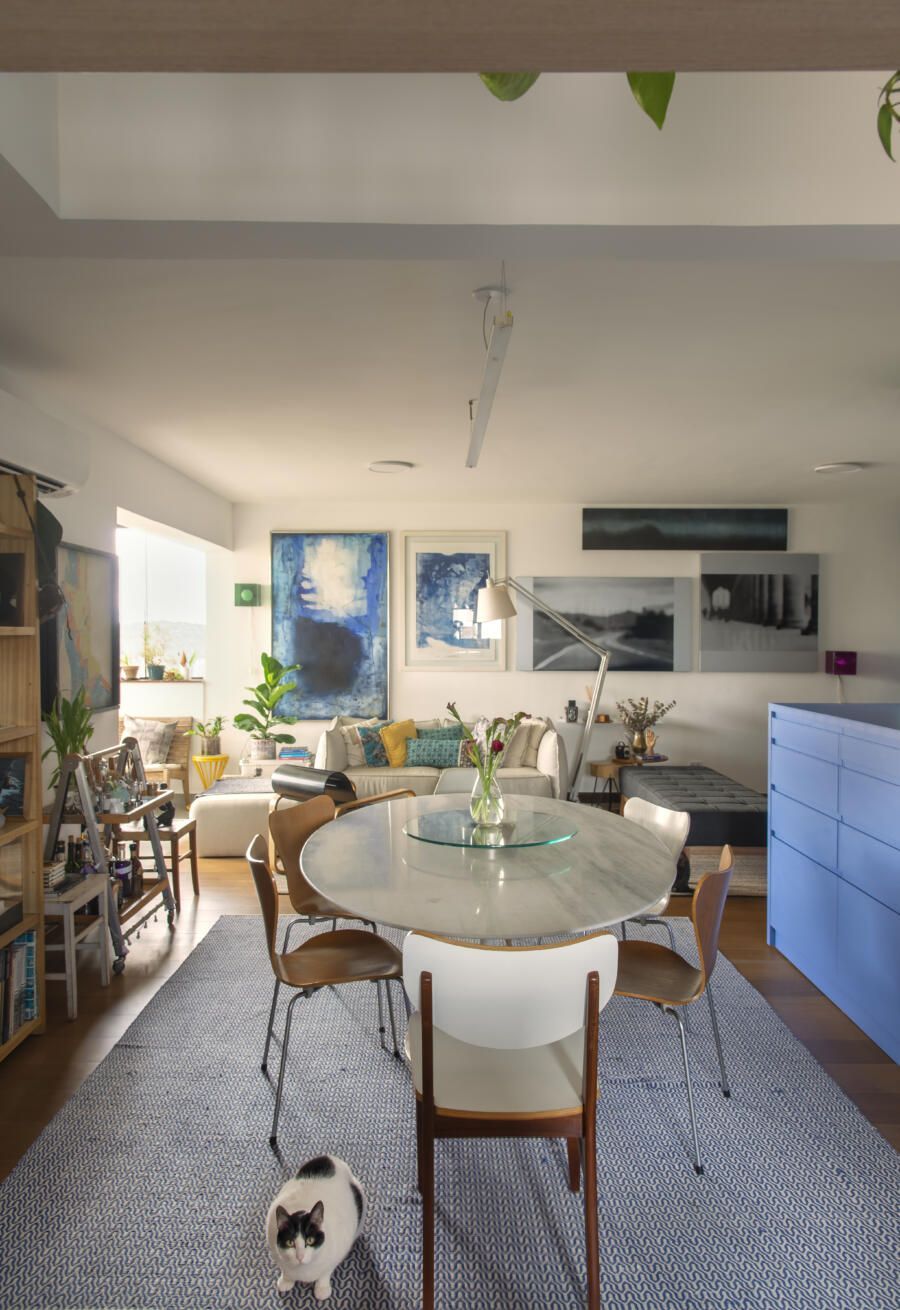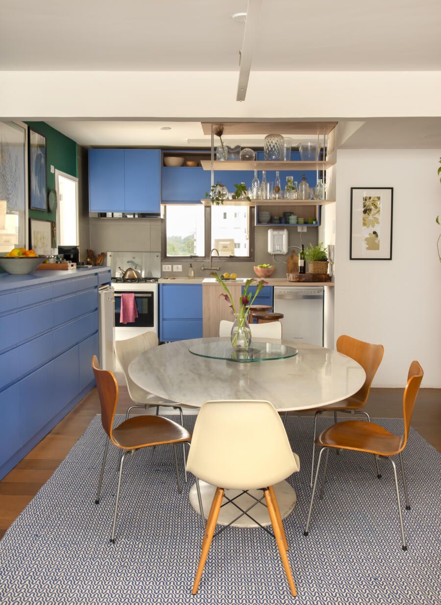 Localizado no Morumbi, em São Paulo, o apartamento da fotógrafa Cacá Bratke surpreende já de início: com uma sala e cozinha integradas, a cor predominante é o azul. São vários os tons distribuídos pelas paredes e móveis, inspiração que veio através de uma revista de arquitetura, na qual se apaixonou pelo estilo de cozinhas azuis.