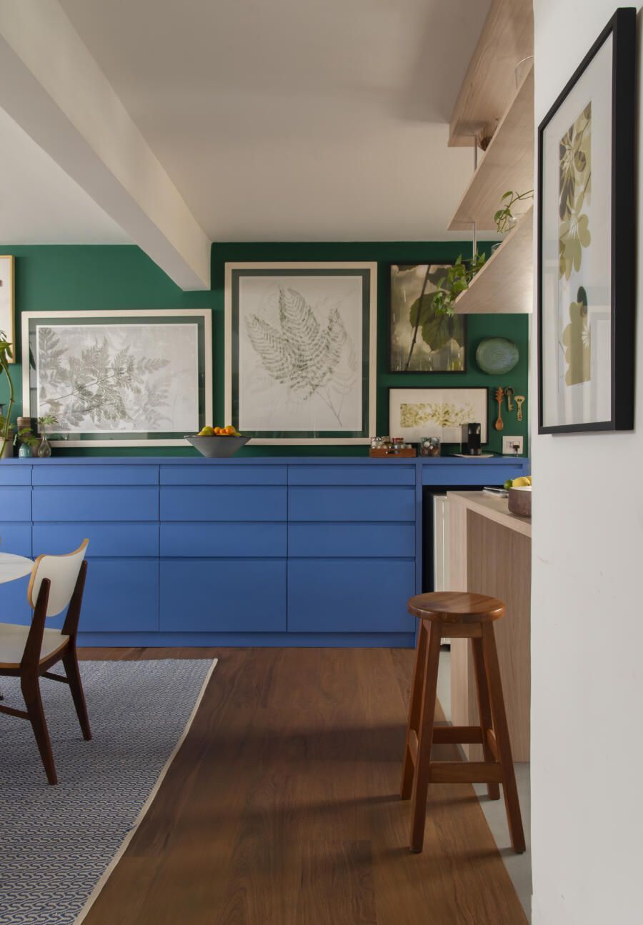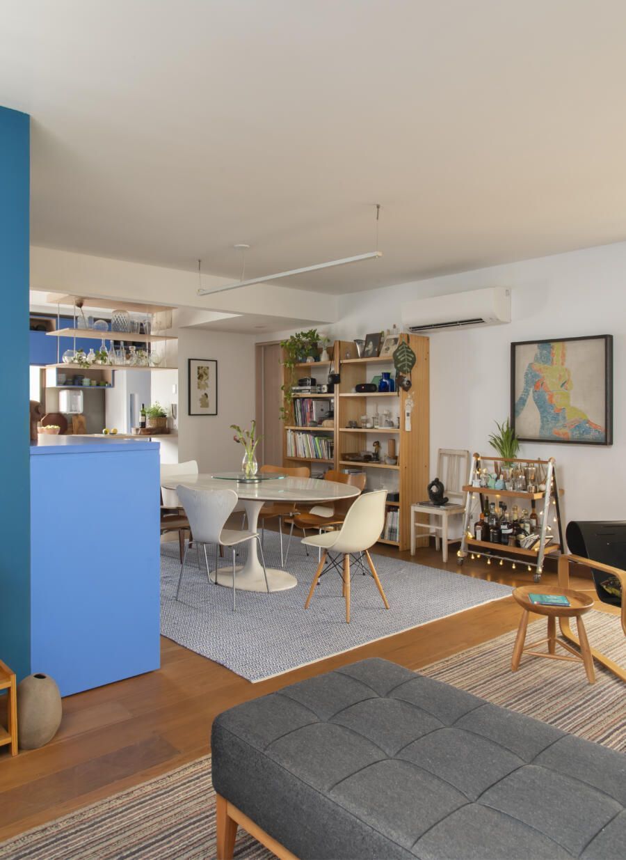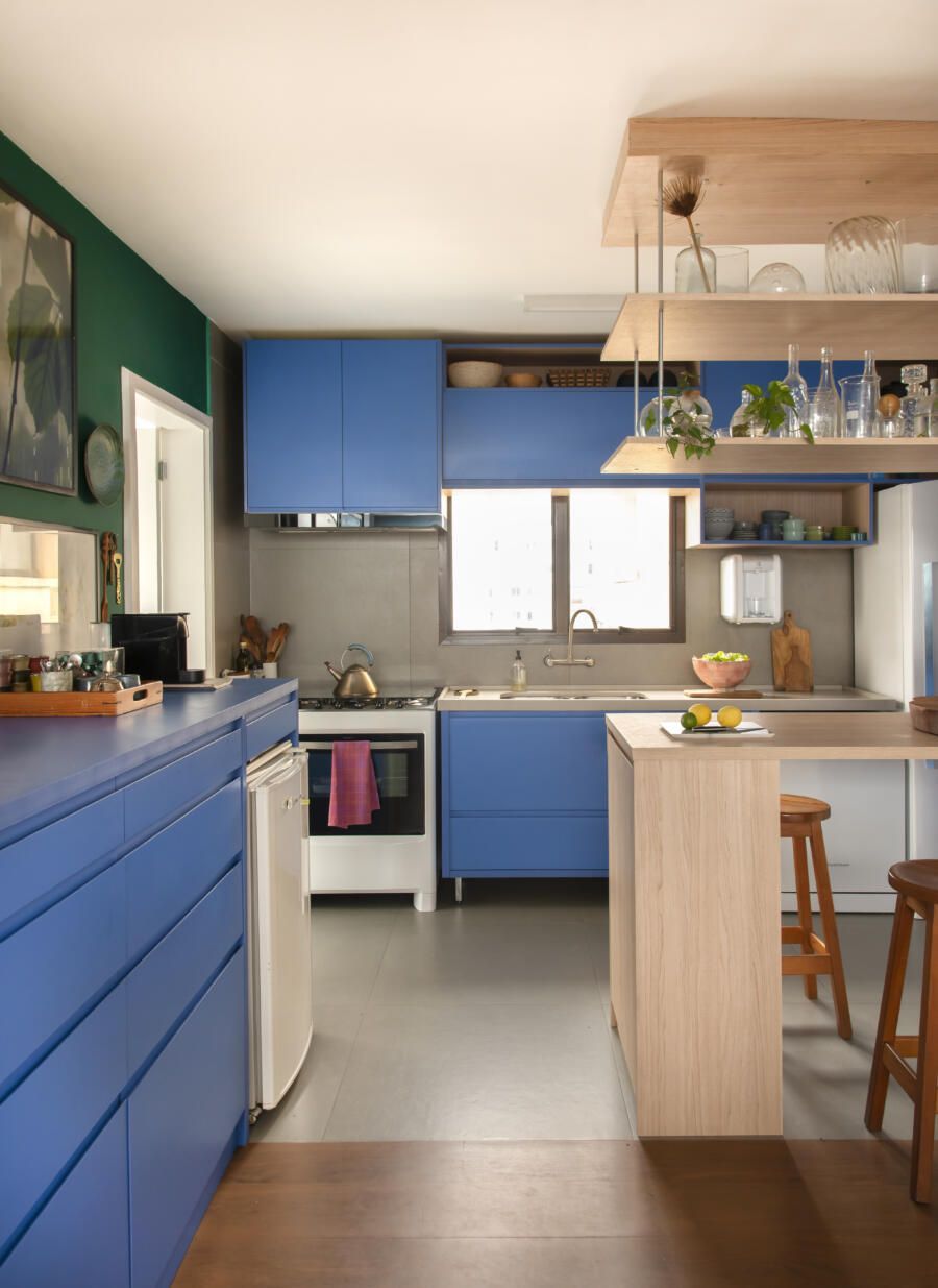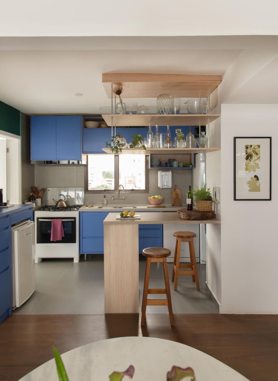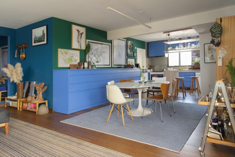 Localizado no Morumbi, em São Paulo, o apartamento da fotógrafa Cacá Bratke surpreende já de início: com uma sala e cozinha integradas, a cor predominante é o azul. São vários os tons distribuídos pelas paredes e móveis, inspiração que veio através de uma revista de arquitetura, na qual se apaixonou pelo estilo de cozinhas azuis.