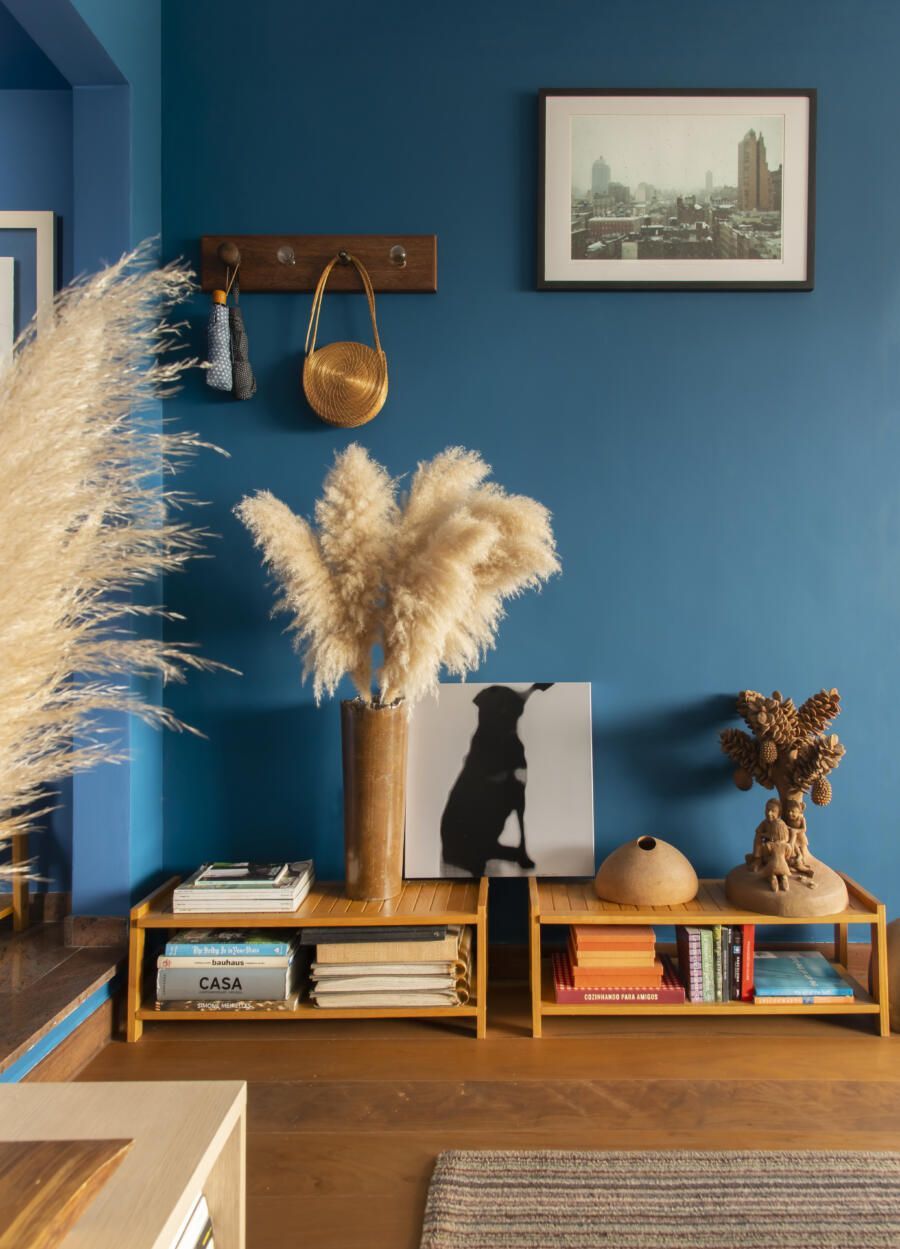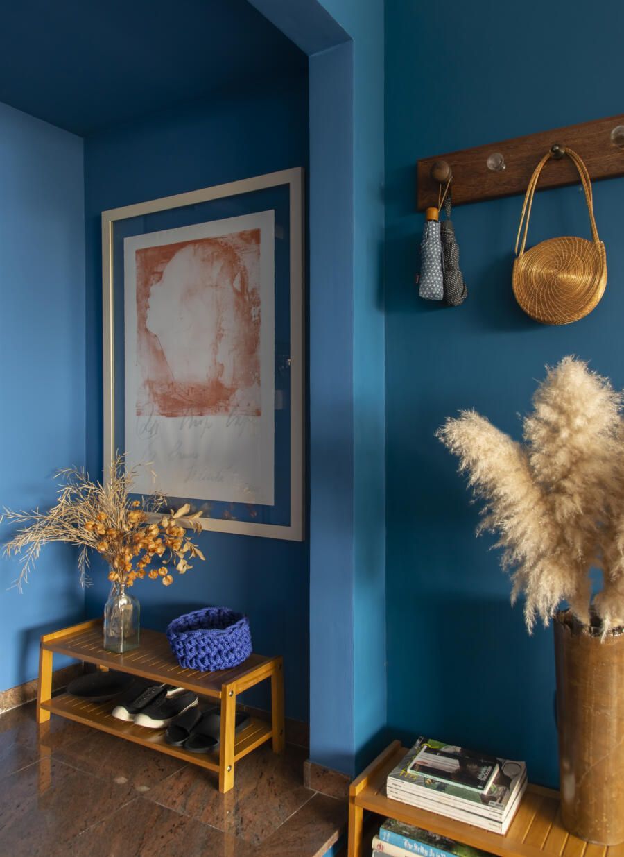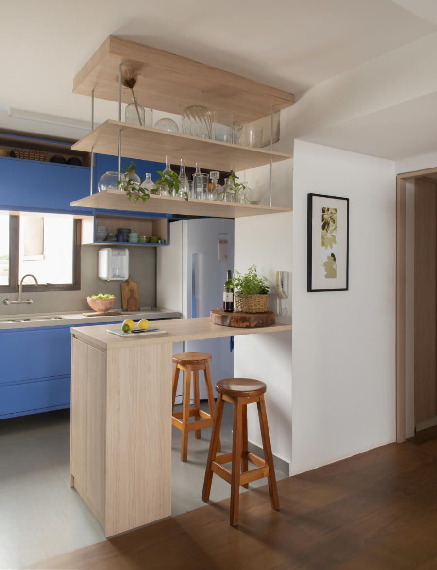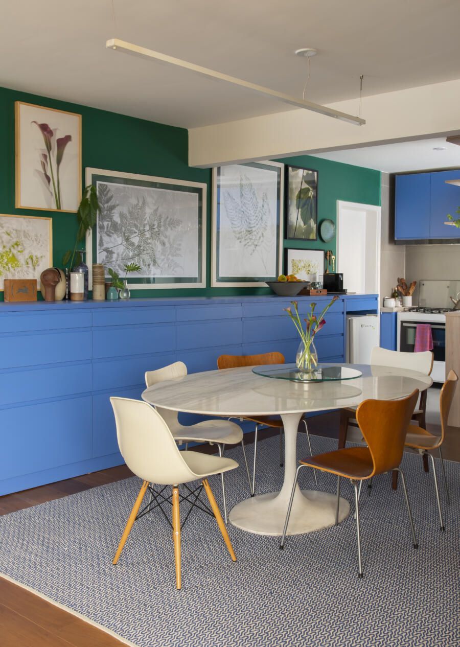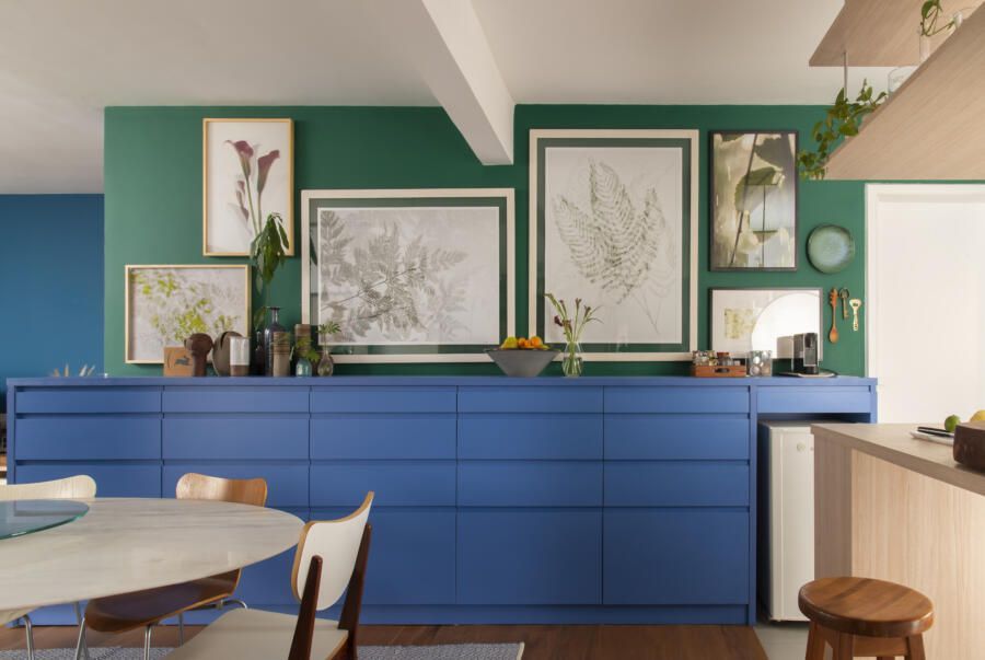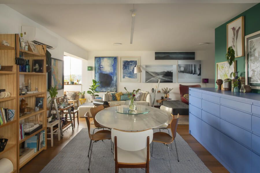 Localizado no Morumbi, em São Paulo, o apartamento da fotógrafa Cacá Bratke surpreende já de início: com uma sala e cozinha integradas, a cor predominante é o azul. São vários os tons distribuídos pelas paredes e móveis, inspiração que veio através de uma revista de arquitetura, na qual se apaixonou pelo estilo de cozinhas azuis.