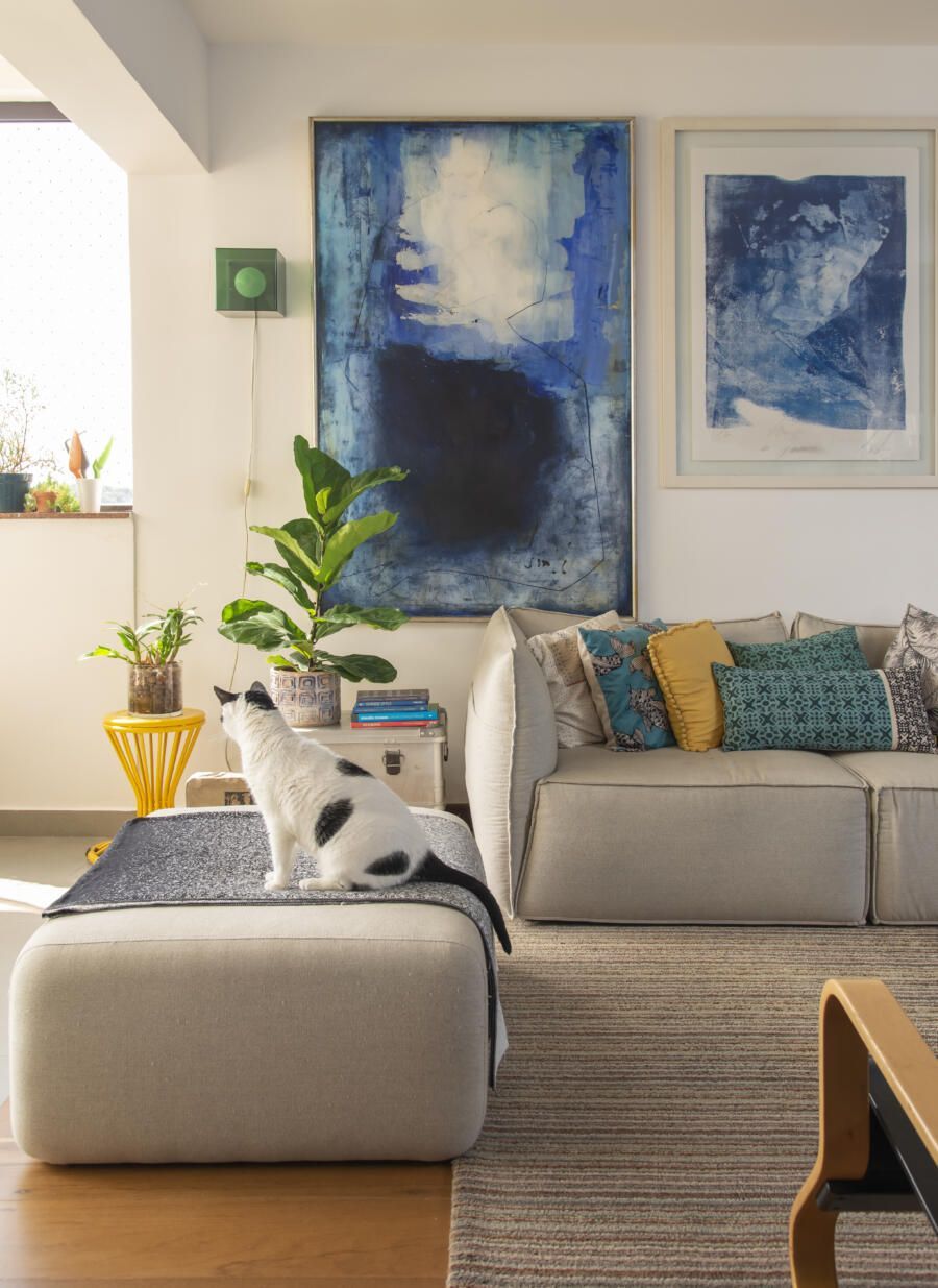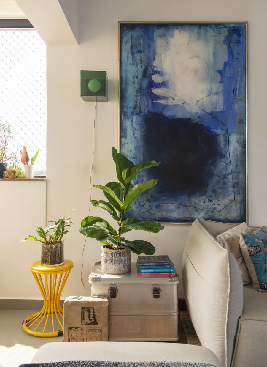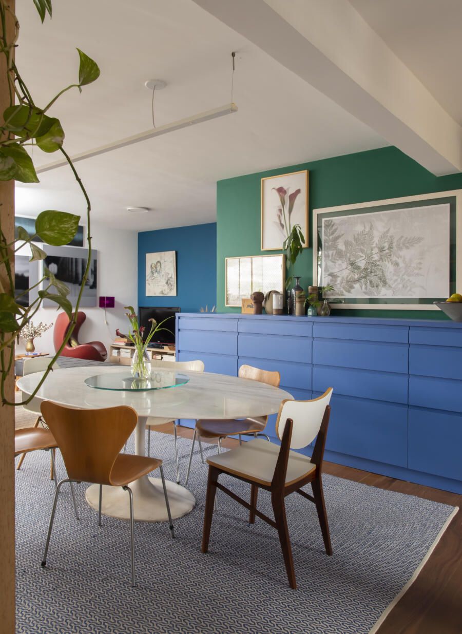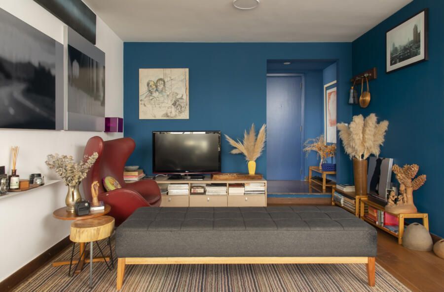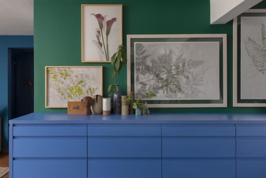 Localizado no Morumbi, em São Paulo, o apartamento da fotógrafa Cacá Bratke surpreende já de início: com uma sala e cozinha integradas, a cor predominante é o azul. São vários os tons distribuídos pelas paredes e móveis, inspiração que veio através de uma revista de arquitetura, na qual se apaixonou pelo estilo de cozinhas azuis.