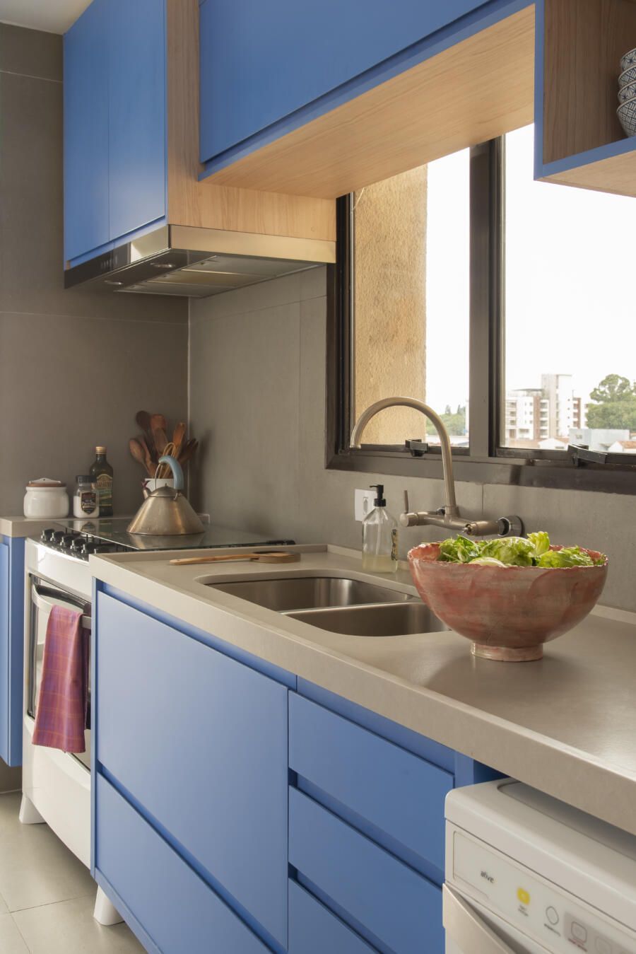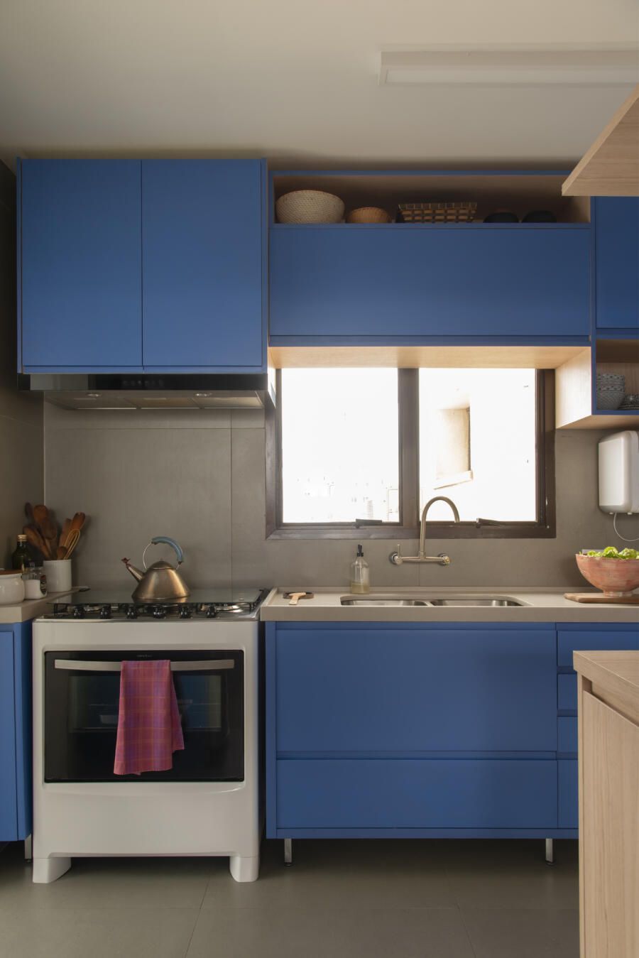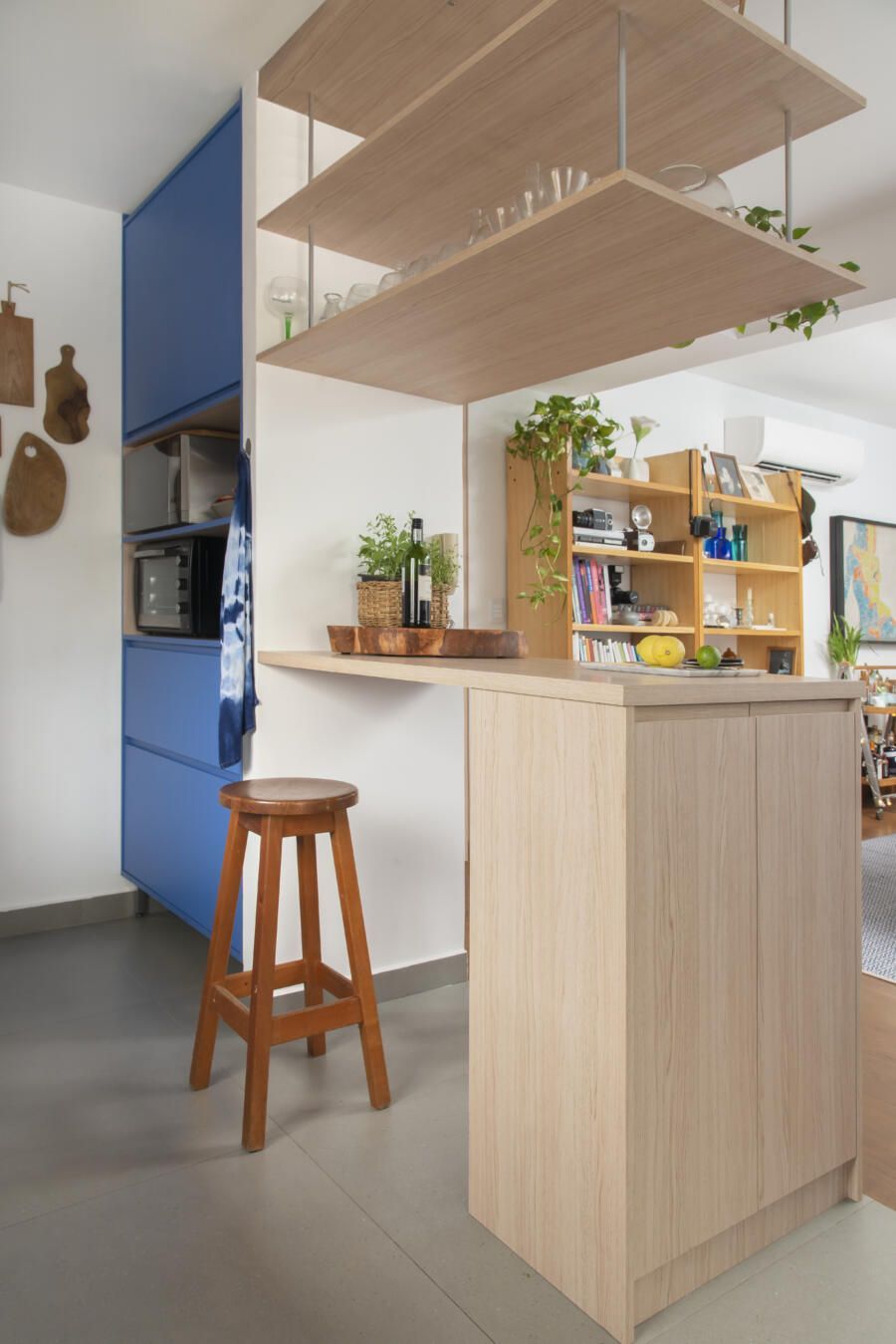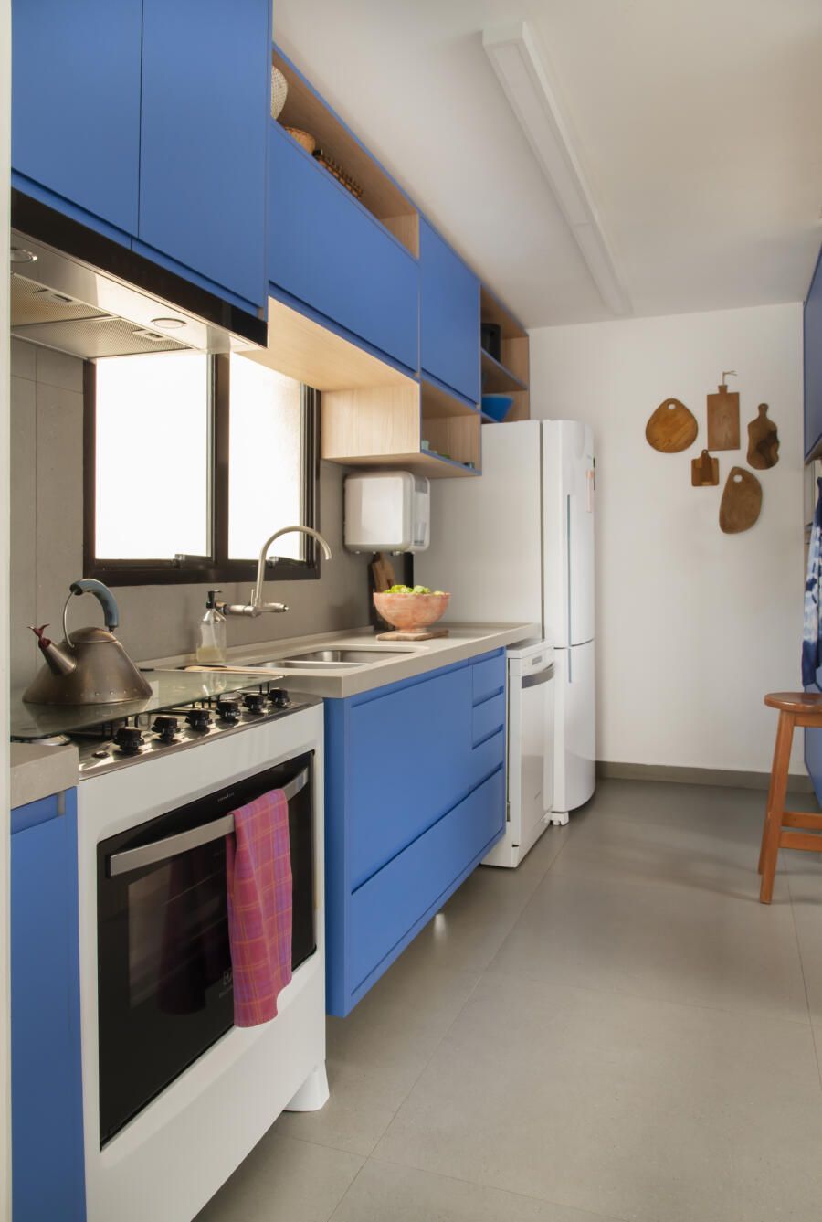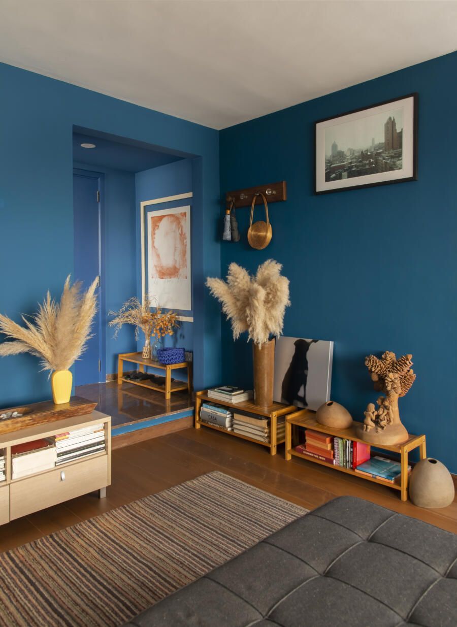 Localizado no Morumbi, em São Paulo, o apartamento da fotógrafa Cacá Bratke surpreende já de início: com uma sala e cozinha integradas, a cor predominante é o azul. São vários os tons distribuídos pelas paredes e móveis, inspiração que veio através de uma revista de arquitetura, na qual se apaixonou pelo estilo de cozinhas azuis.